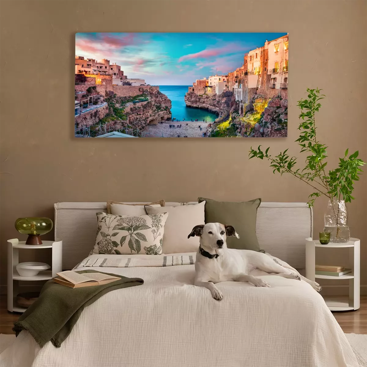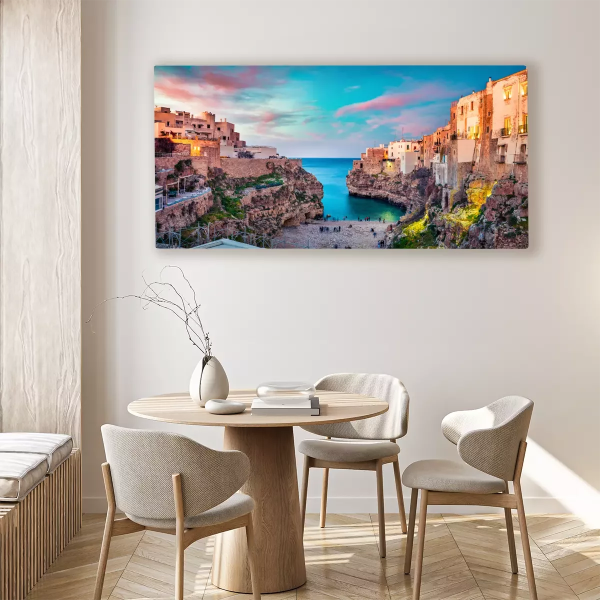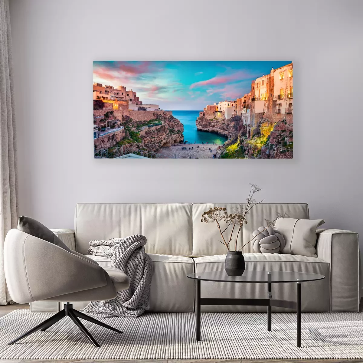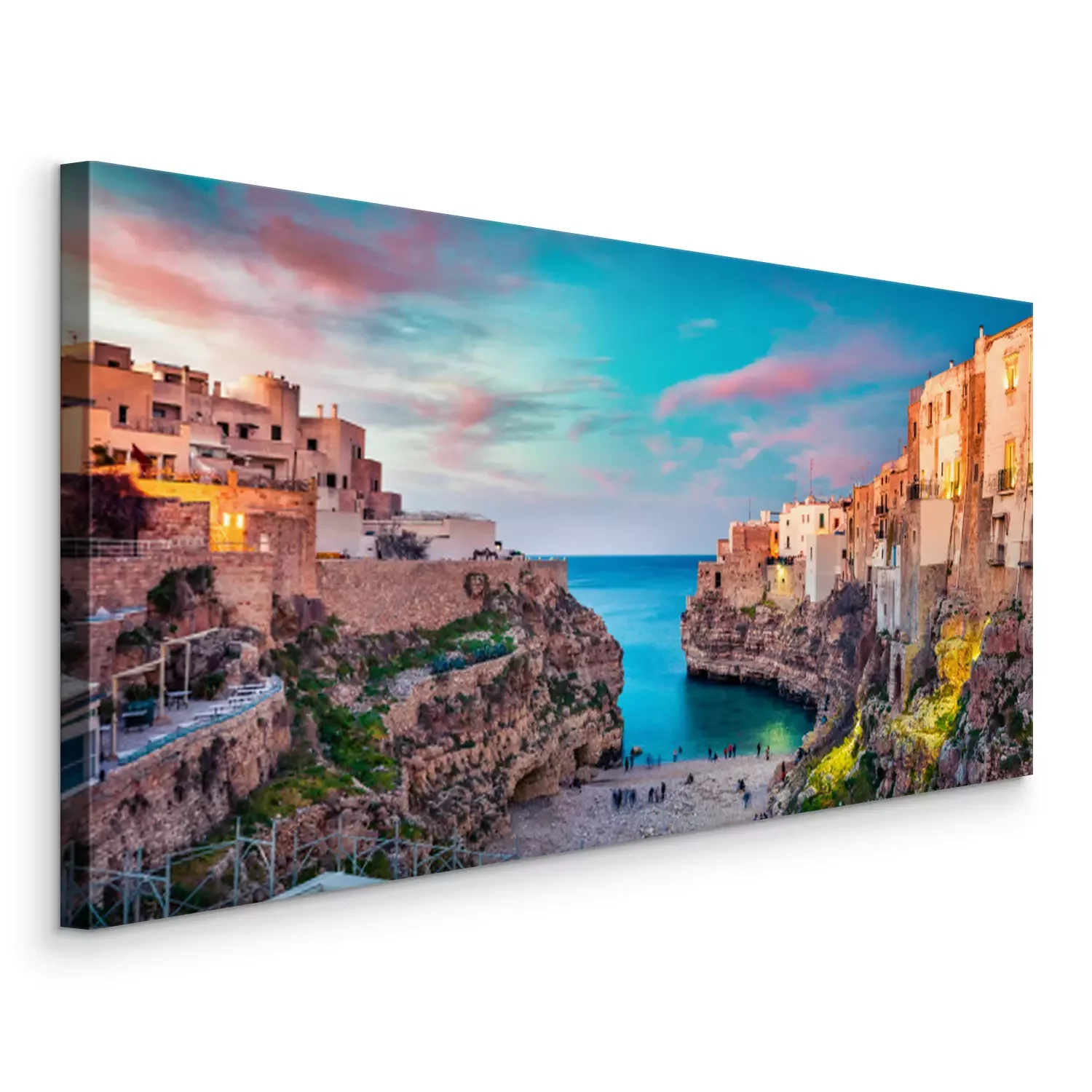 Canvas: Spectacular spring cityscape of Polignano a Mare town, Puglia region, Italy, Europe. Colorful evening seascape of Adriatic sea. Traveling concept background..