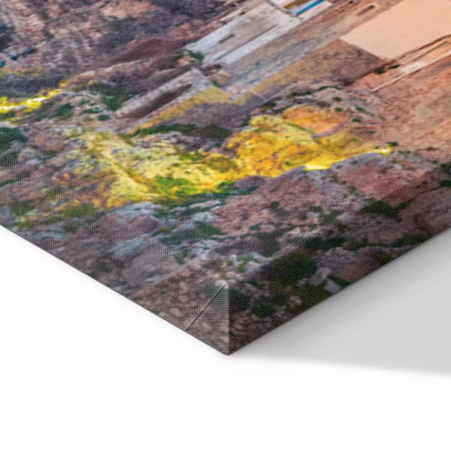 De print wordt aangebracht op hoogwaardig canvas dat op een schildersweefgetouw (spieraam) wordt gespannen. Omdat de print de zijranden bedekt, hoeft het ontwerp niet met een extra kader te worden omlijst. Wij raden ook composities aan die uit meerdere foto's bestaan en zo een coherente compositie vormen.