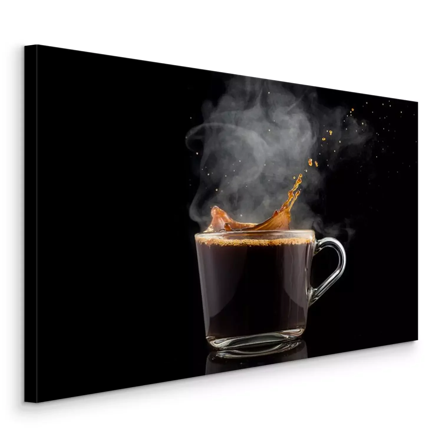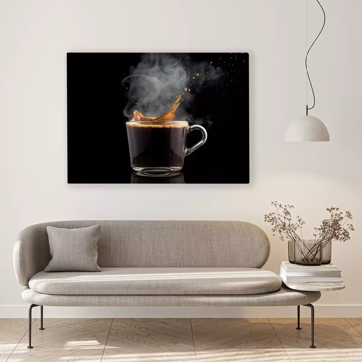 Canvas: splash and splatter from a piece of sugar in a mug with coffee on a black background