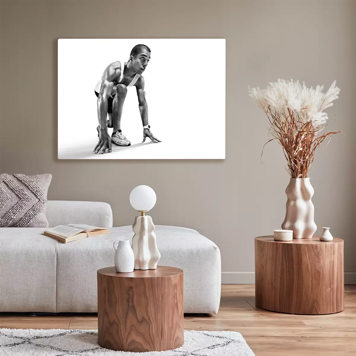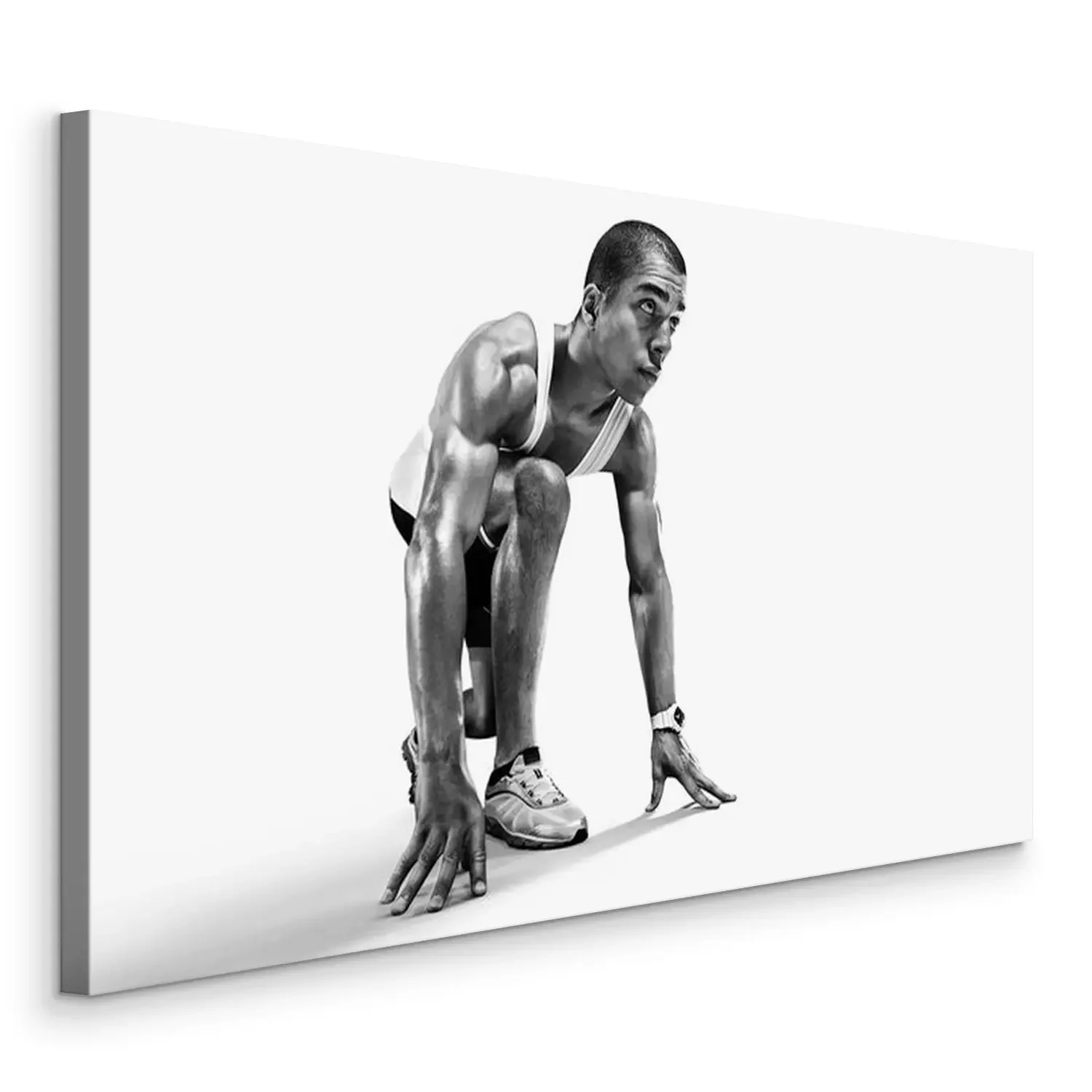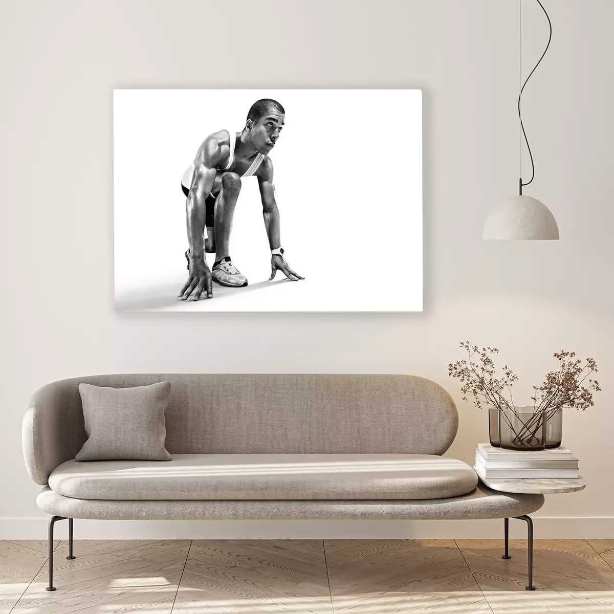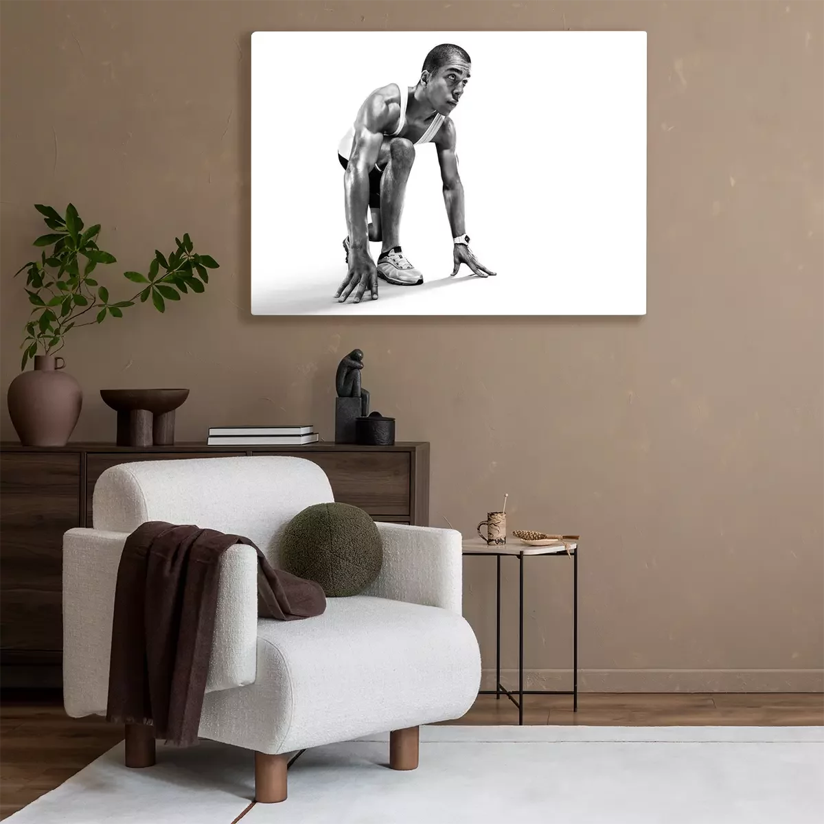 Canvas: Sports background. Runner on the start. Black and white image isolated on white.