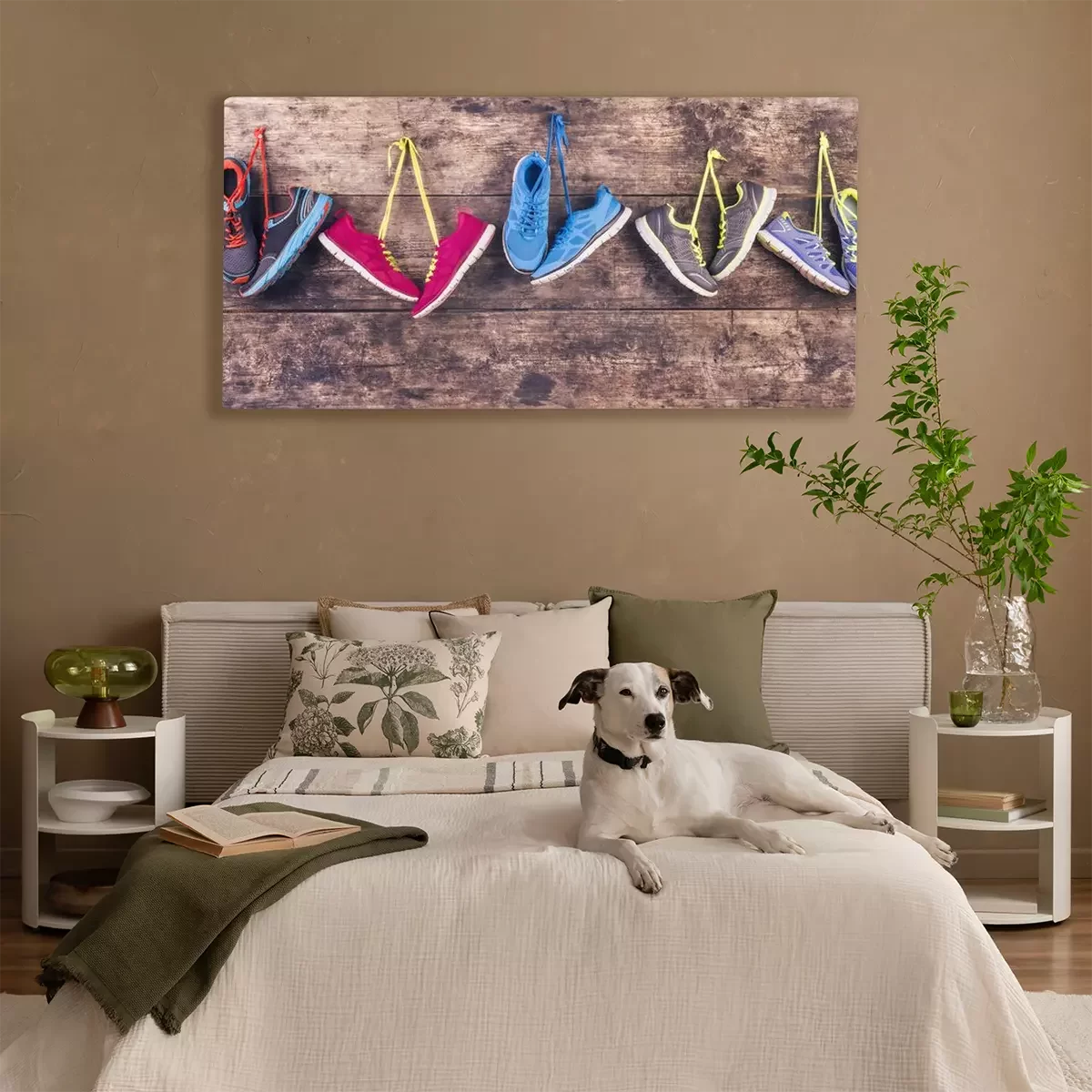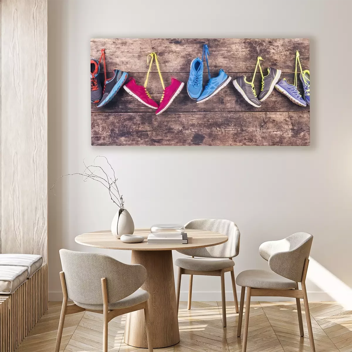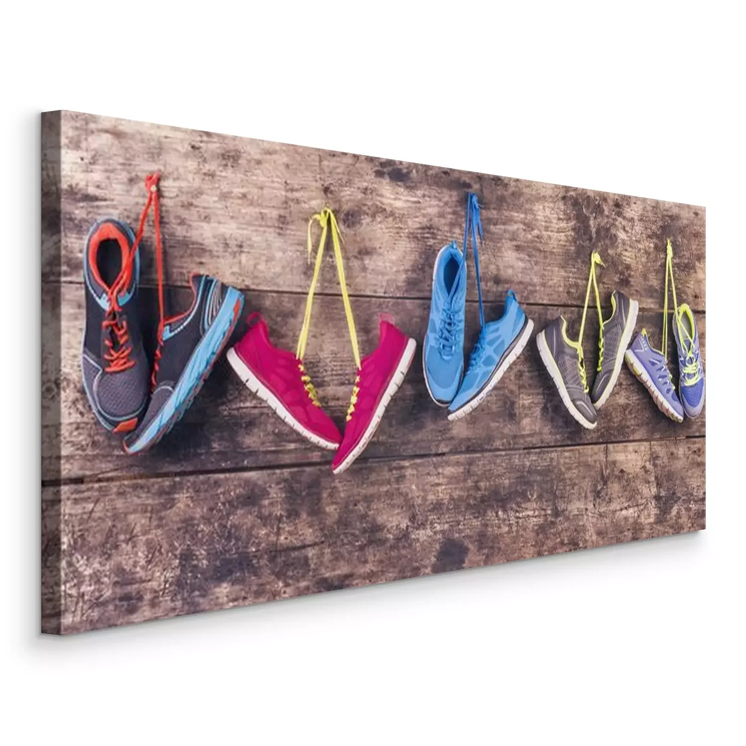 Canvas: Sportschoenen hangen aan een spijker op een houten hek achtergrond