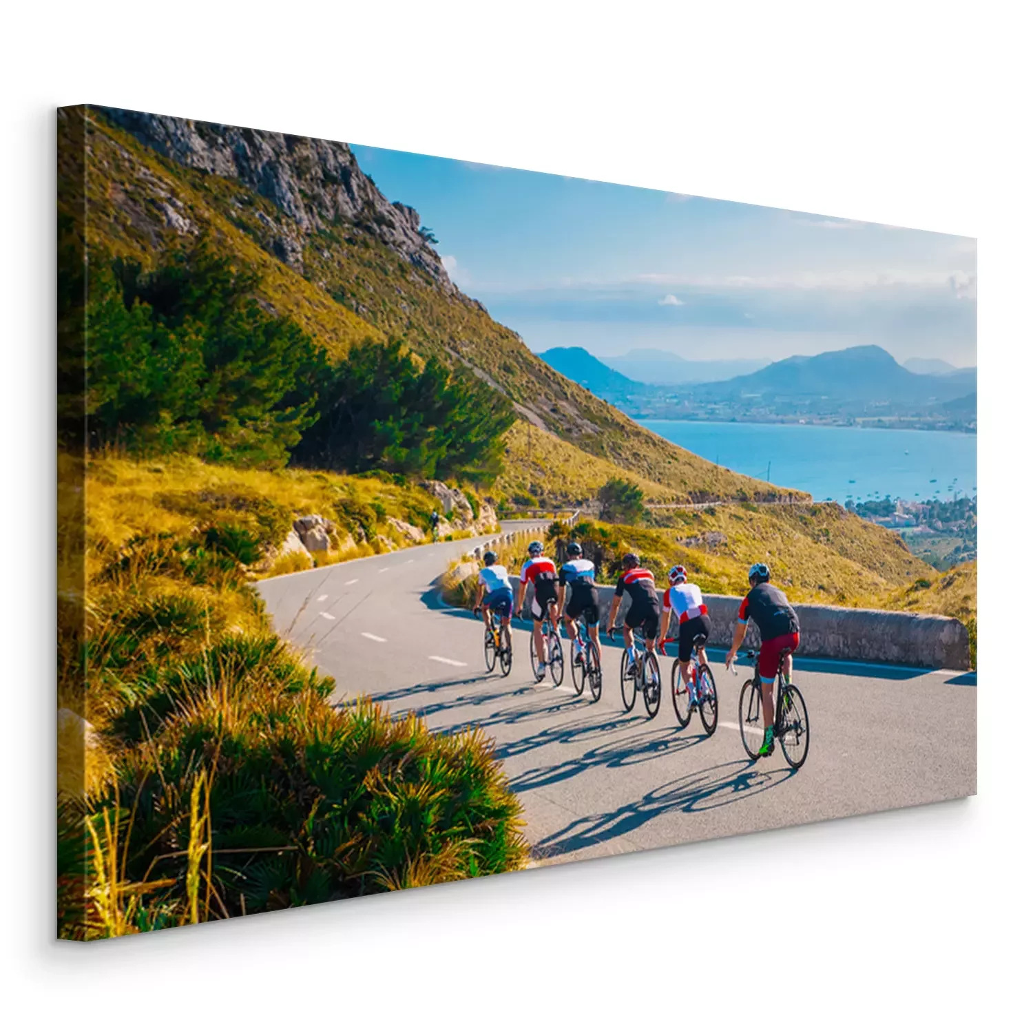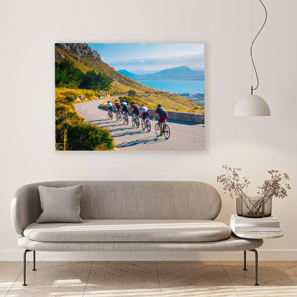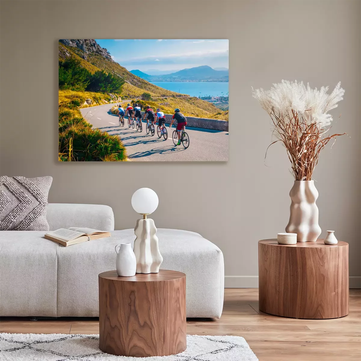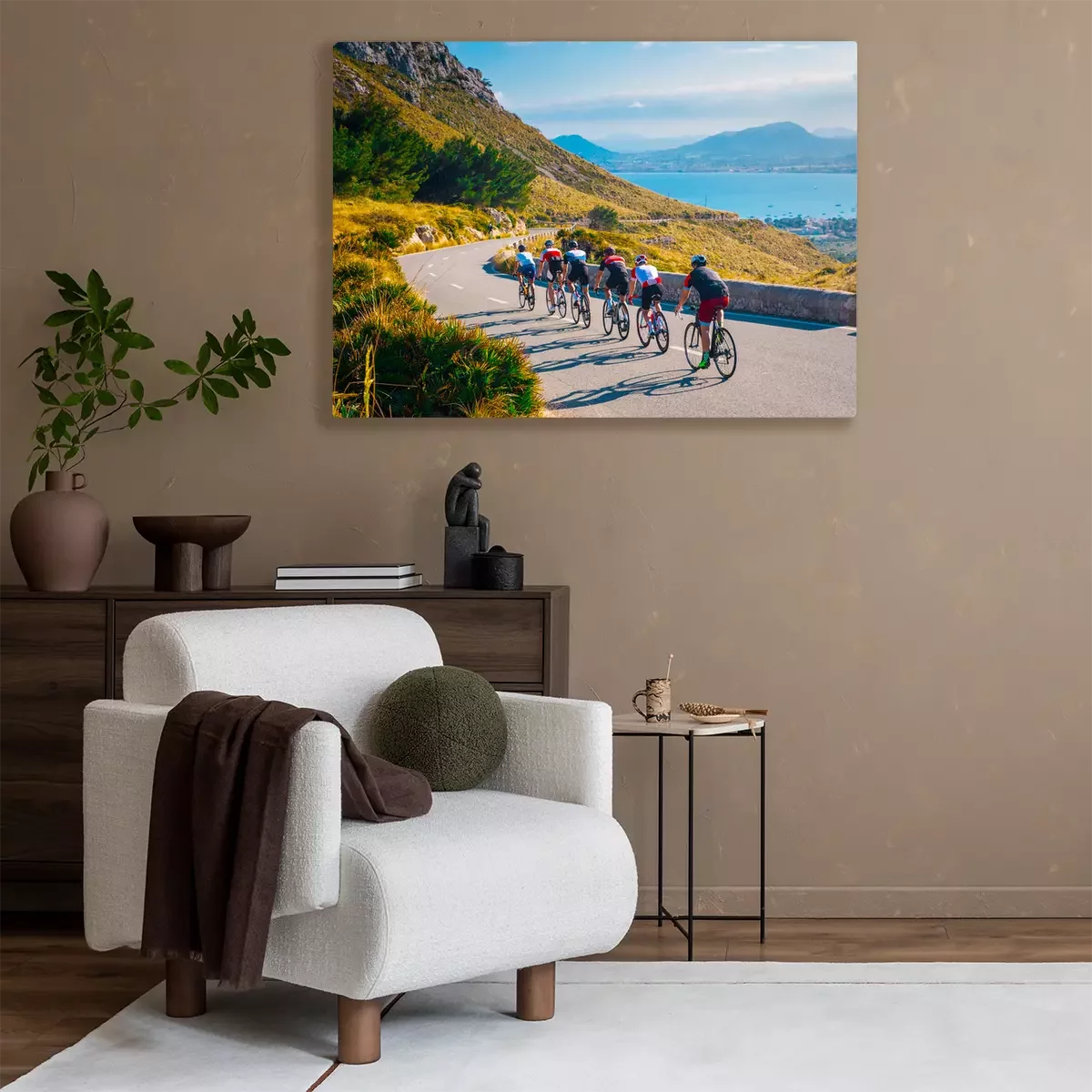 Canvas: Sporty friends on bicycle on sunset light in beautiful nature by the sea. Road cycling on the coast. Sport in Nature background. Teamwork concept photo