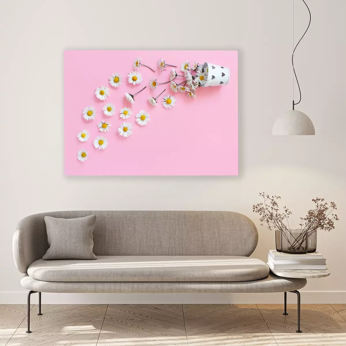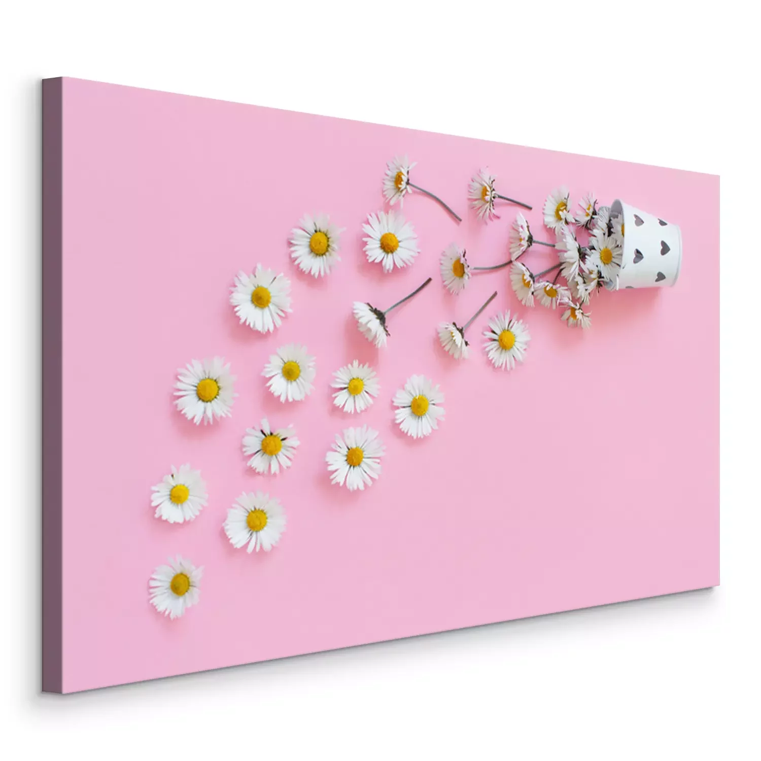 Canvas: Spring composition with white daisies falling from a bucket