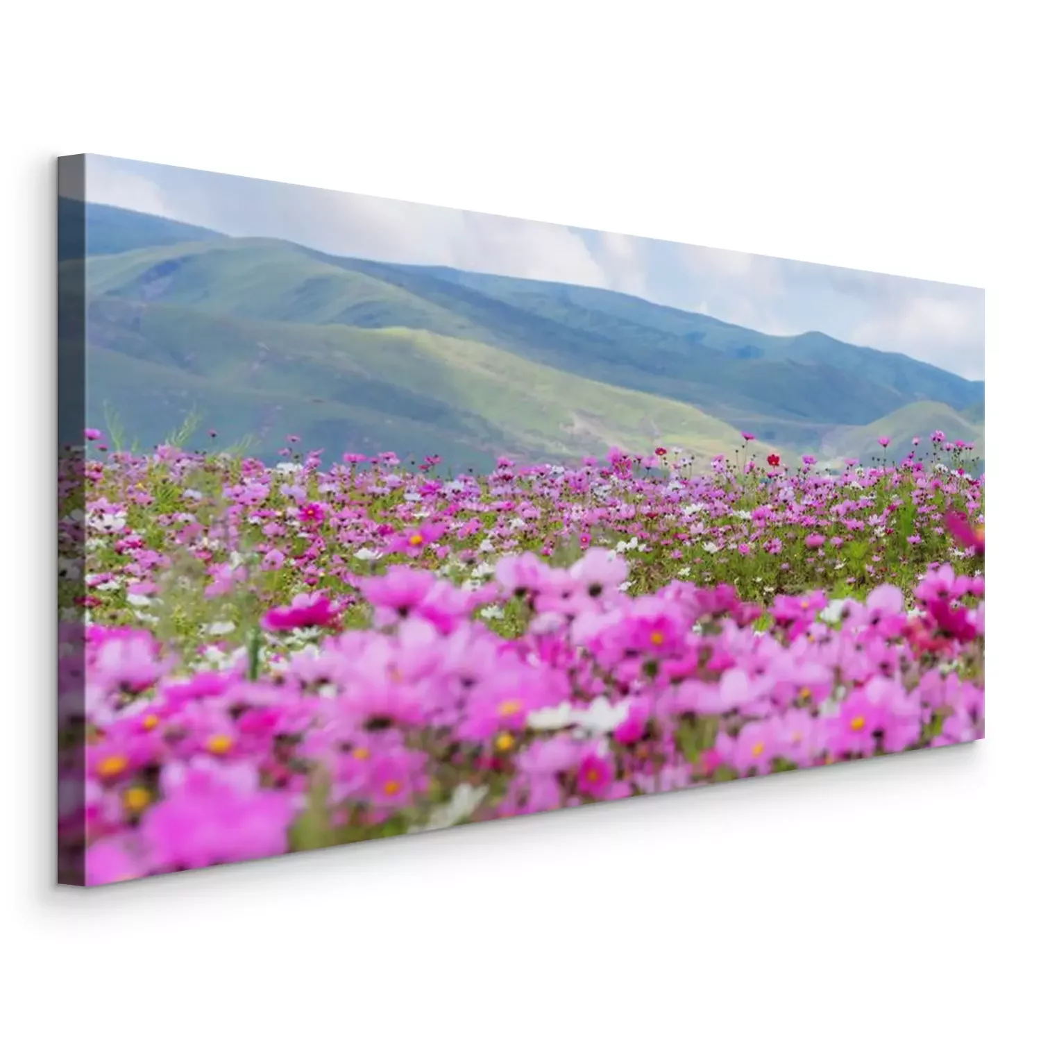 Canvas Spring landscape. Field of pink flowers with green hill in spring