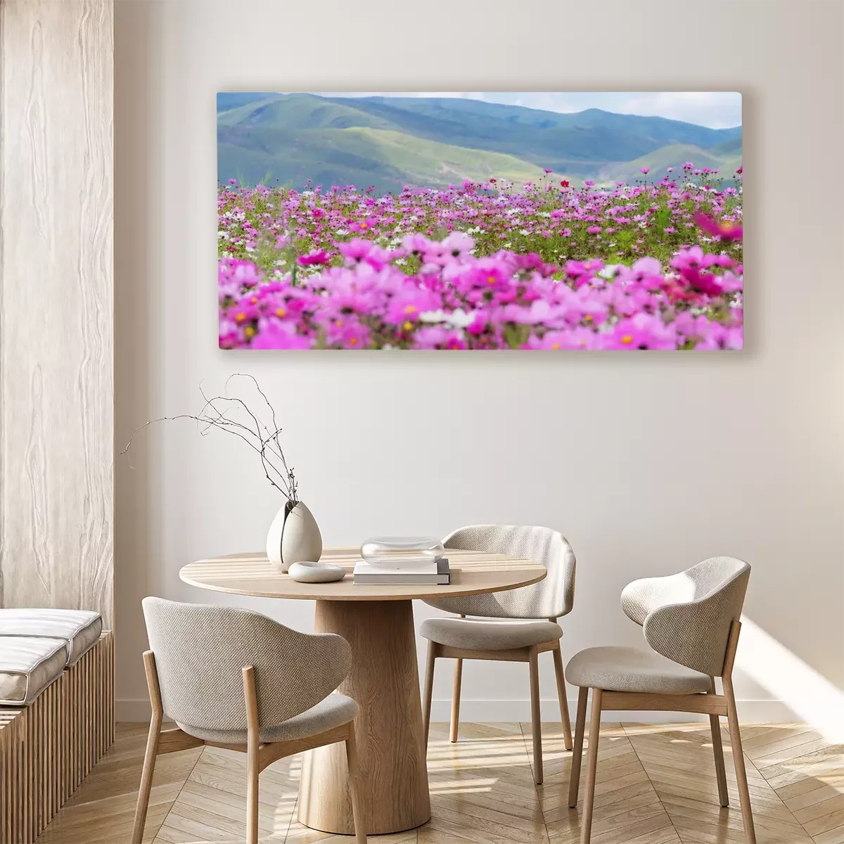 Canvas: Spring landscape. Field of pink flowers with green hill in spring