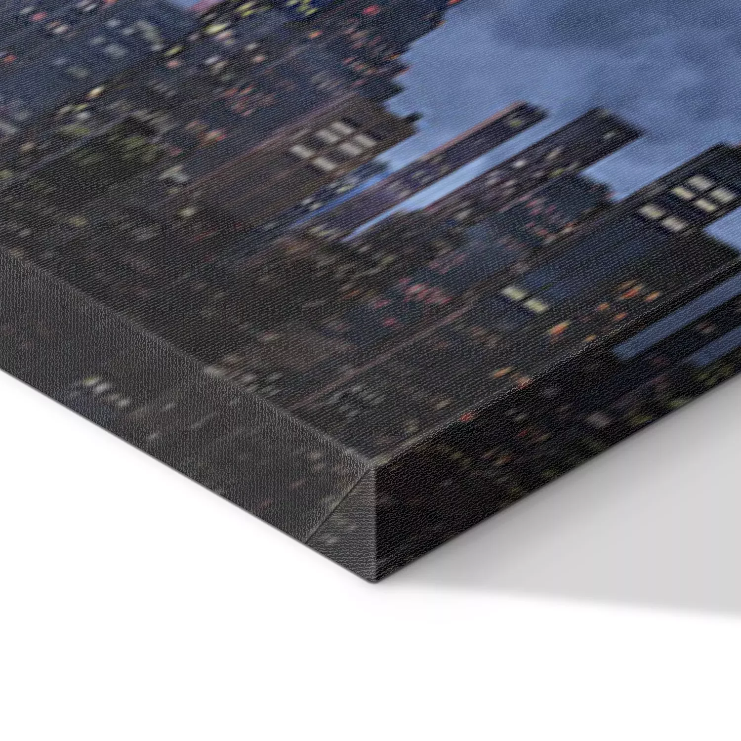 De print wordt aangebracht op hoogwaardig canvas dat op een schildersweefgetouw (spieraam) wordt gespannen. Omdat de print de zijranden bedekt, hoeft het ontwerp niet met een extra kader te worden omlijst. Wij raden ook composities aan die uit meerdere foto's bestaan en zo een coherente compositie vormen.