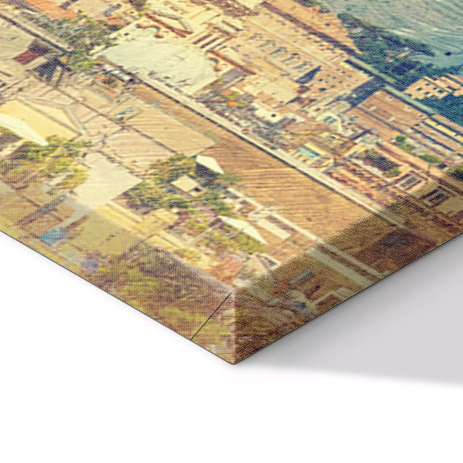 De print wordt aangebracht op hoogwaardig canvas dat op een schildersweefgetouw (spieraam) wordt gespannen. Omdat de print de zijranden bedekt, hoeft het ontwerp niet met een extra kader te worden omlijst. Wij raden ook composities aan die uit meerdere foto's bestaan en zo een coherente compositie vormen.