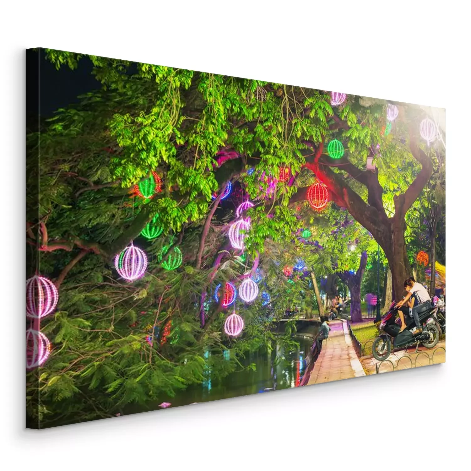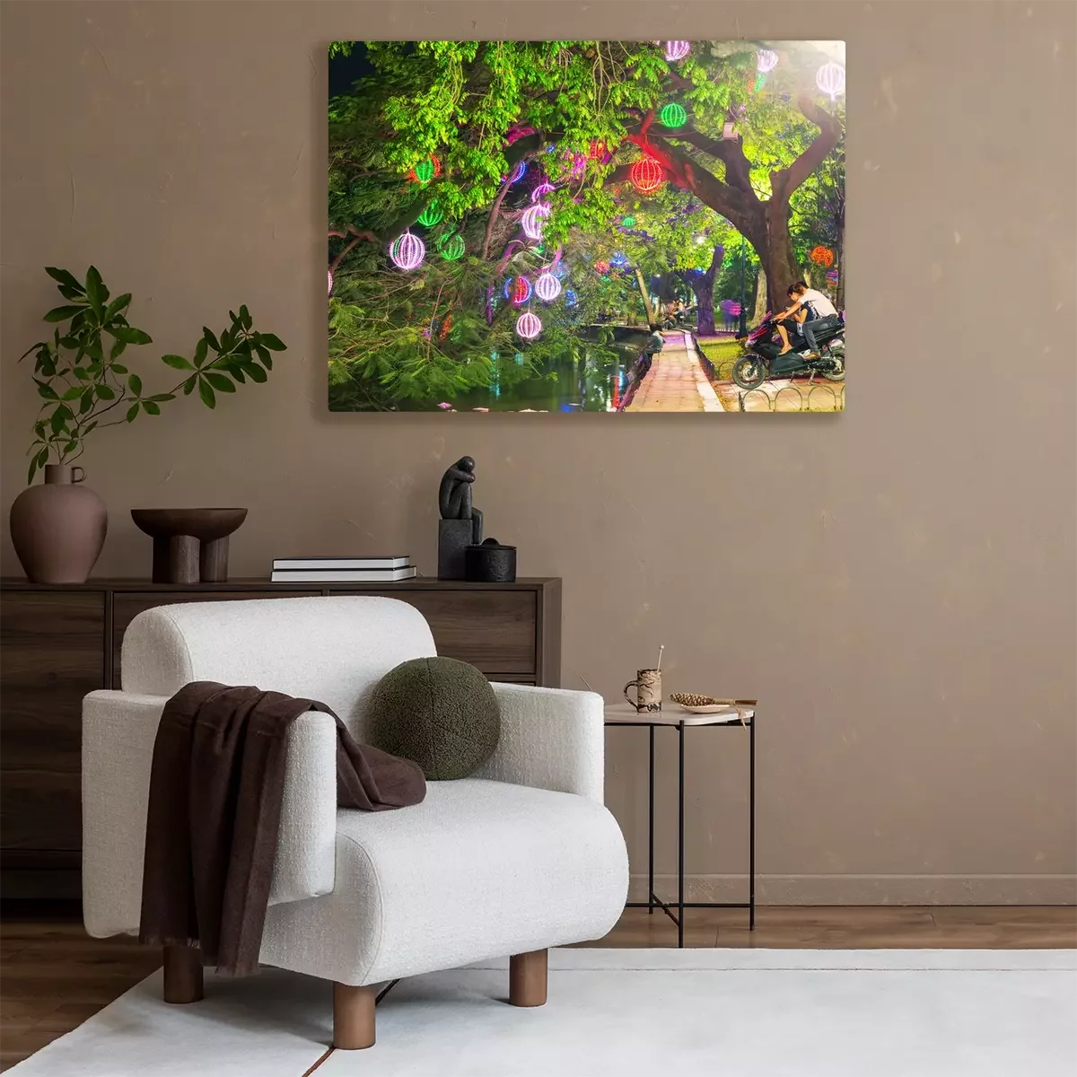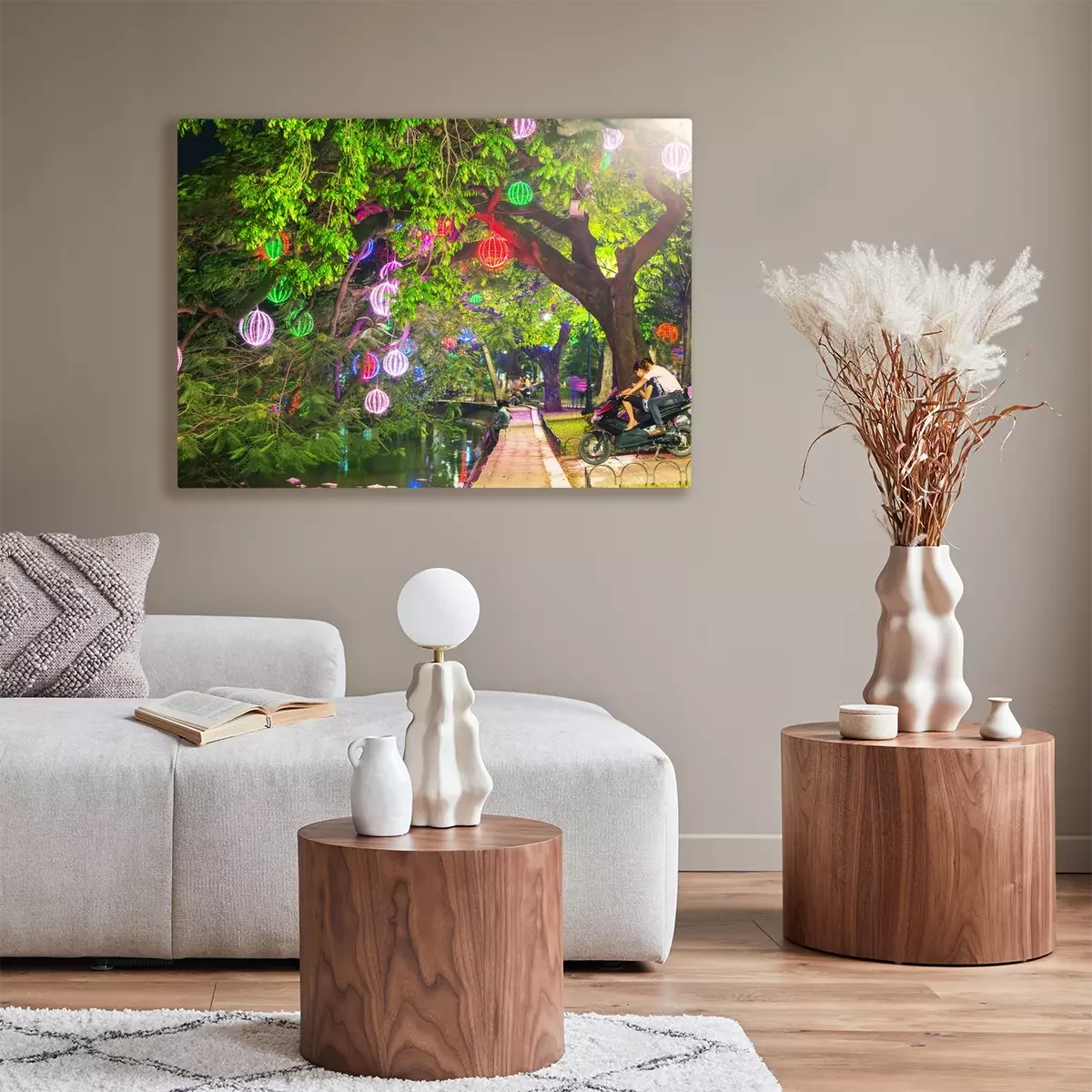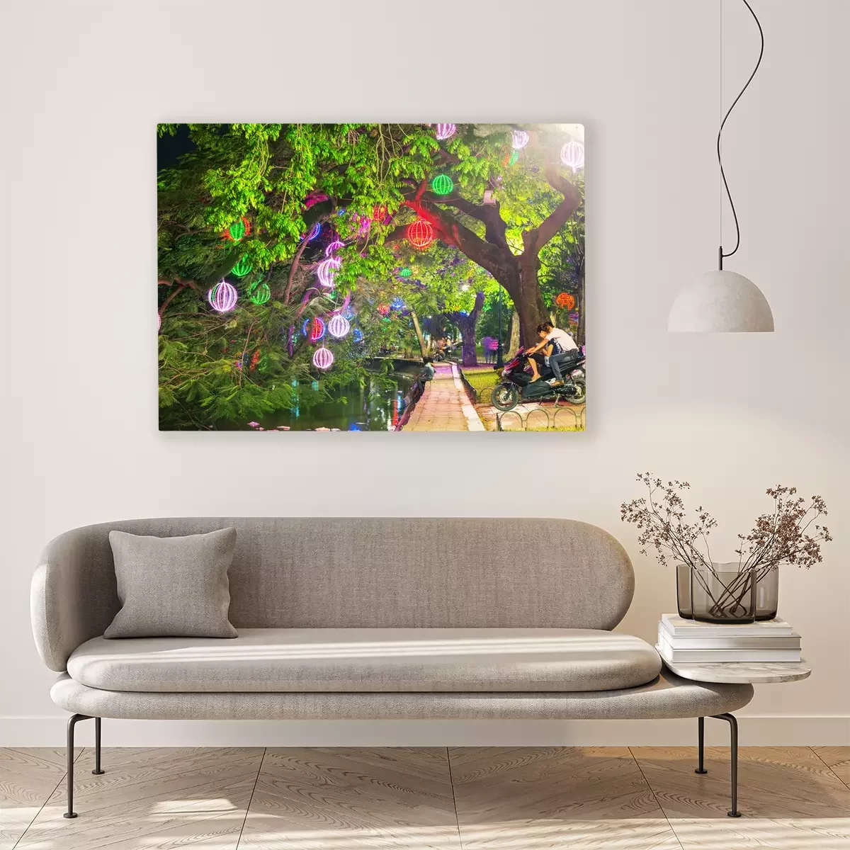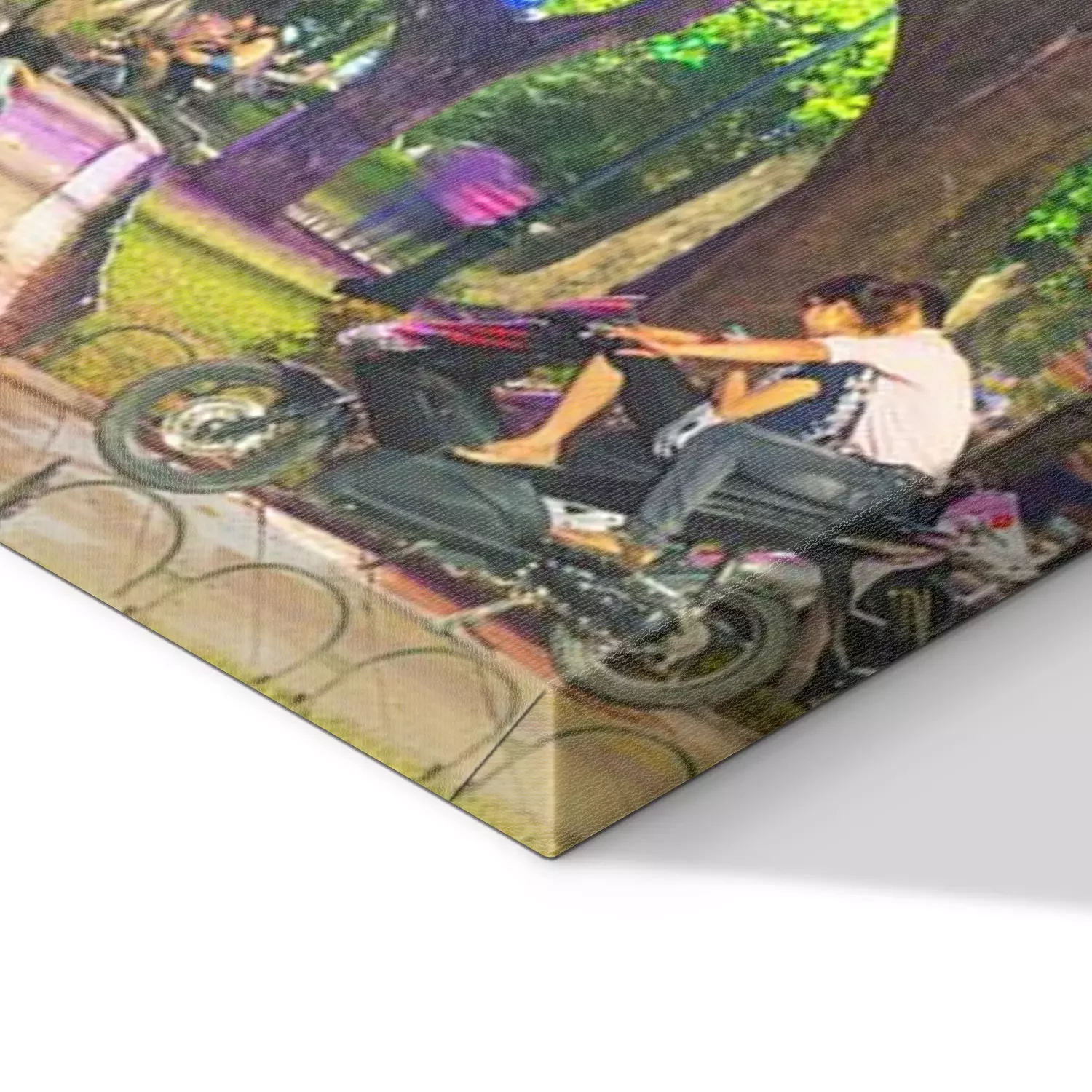 De print wordt aangebracht op hoogwaardig canvas dat op een schildersweefgetouw (spieraam) wordt gespannen. Omdat de print de zijranden bedekt, hoeft het ontwerp niet met een extra kader te worden omlijst. Wij raden ook composities aan die uit meerdere foto's bestaan en zo een coherente compositie vormen.