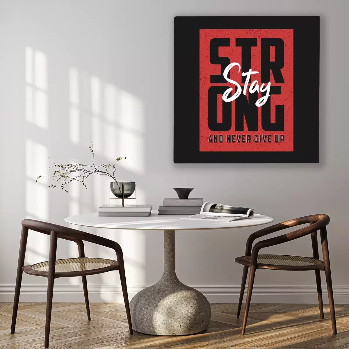 Canvas: Stay strong and never give up - motivational slogan for t-shirt design. Typography graphics for apparel, t shirt print. Vector illustration.