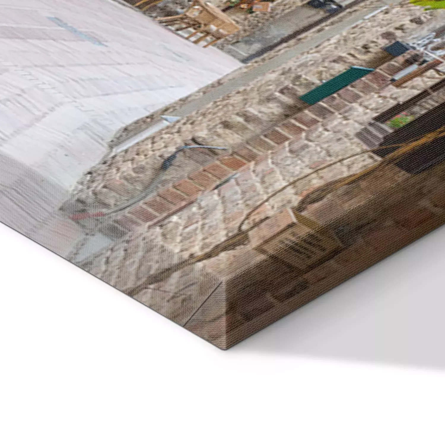 De print wordt aangebracht op hoogwaardig canvas dat op een schildersweefgetouw (spieraam) wordt gespannen. Omdat de print de zijranden bedekt, hoeft het ontwerp niet met een extra kader te worden omlijst. Wij raden ook composities aan die uit meerdere foto's bestaan en zo een coherente compositie vormen.