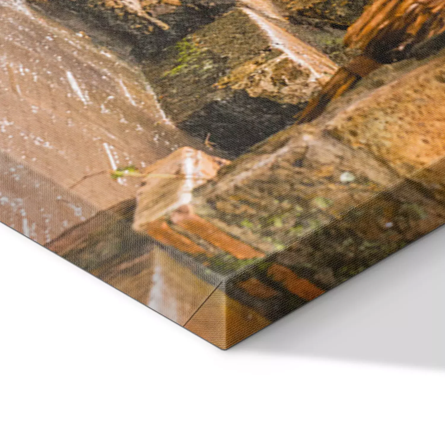 De print wordt aangebracht op hoogwaardig canvas dat op een schildersweefgetouw (spieraam) wordt gespannen. Omdat de print de zijranden bedekt, hoeft het ontwerp niet met een extra kader te worden omlijst. Wij raden ook composities aan die uit meerdere foto's bestaan en zo een coherente compositie vormen.