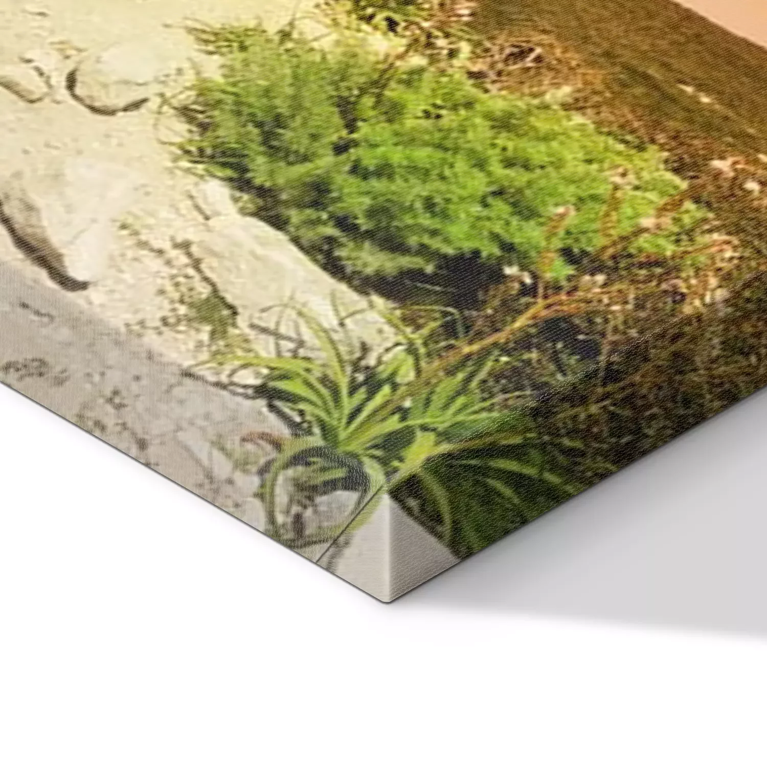 De print wordt aangebracht op hoogwaardig canvas dat op een schildersweefgetouw (spieraam) wordt gespannen. Omdat de print de zijranden bedekt, hoeft het ontwerp niet met een extra kader te worden omlijst. Wij raden ook composities aan die uit meerdere foto's bestaan en zo een coherente compositie vormen.
