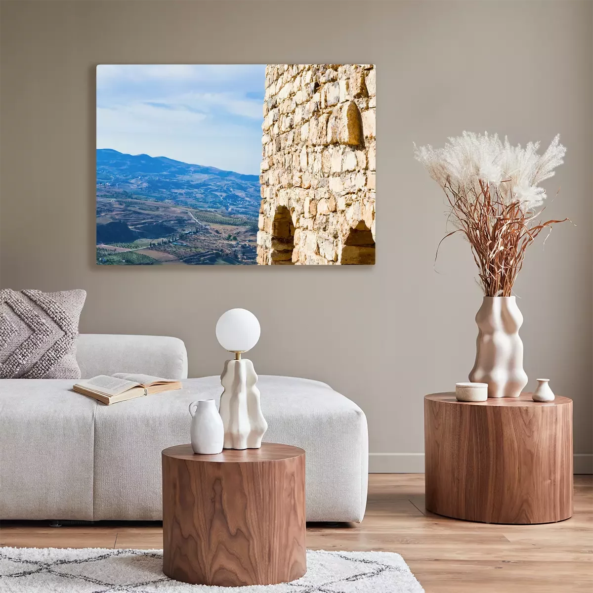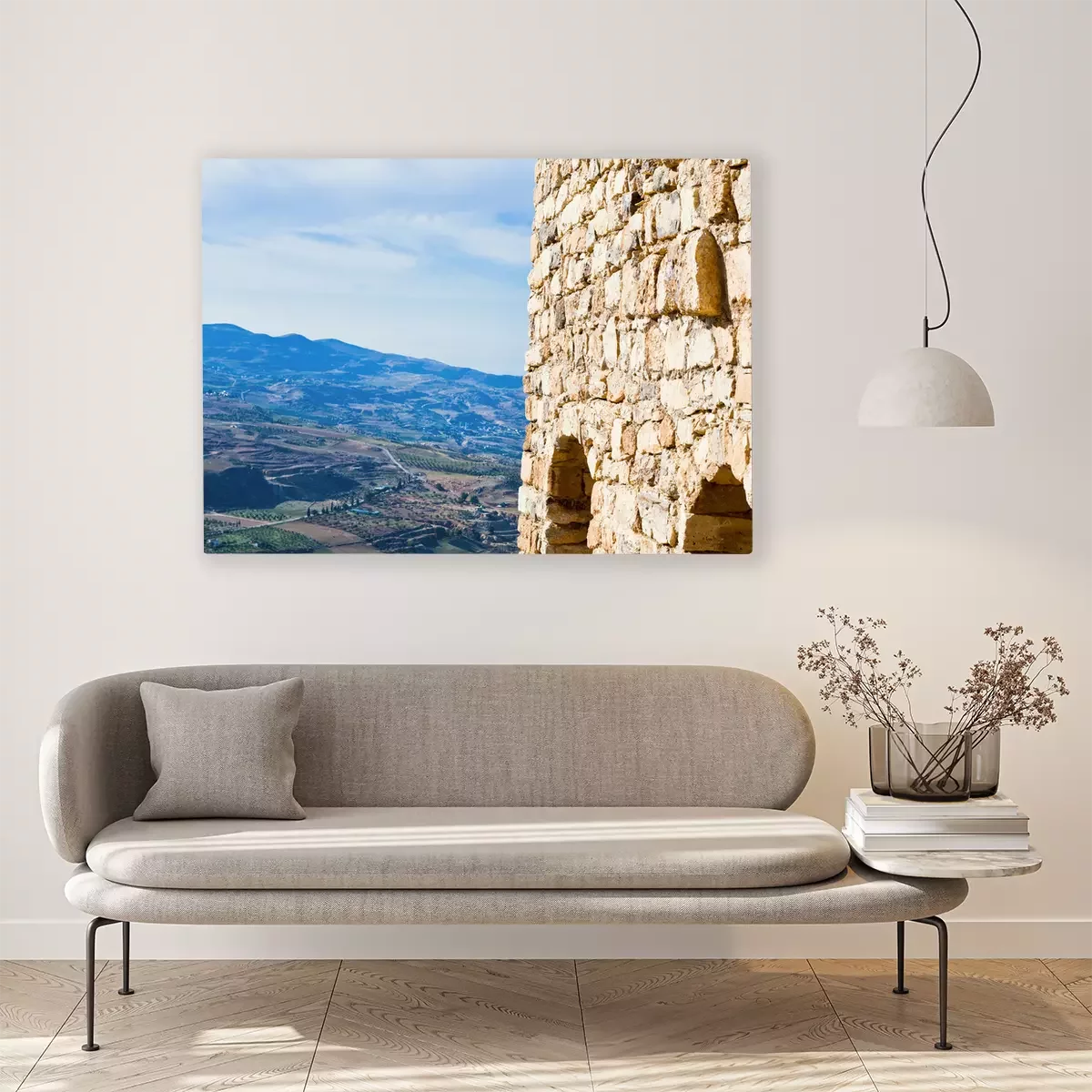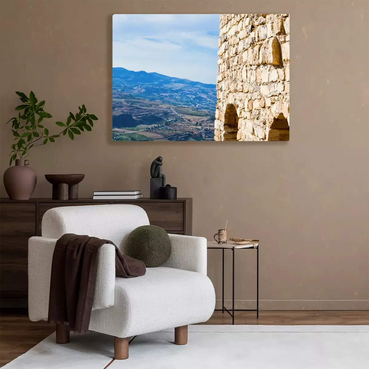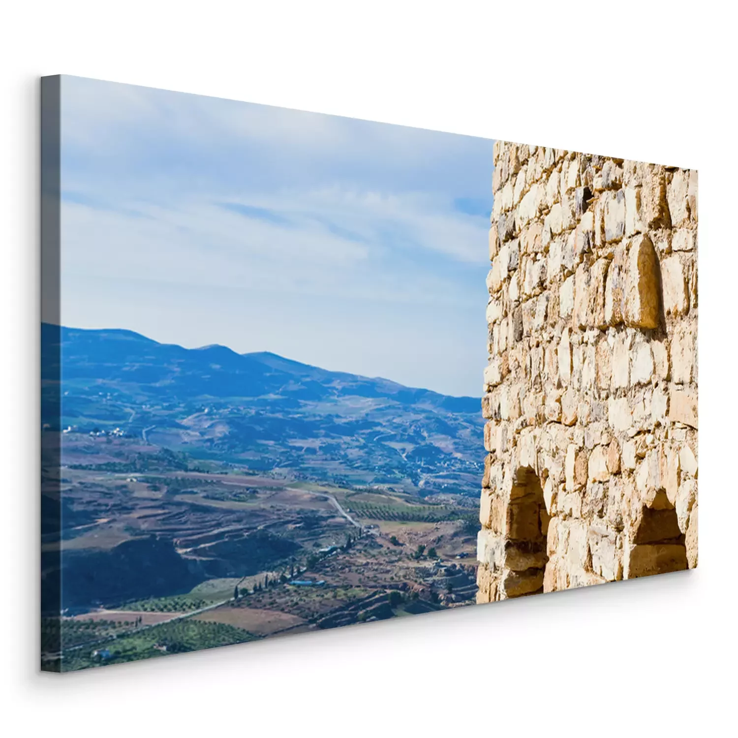 Canvas: stenen muur van Kerak kasteel en uitzicht op bergen vallei