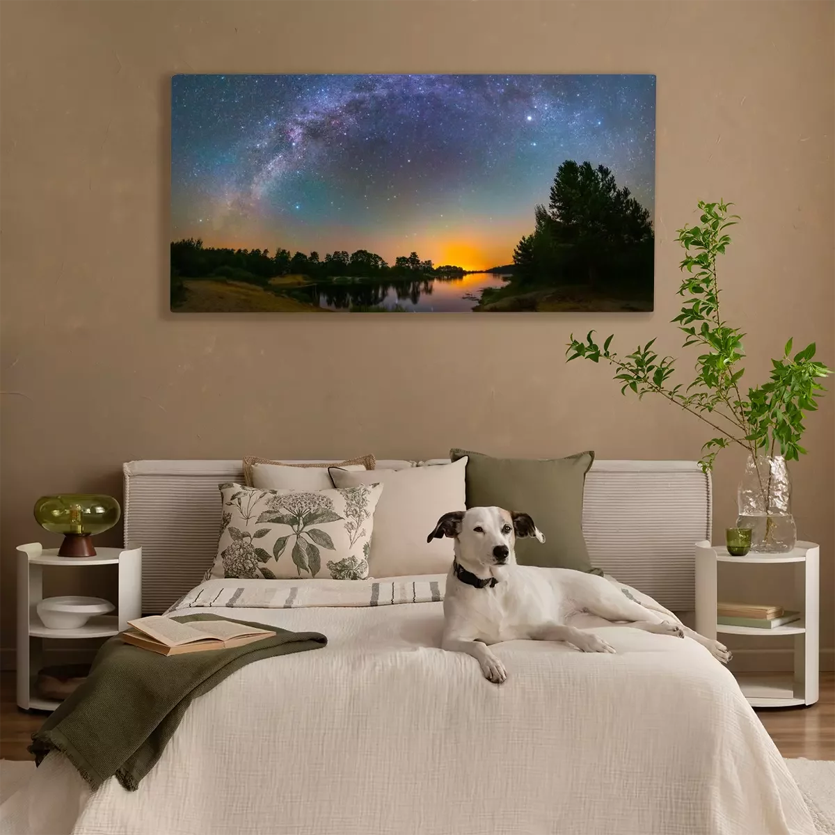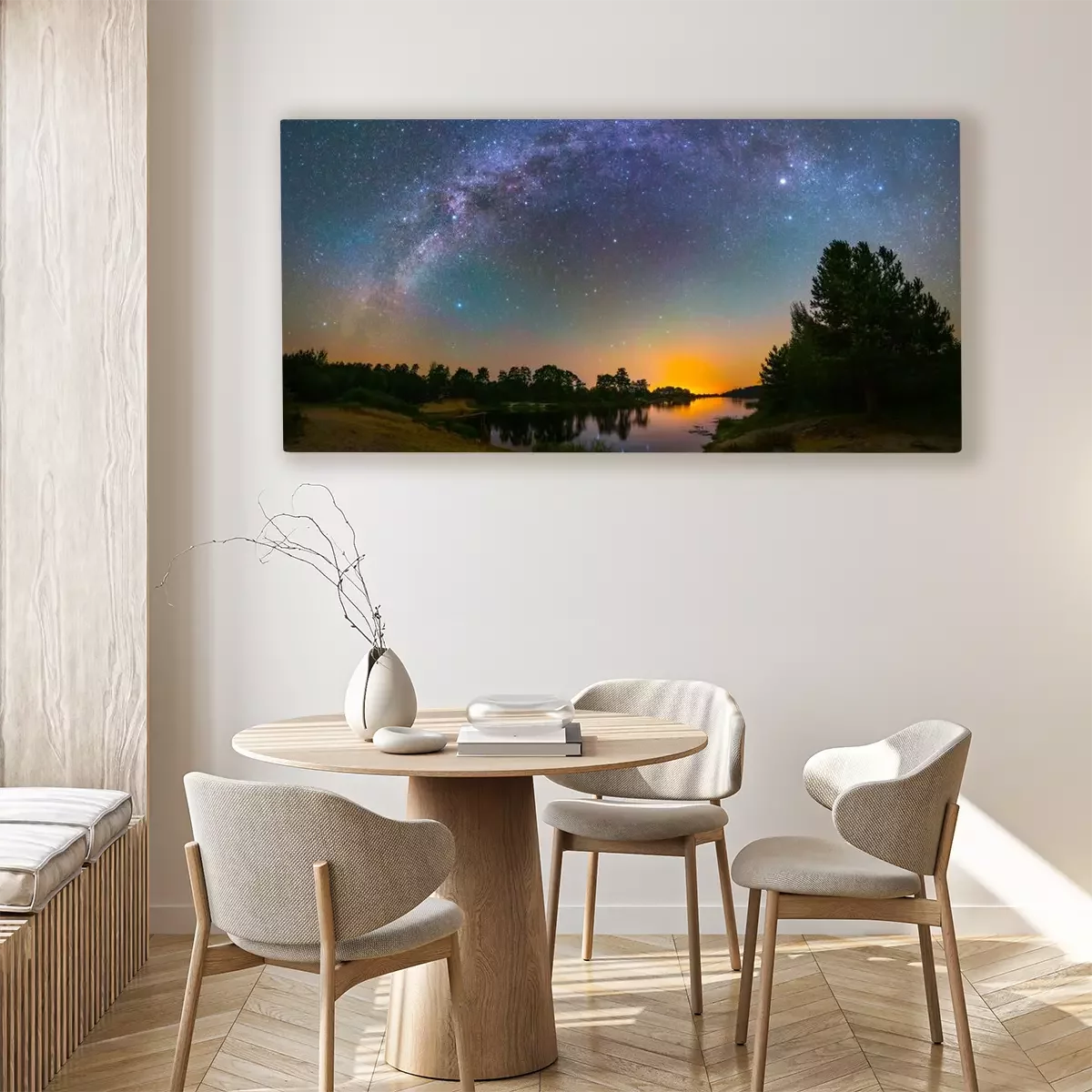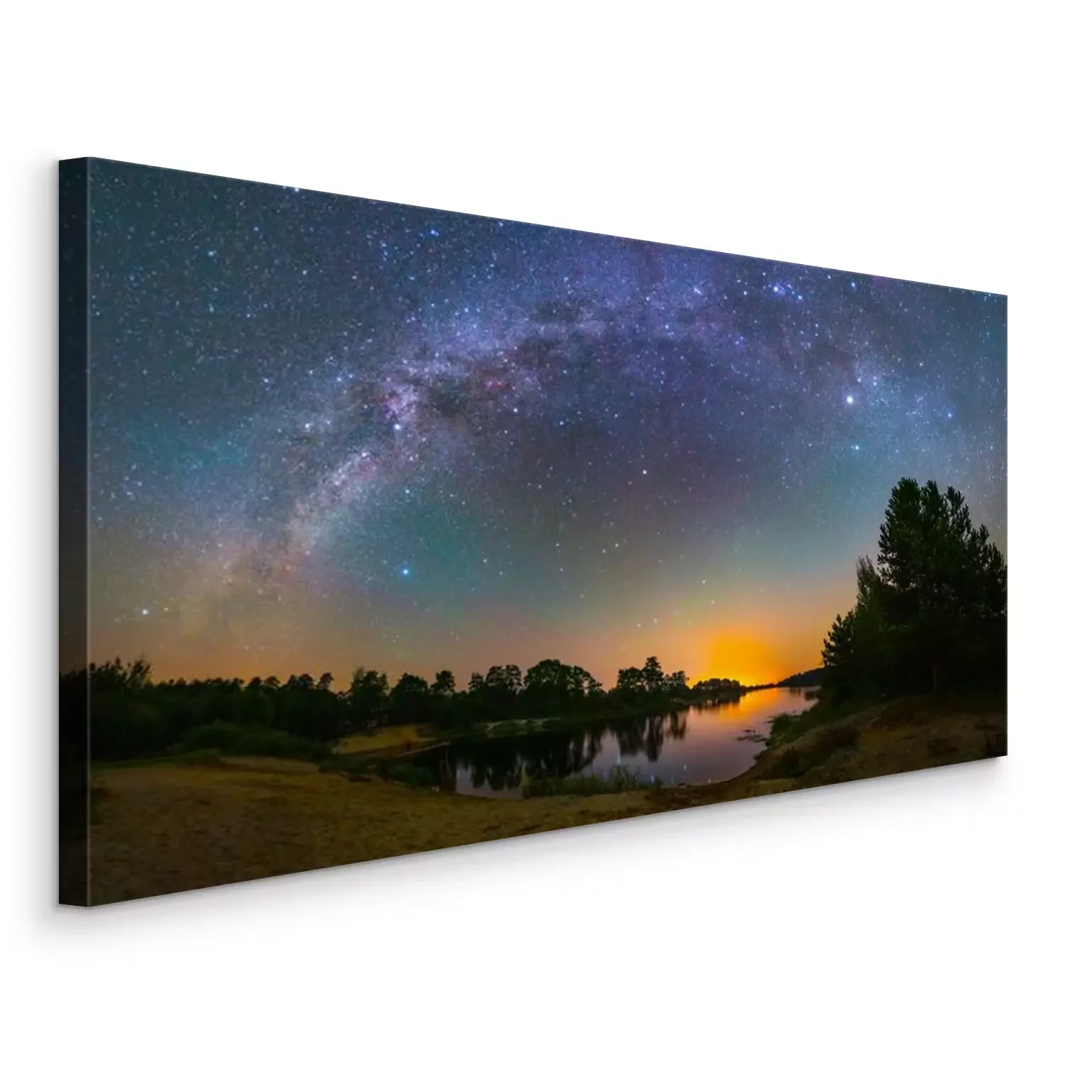 Een sterrenstelsel dat reflecteert in de wateren van een meer