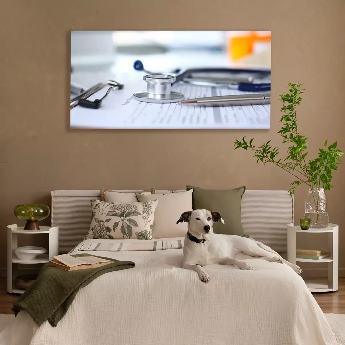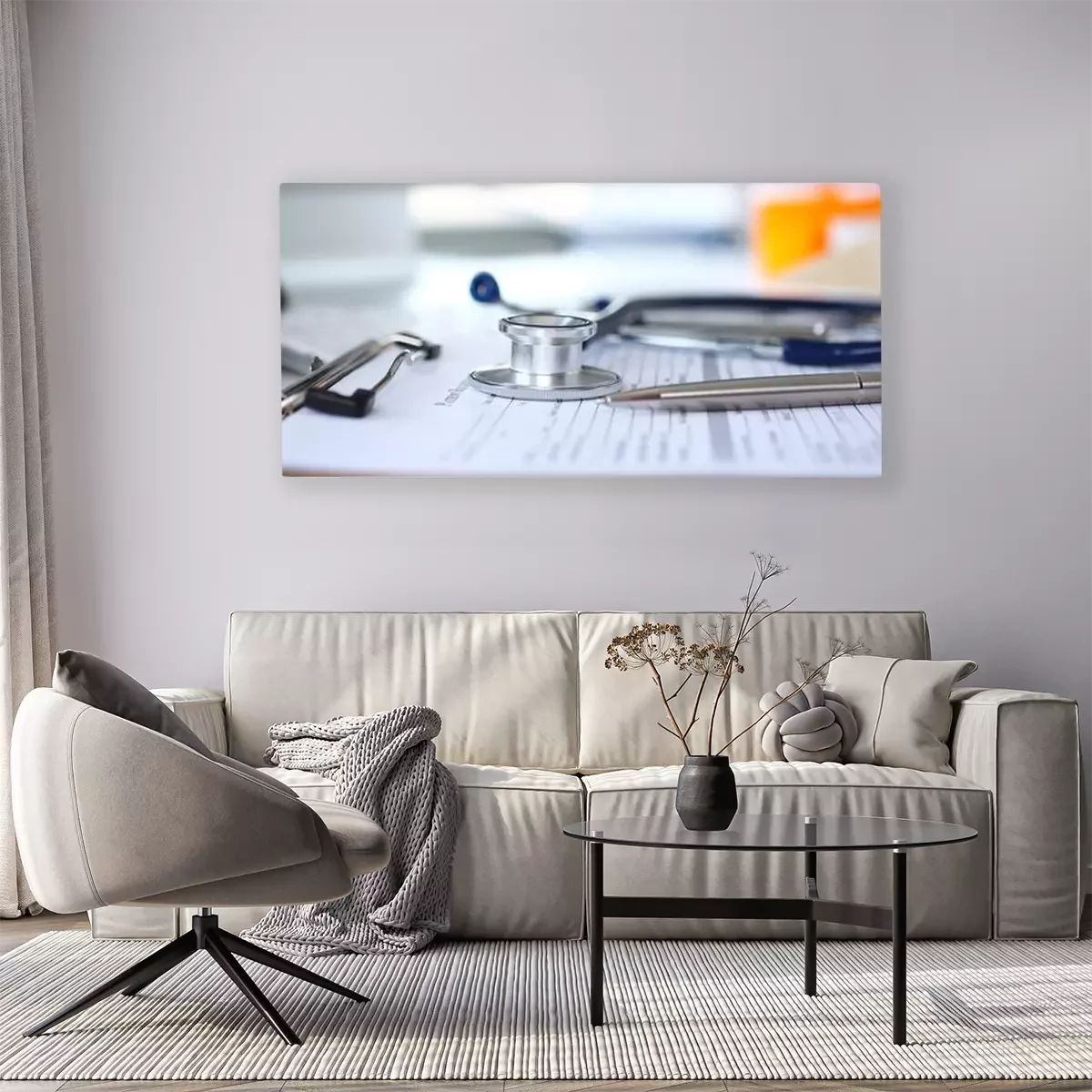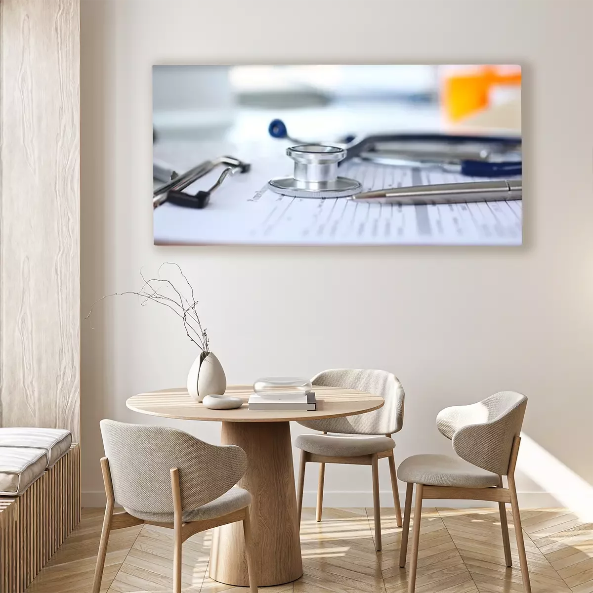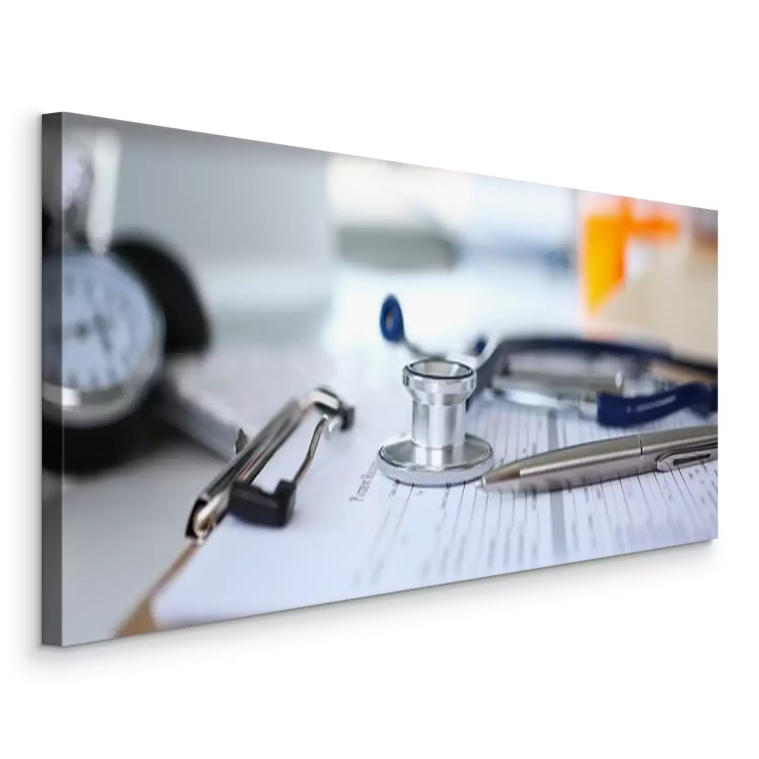 Canvas: Stethoscope head and silver pen lying on medical application form