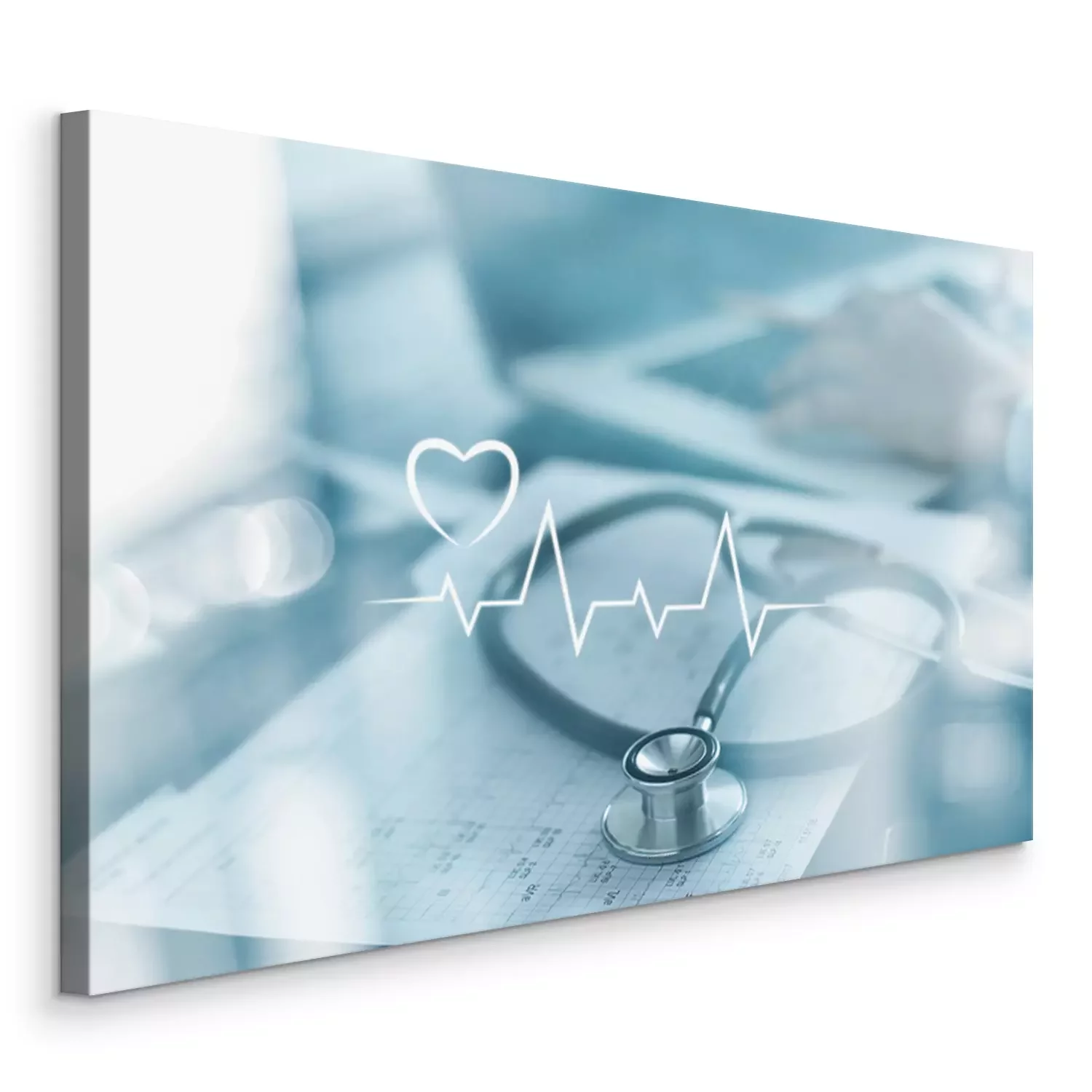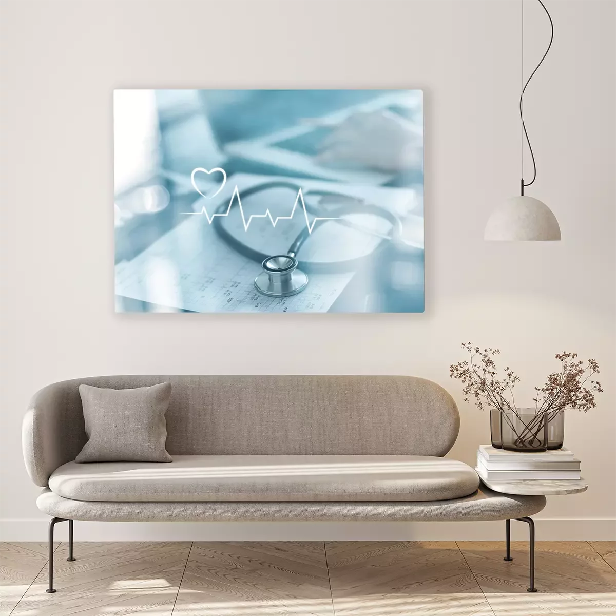 Canvas Stethoscope with heart beat report and doctor analyzing checkup on laptop in health medical laboratory background.