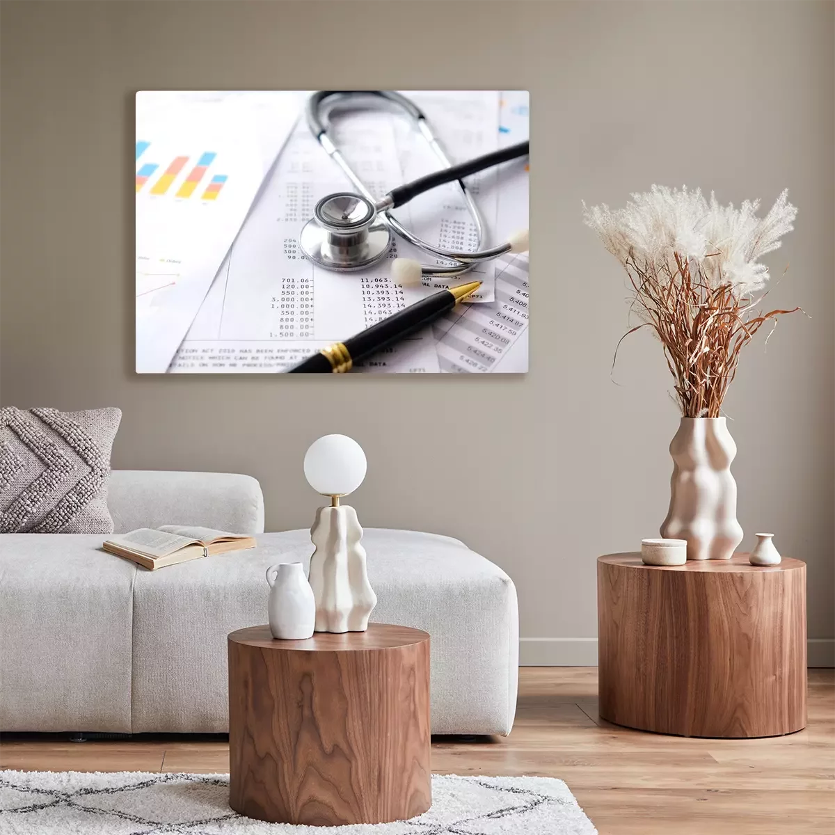 Canvas: Stethoscope with Pen, Charts and Graphs, Finance, Account, Statistics, Investment, Analytic Research Data Economy Spreadsheet and Business Company Concept