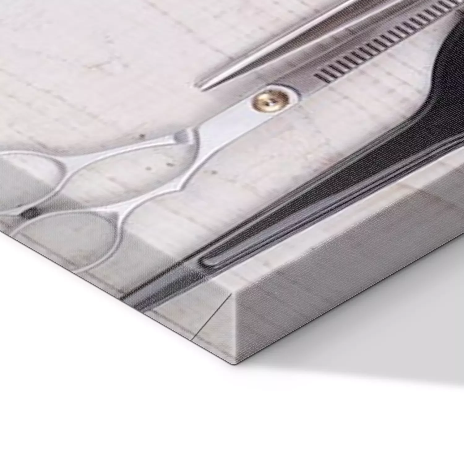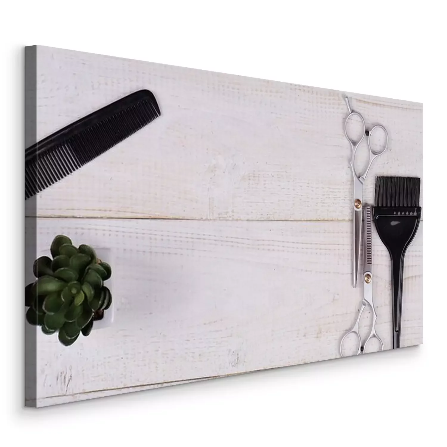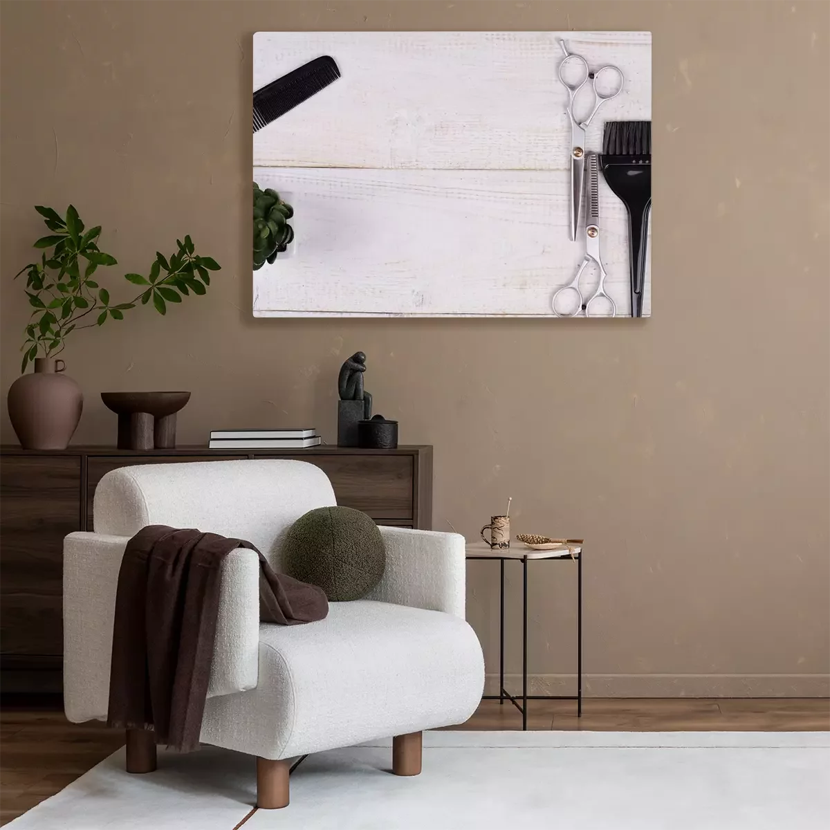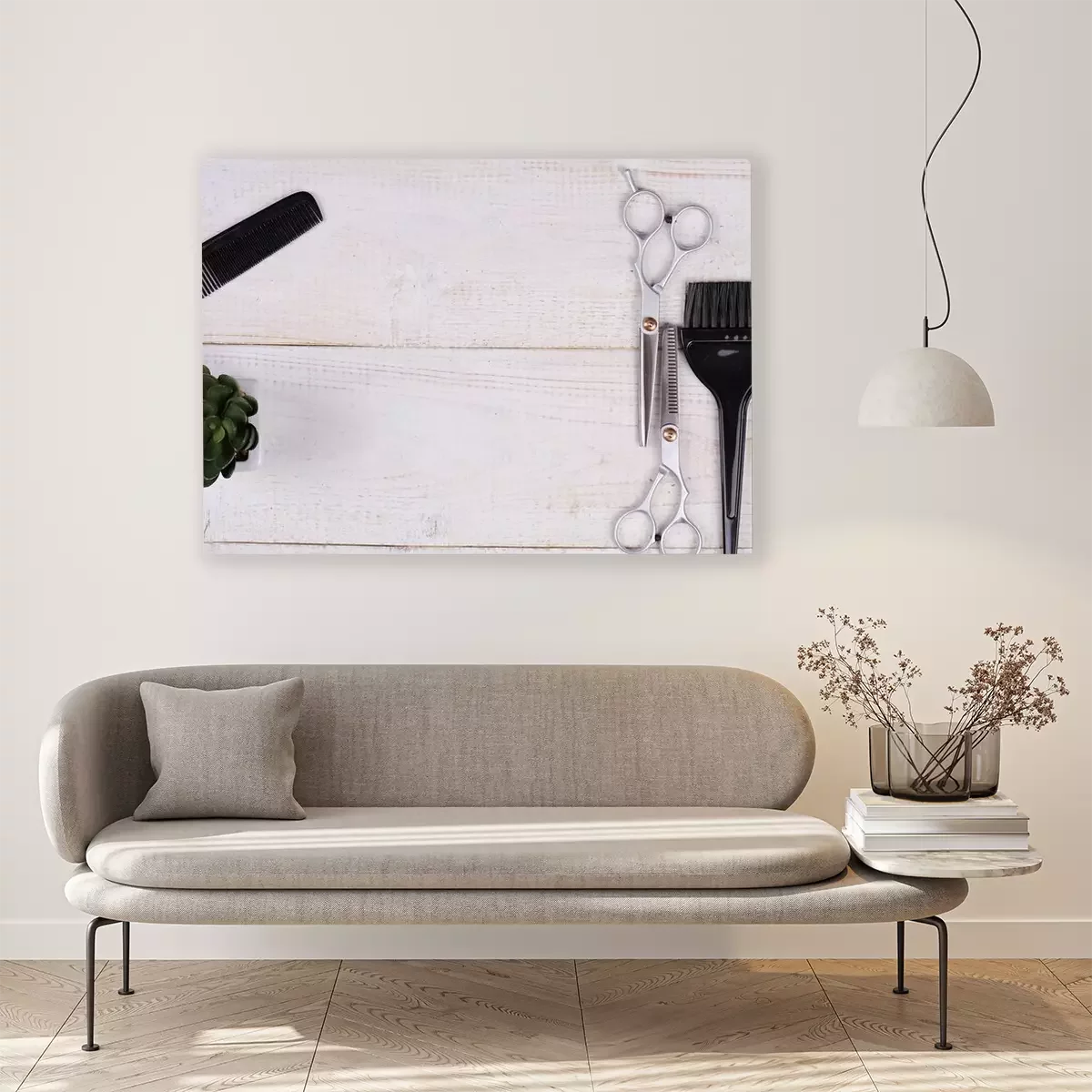 Canvas: Stijlvolle Professional Barber Schaar, haar knippen en Nagelschaar, kam en borstel voor haarkleuring op een witte houten achtergrond. Kapsalon concept. haircut accessoires