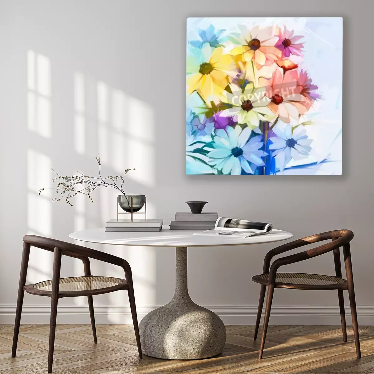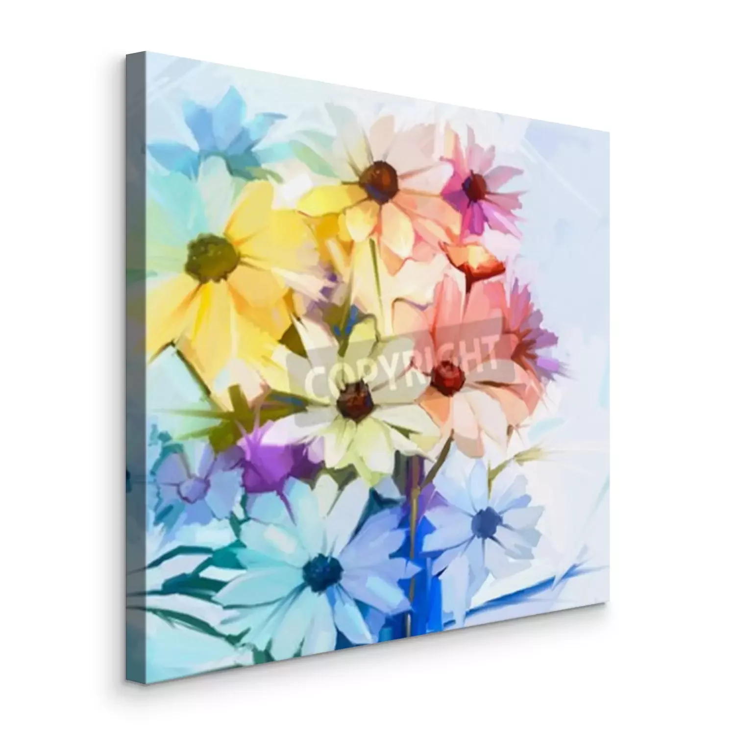 Canvas Stilleven van boeket witte kosmos bloemen met zachte geel, roze en paarse kleur. Olieverfschilderij zachte kleurrijke boeketbloem. Handgeschilderde zachte kleuren pastel stijl.