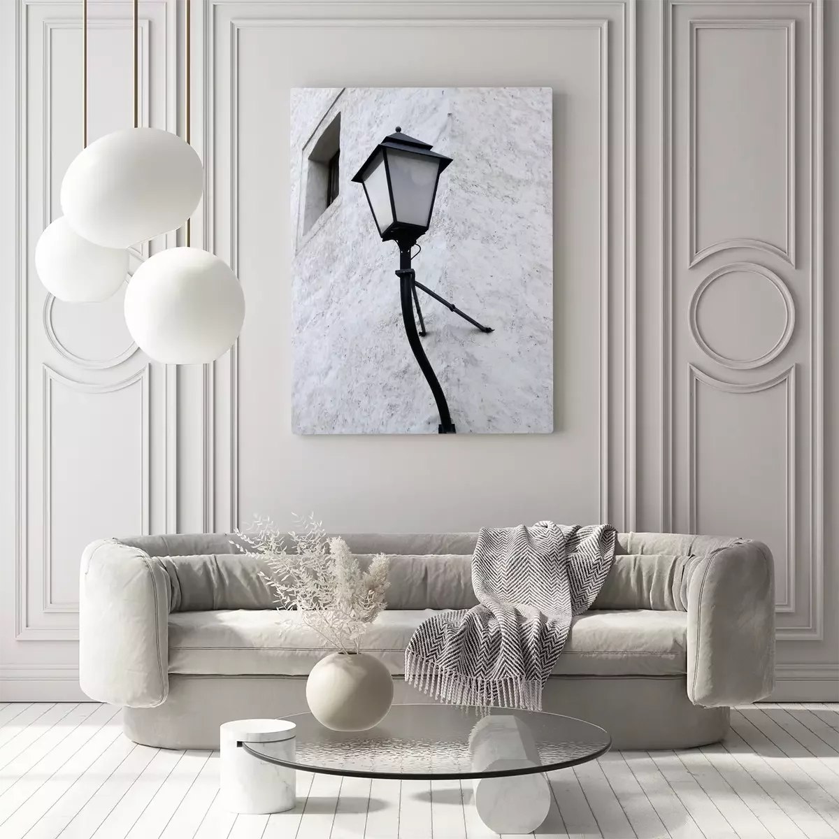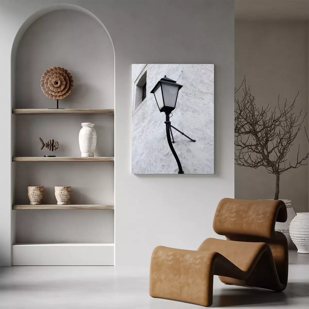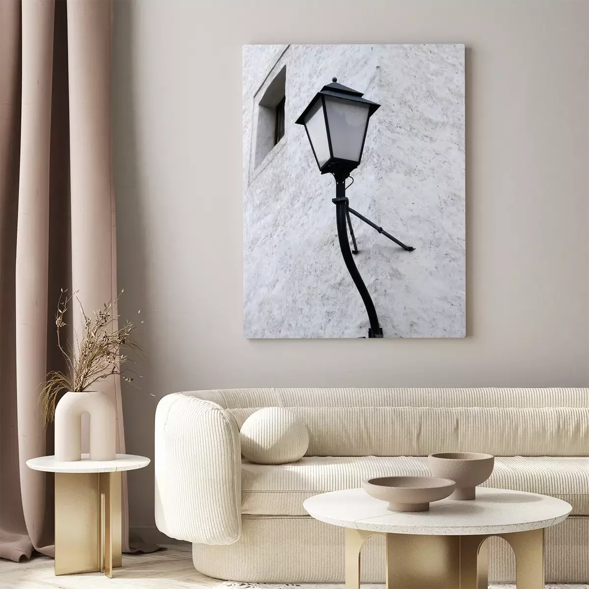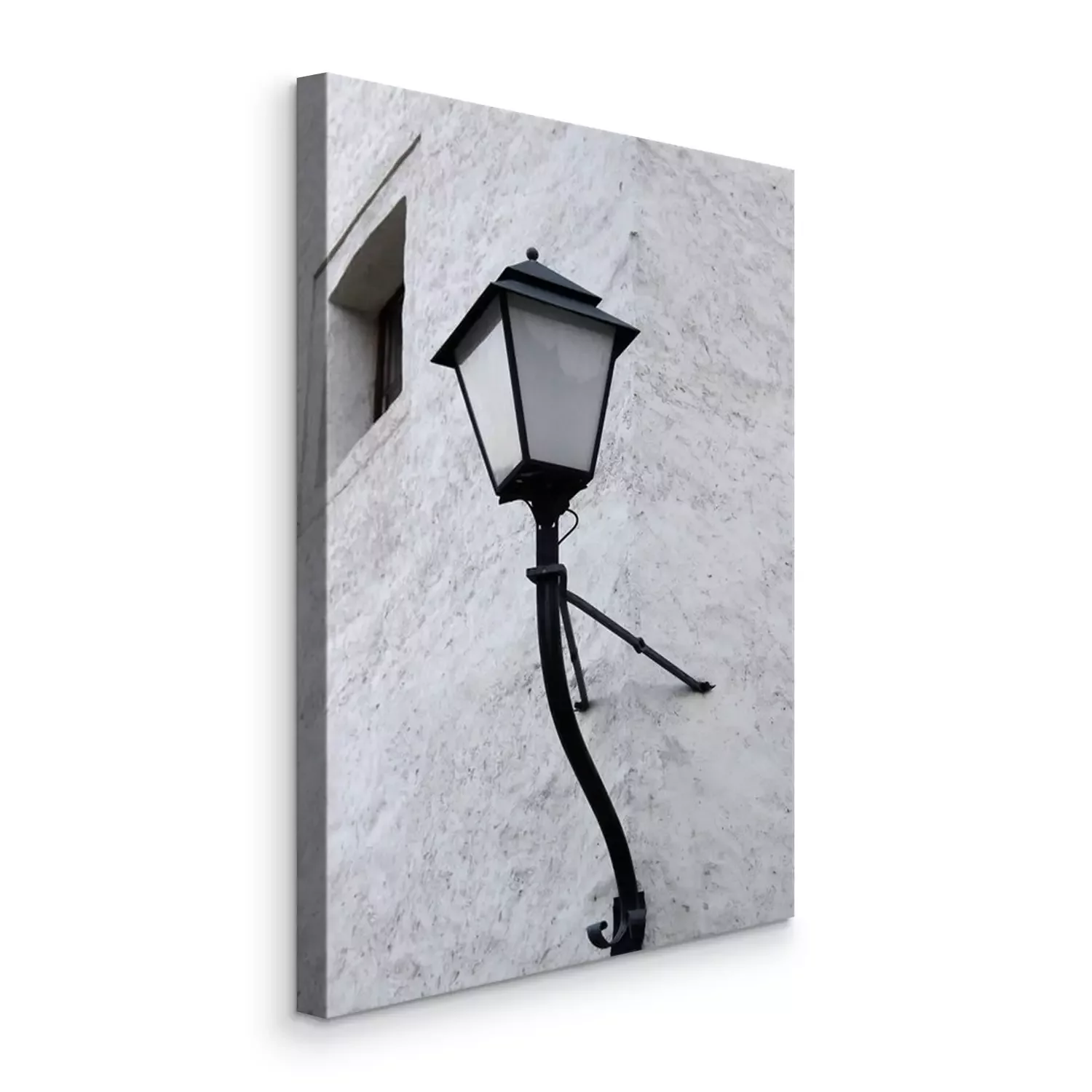 Canvas Straatlantaarn met glazen lampenkap en gietijzeren beugel op de muur van het oude gebouw. Astract fragment van middeleeuwse architectuur.