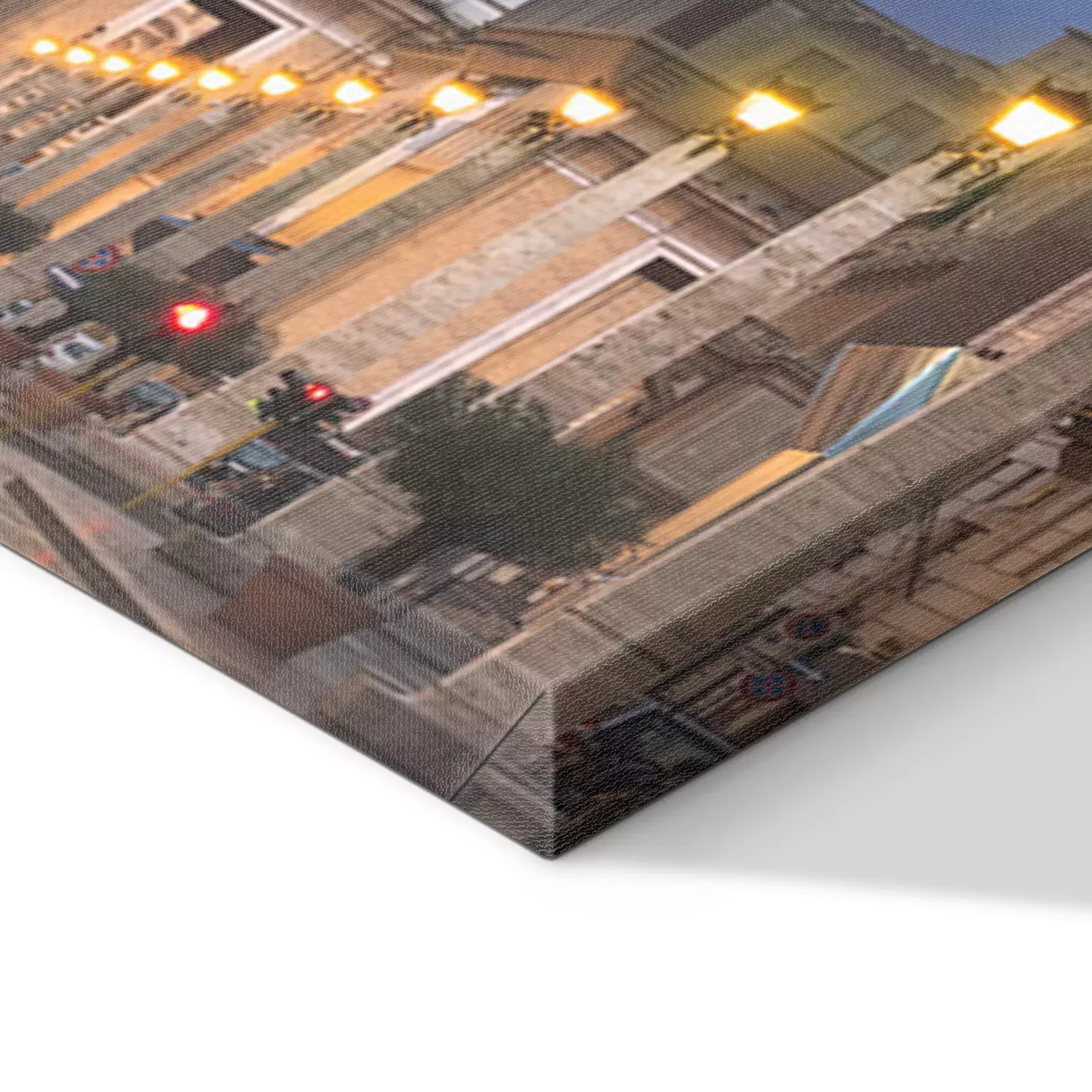 De print wordt aangebracht op hoogwaardig canvas dat op een schildersweefgetouw (spieraam) wordt gespannen. Omdat de print de zijranden bedekt, hoeft het ontwerp niet met een extra kader te worden omlijst. Wij raden ook composities aan die uit meerdere foto's bestaan en zo een coherente compositie vormen.
