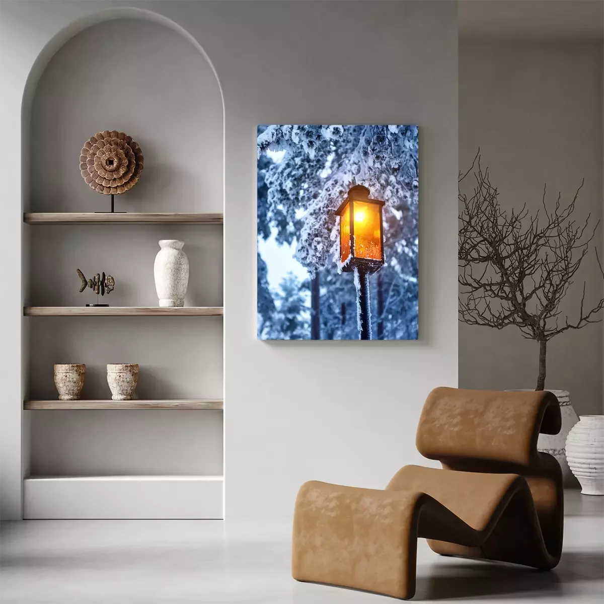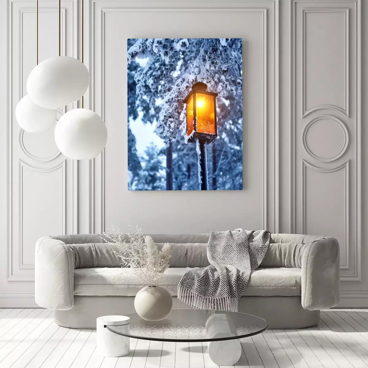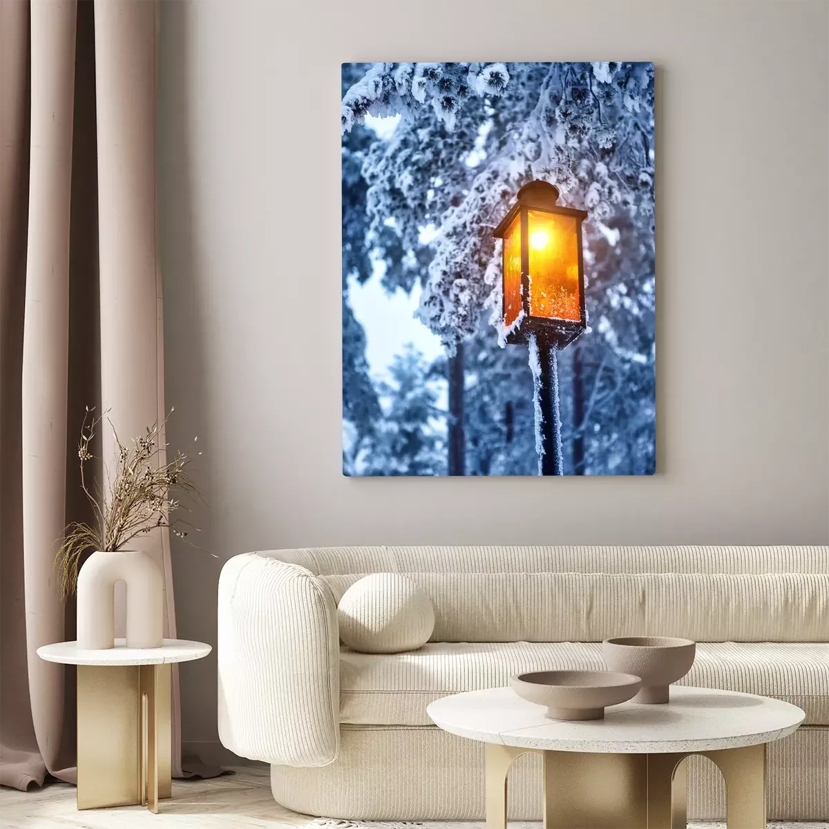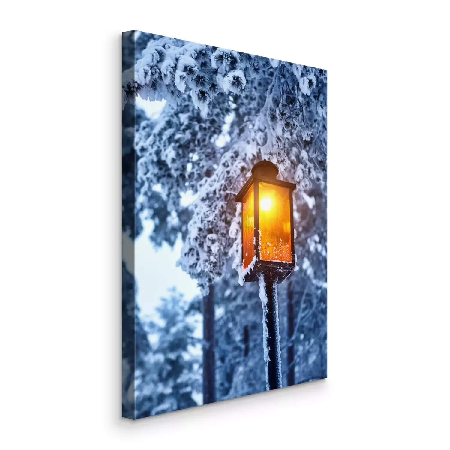 Canvas: Street old lantern with a candle on the street in the winter. Festive mood.