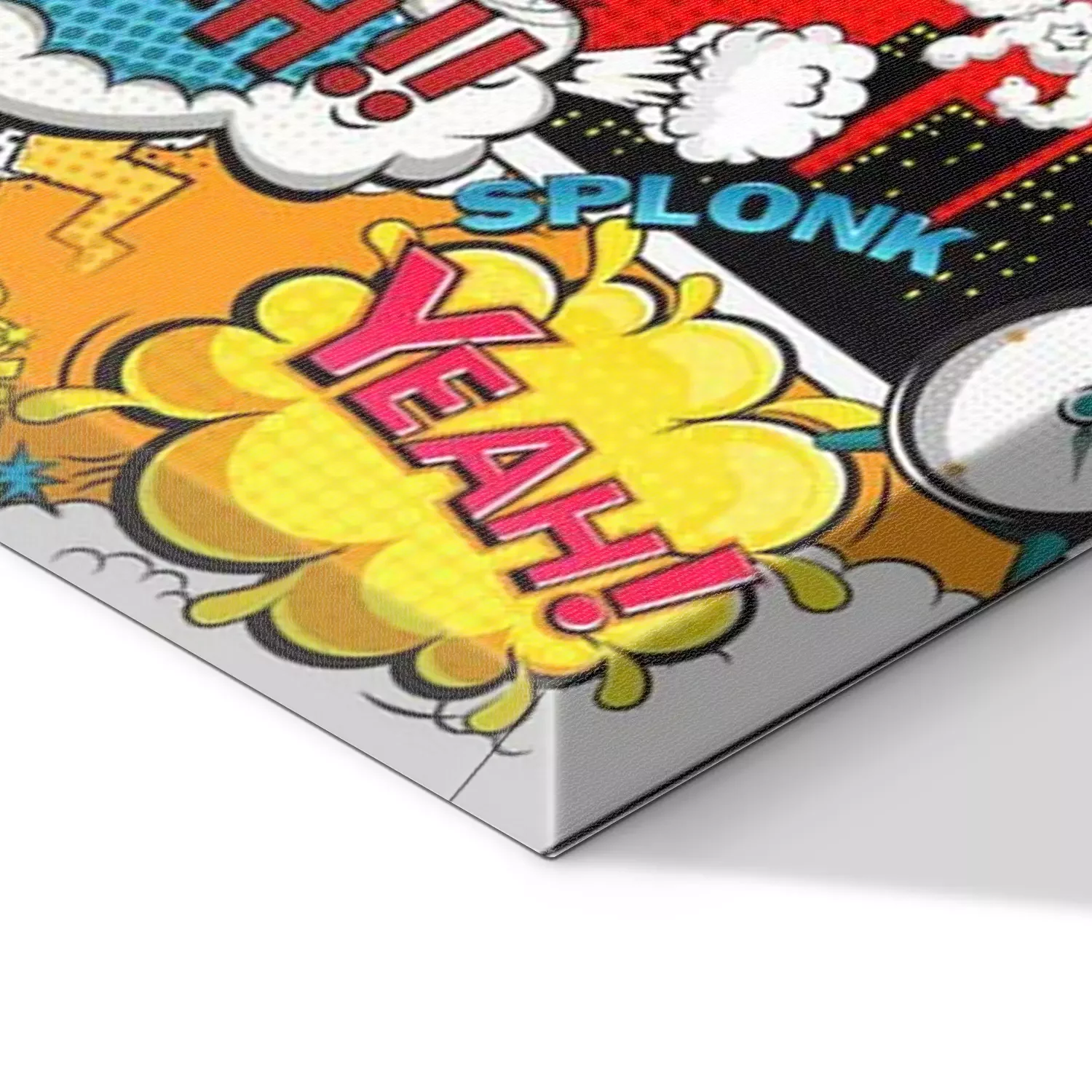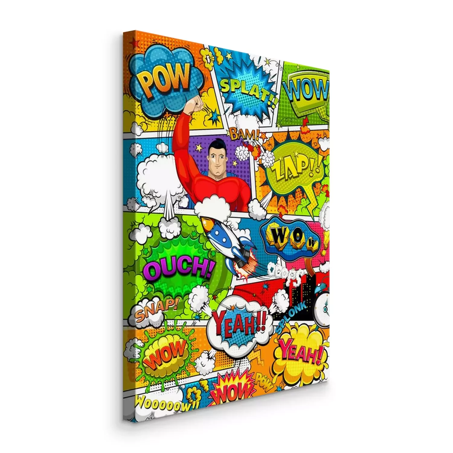 Canvas Stripboekpagina gedeeld door lijnen met spraakbellen, raket, superheld en geluidseffect. Retro achtergrondmodel. Stripsjabloon. Illustratie