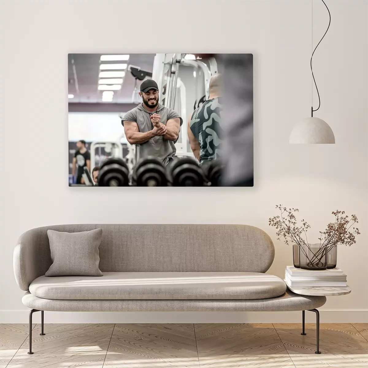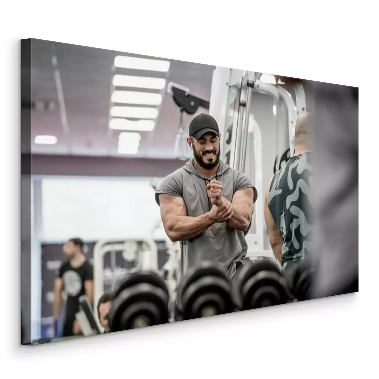 Canvas Strong muscle bearded caucasian athlete man holding his wrist with hand during sport training injury with grimace of pain on his face indoor gym