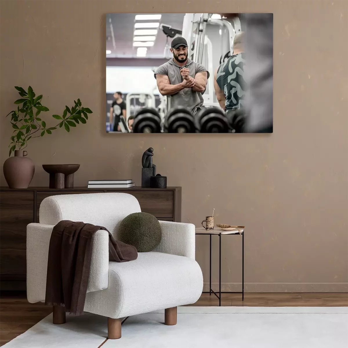 Canvas: Strong muscle bearded caucasian athlete man holding his wrist with hand during sport training injury with grimace of pain on his face indoor gym