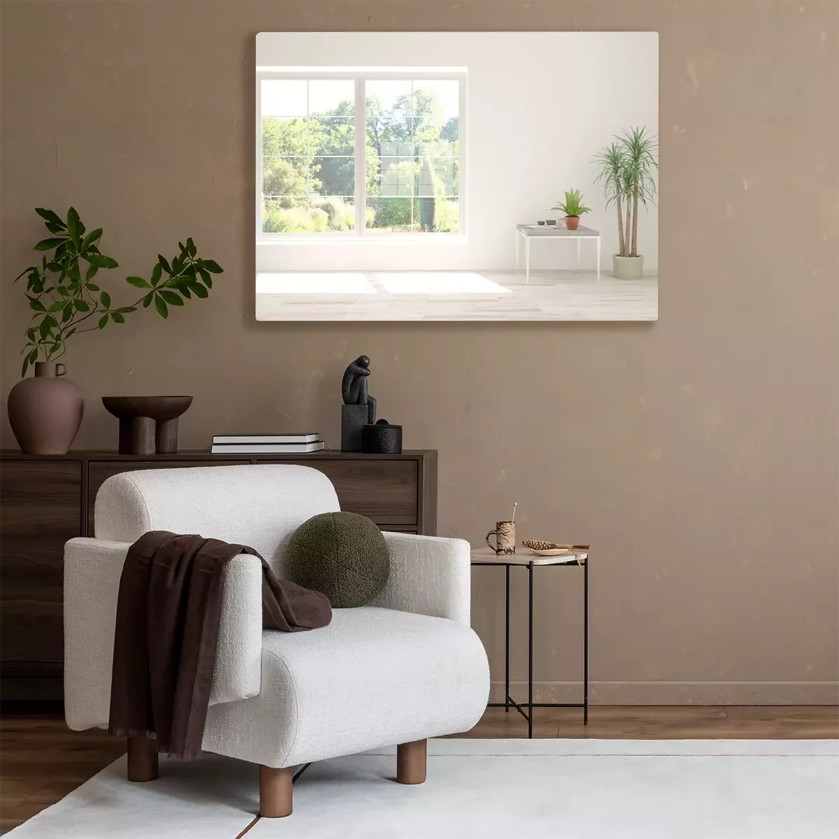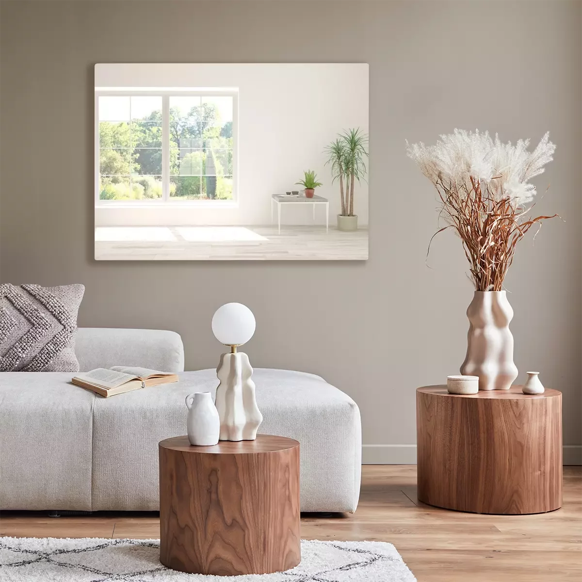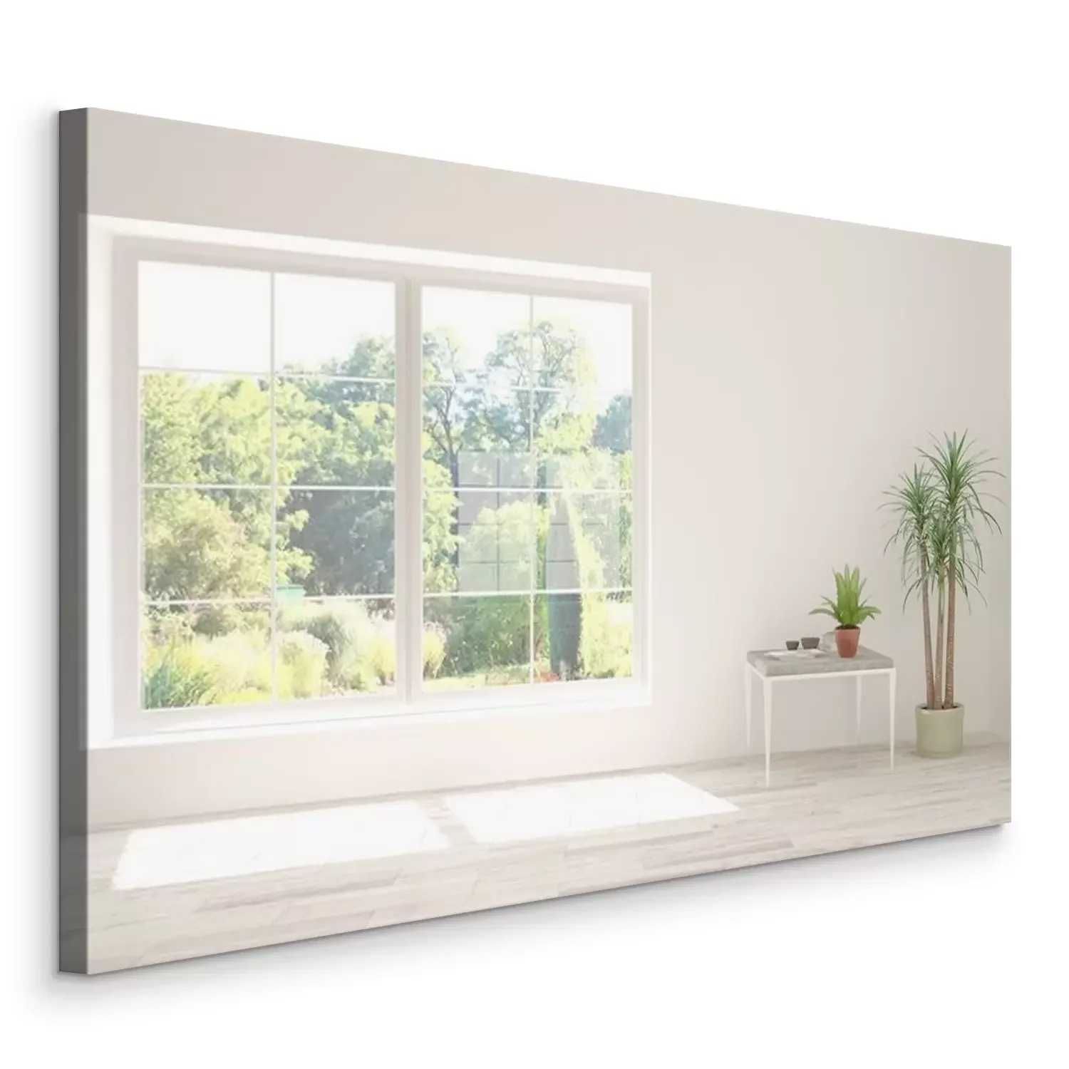 Canvas: Stylish empty room in white color with summer landscape in window. Scandinavian interior design. 3D illustration