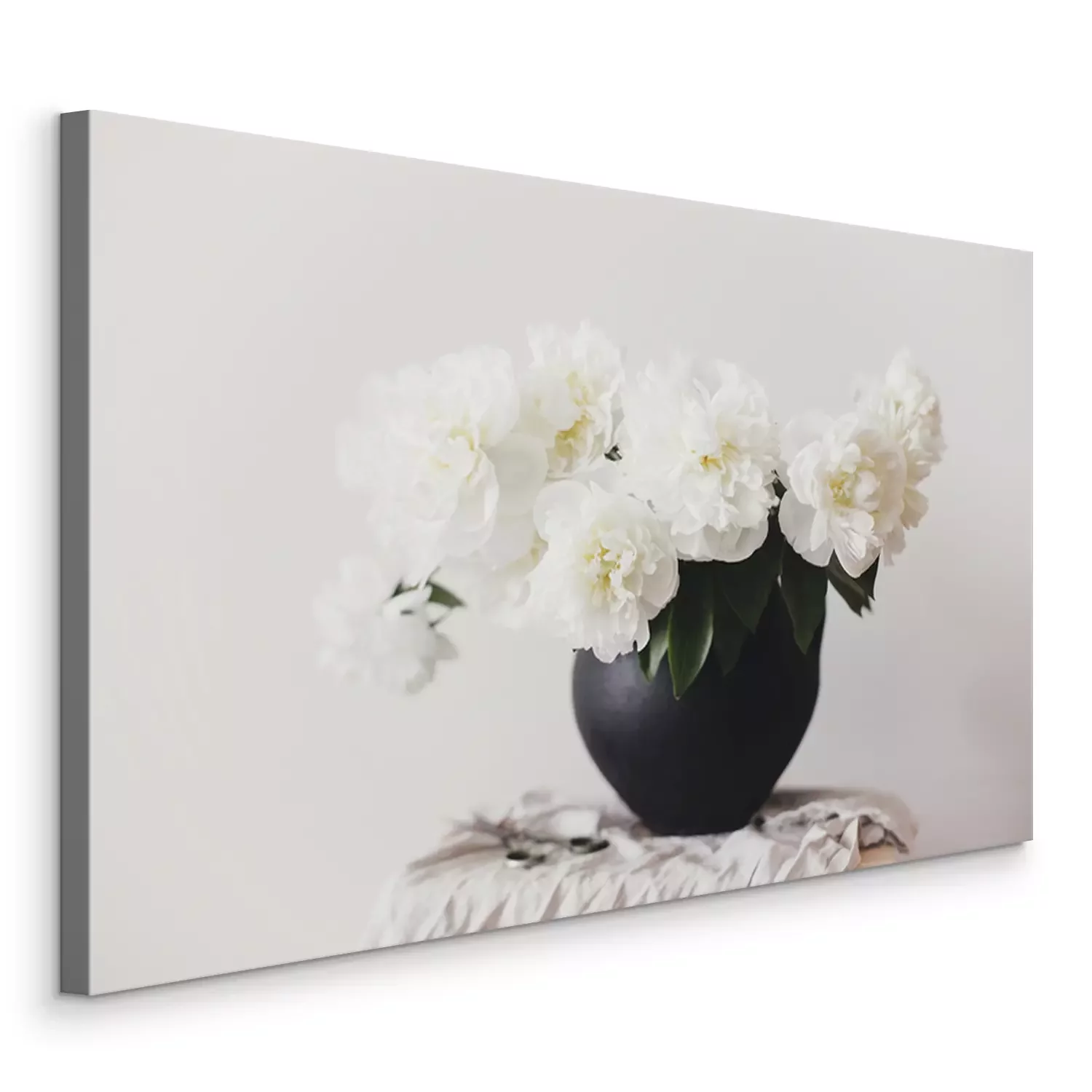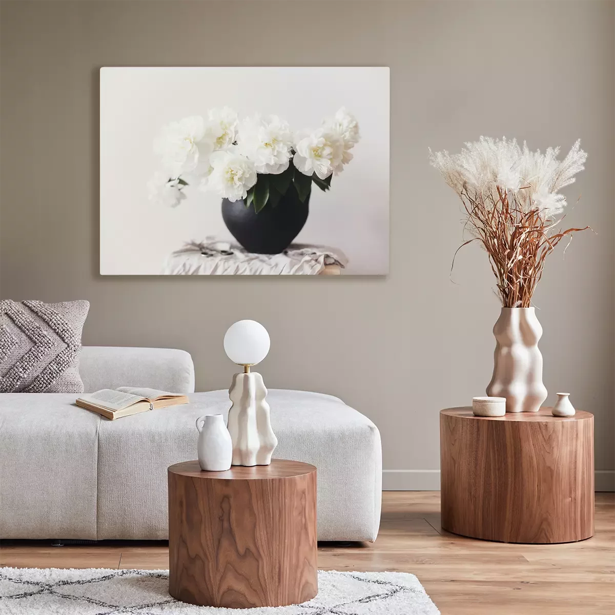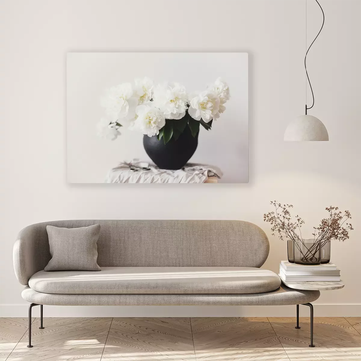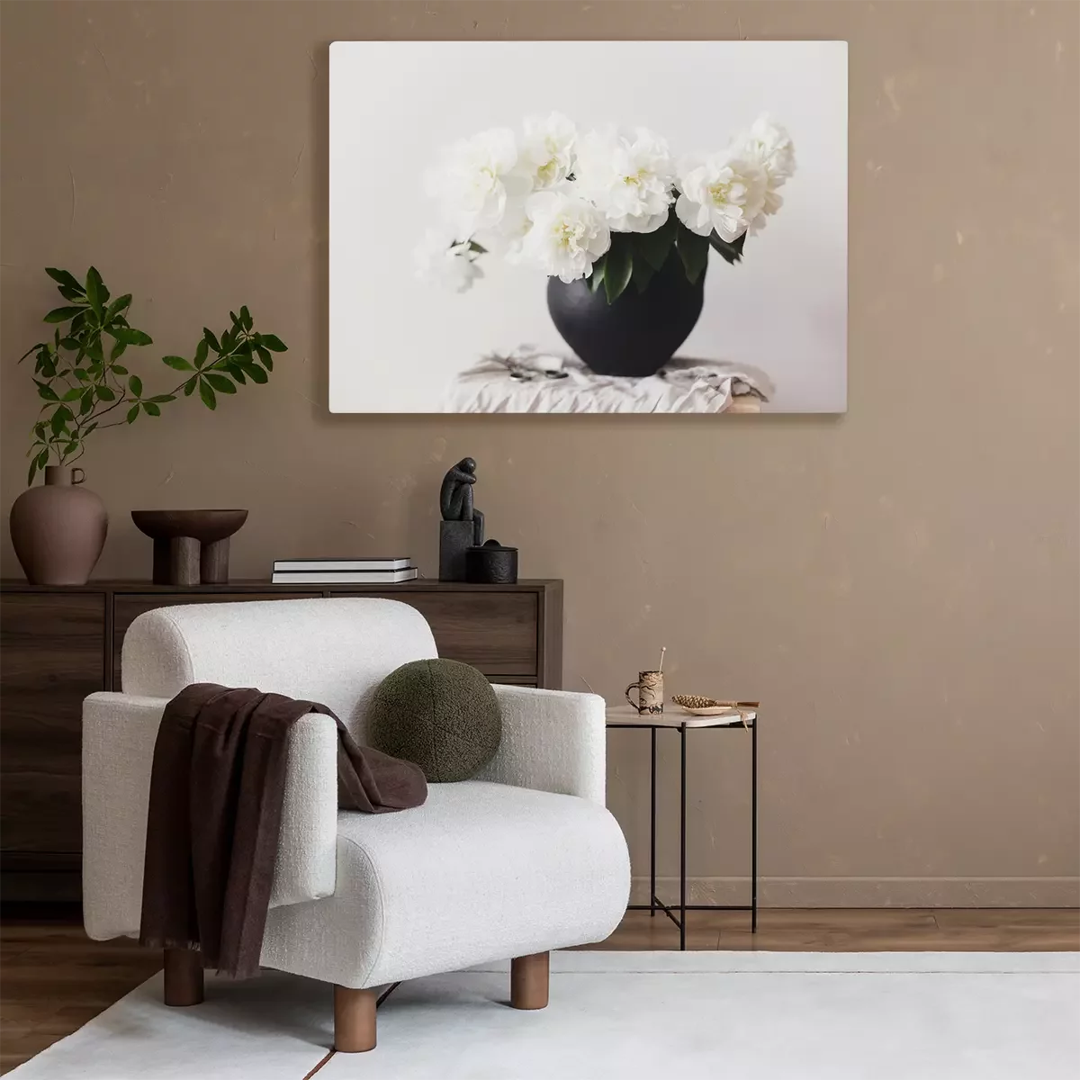 Canvas Stylish peony bouquet in black clay vase on linen fabric with scissors on rustic background. White peonies rural still life. Hello spring wallpaper. Happy Mothers day. Space text