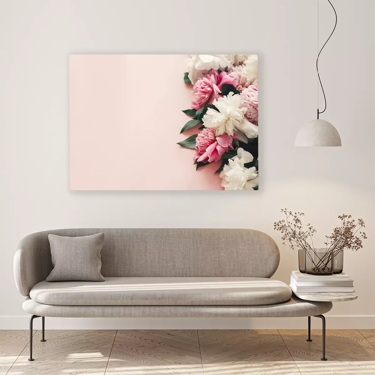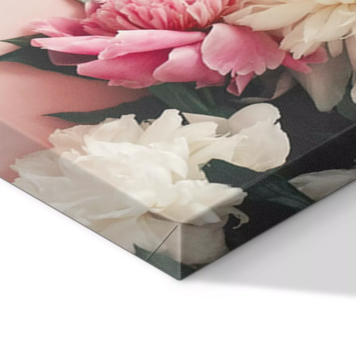 Canvas Stylish pink and white peonies border on pink paper flat lay with space for text. Happy mother's day. International womens day. Greeting card mockup. Hello spring