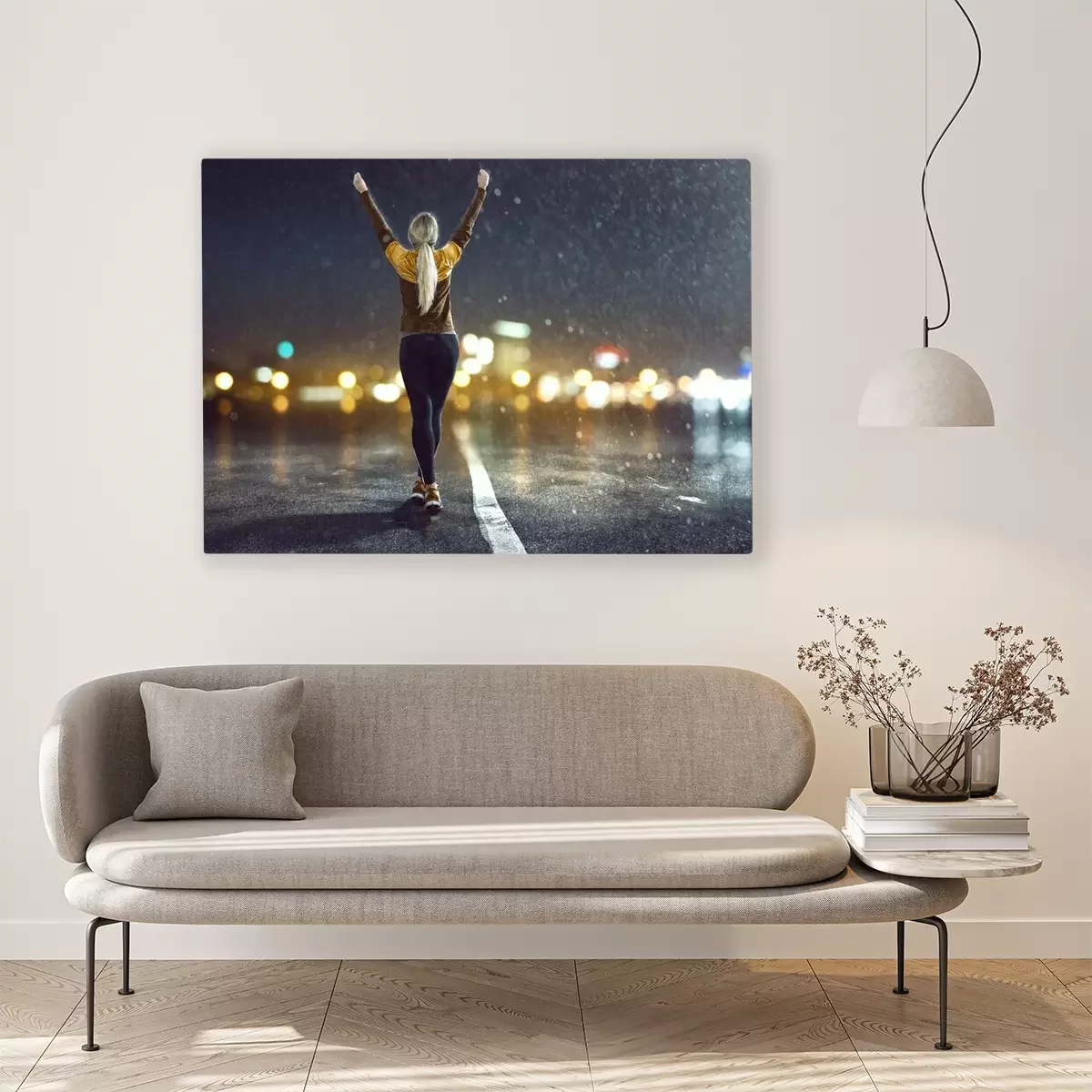 De print wordt aangebracht op hoogwaardig canvas dat op een schildersweefgetouw (spieraam) wordt gespannen. Omdat de print de zijranden bedekt, hoeft het ontwerp niet met een extra kader te worden omlijst. Wij raden ook composities aan die uit meerdere foto's bestaan en zo een coherente compositie vormen.
