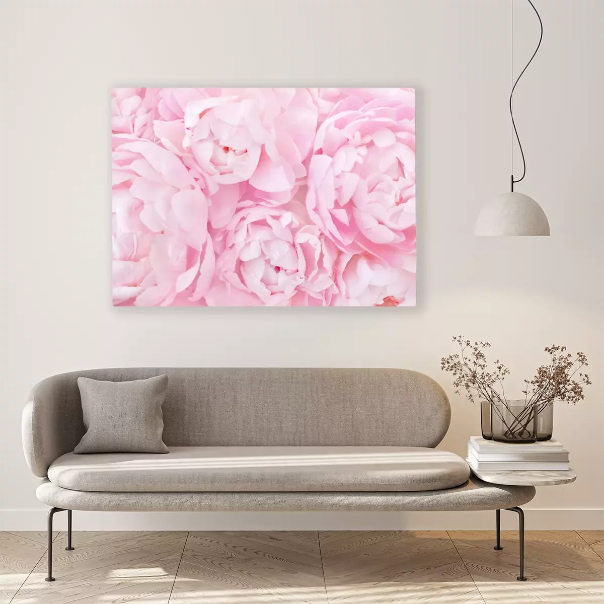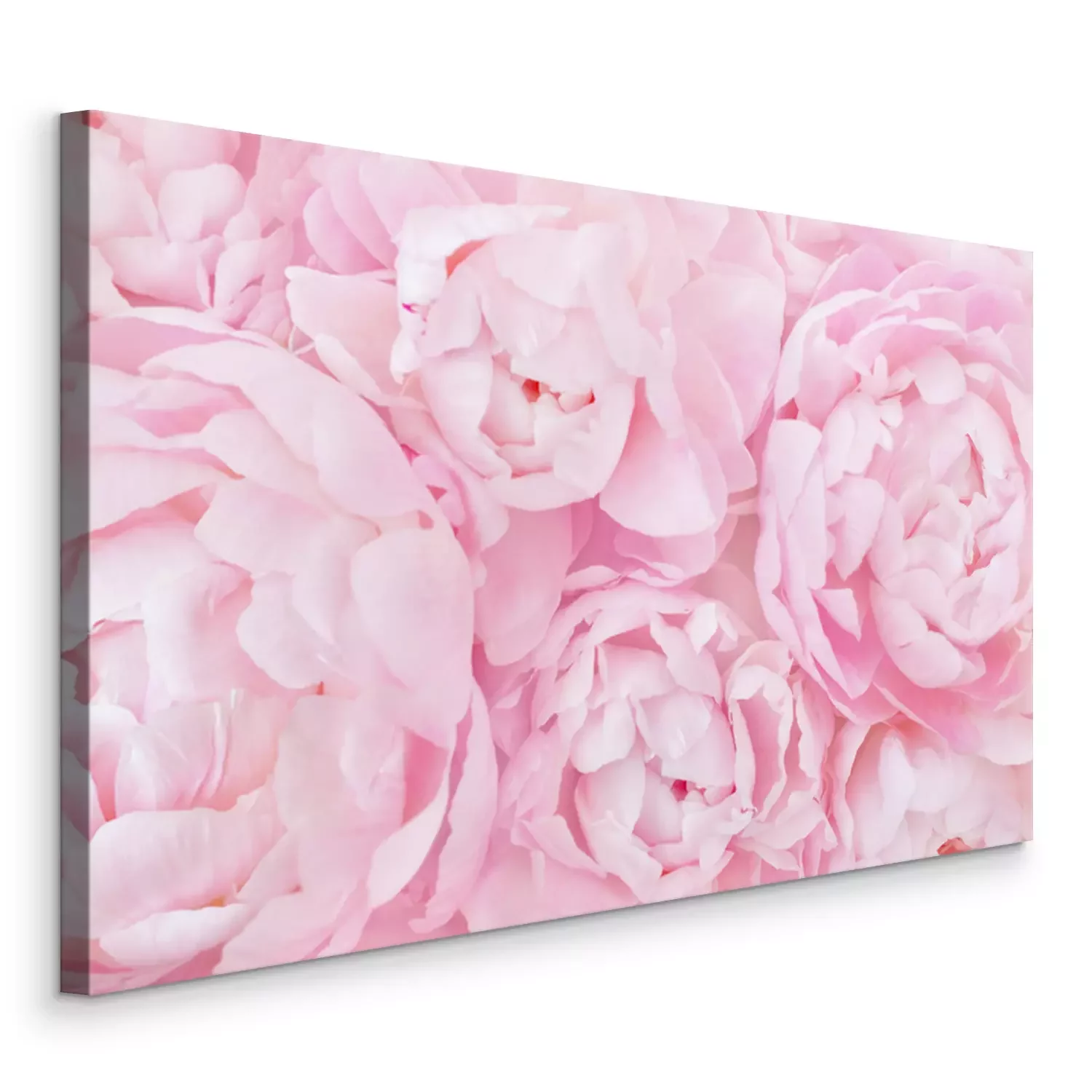 Canvas: Summer blossoming delicate peony frame, blooming peonies flowers festive background, pastel and soft floral card, selective focus, toned