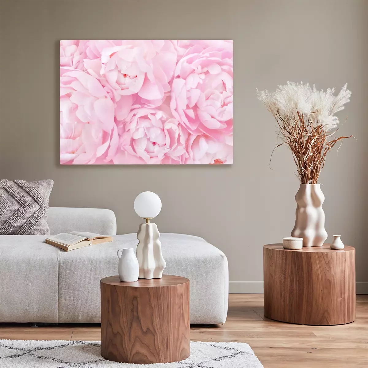 Canvas Summer blossoming delicate peony frame, blooming peonies flowers festive background, pastel and soft floral card, selective focus, toned