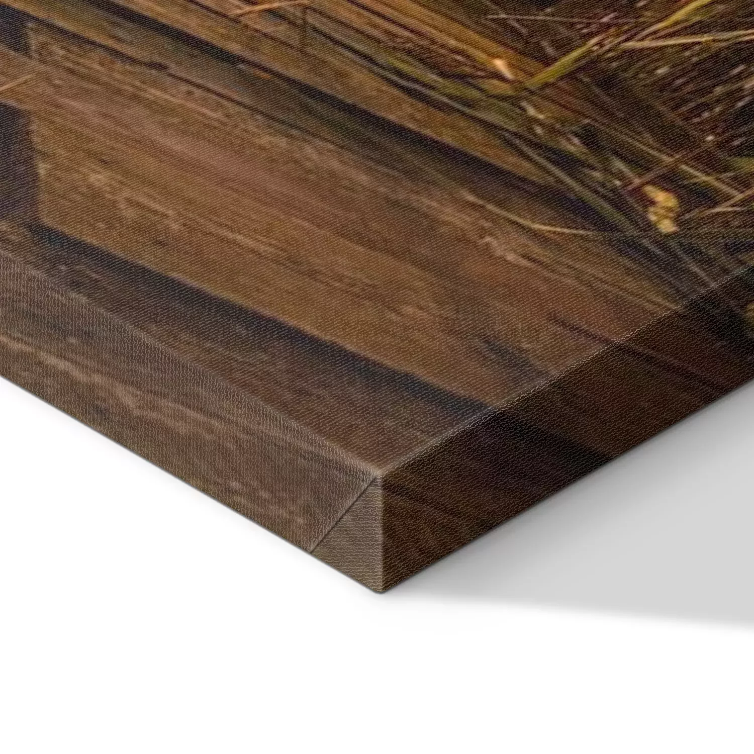De print wordt aangebracht op hoogwaardig canvas dat op een schildersweefgetouw (spieraam) wordt gespannen. Omdat de print de zijranden bedekt, hoeft het ontwerp niet met een extra kader te worden omlijst. Wij raden ook composities aan die uit meerdere foto's bestaan en zo een coherente compositie vormen.