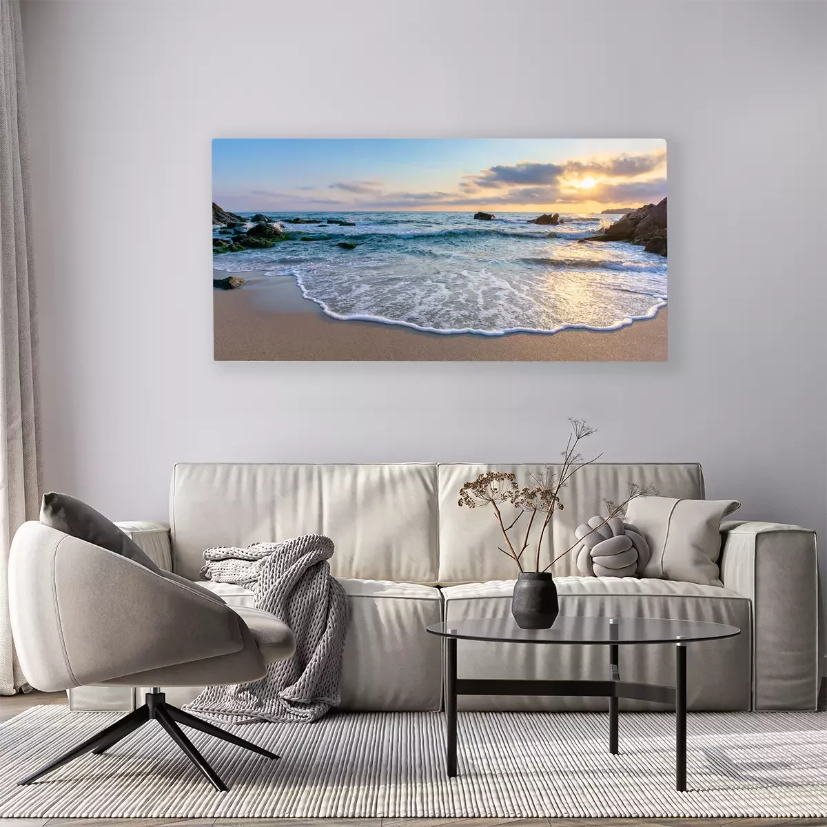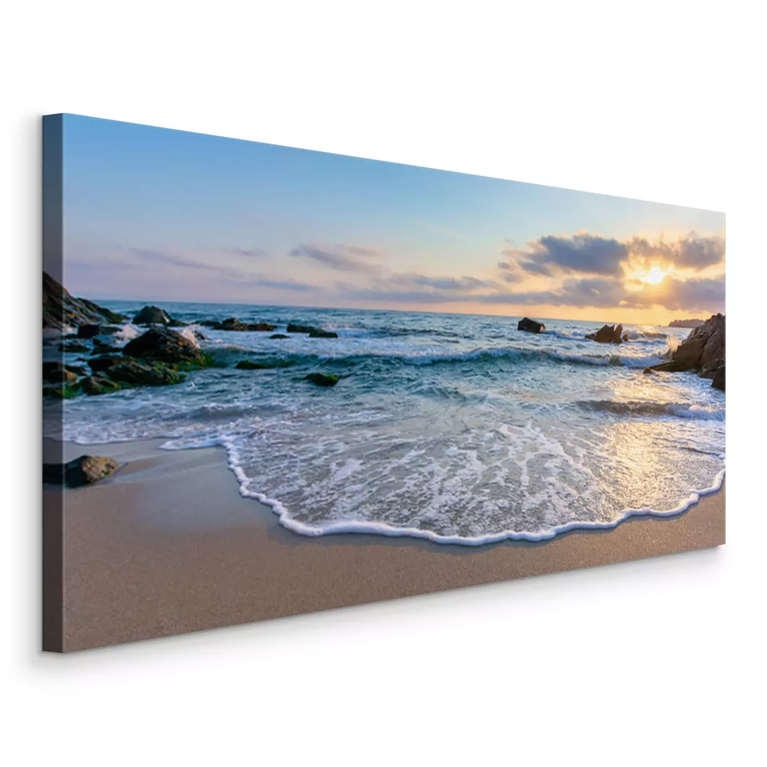 Canvas: sunrise on the beach. beautiful summer scenery. rocks on the sand. calm waves on the water. clouds on the sky. wide panoramic view