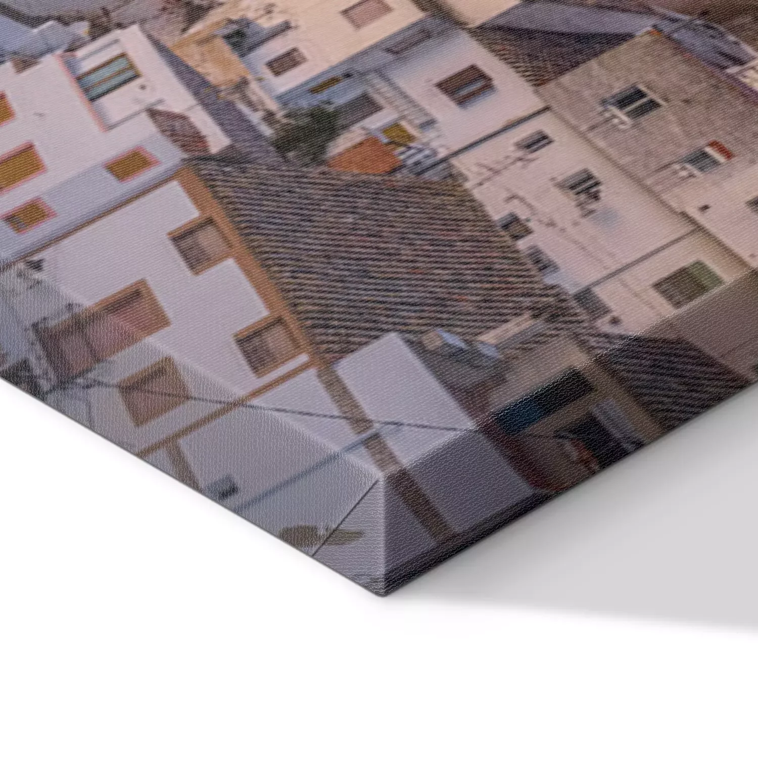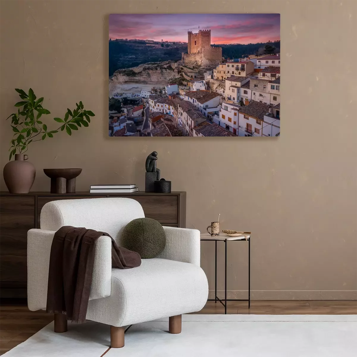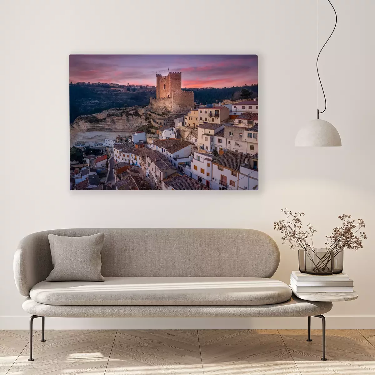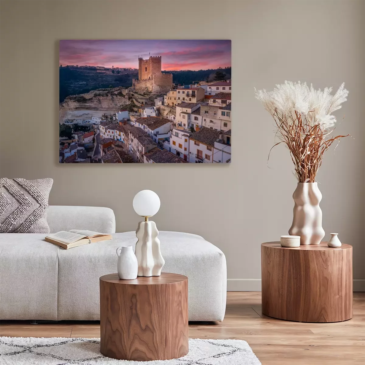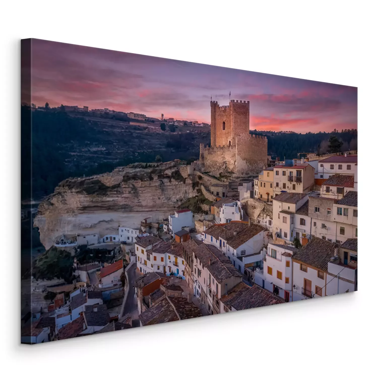 Canvas: Sunset aerial panorama view of Alcala del Jucar medieval historic village with white washed houses and a castle on a rock in Albacete Spain