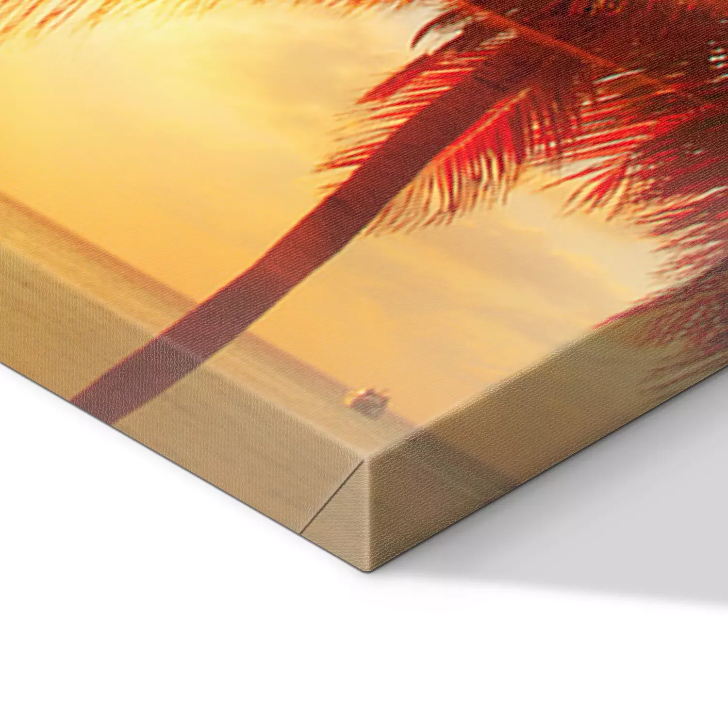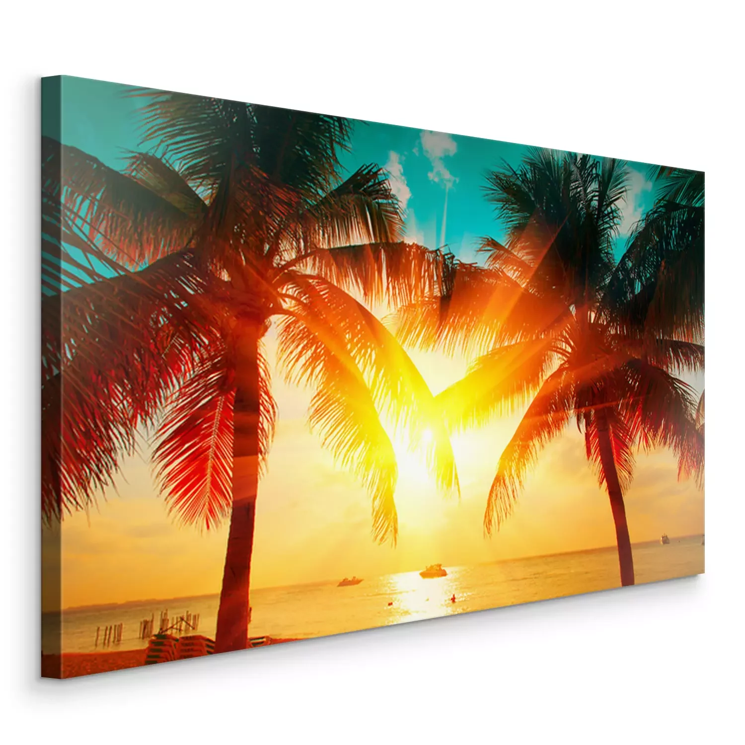 Canvas: Sunset beach with tropical palm tree over beautiful sky. Palms and beautiful sky background. Tourism, vacation concept backdrop. Palms silhouettes over orange sun
