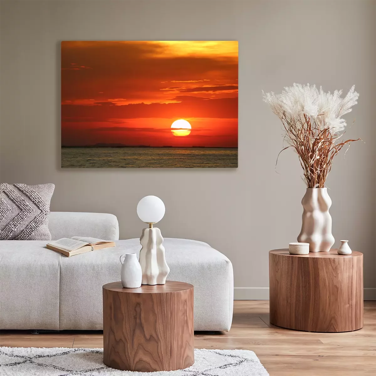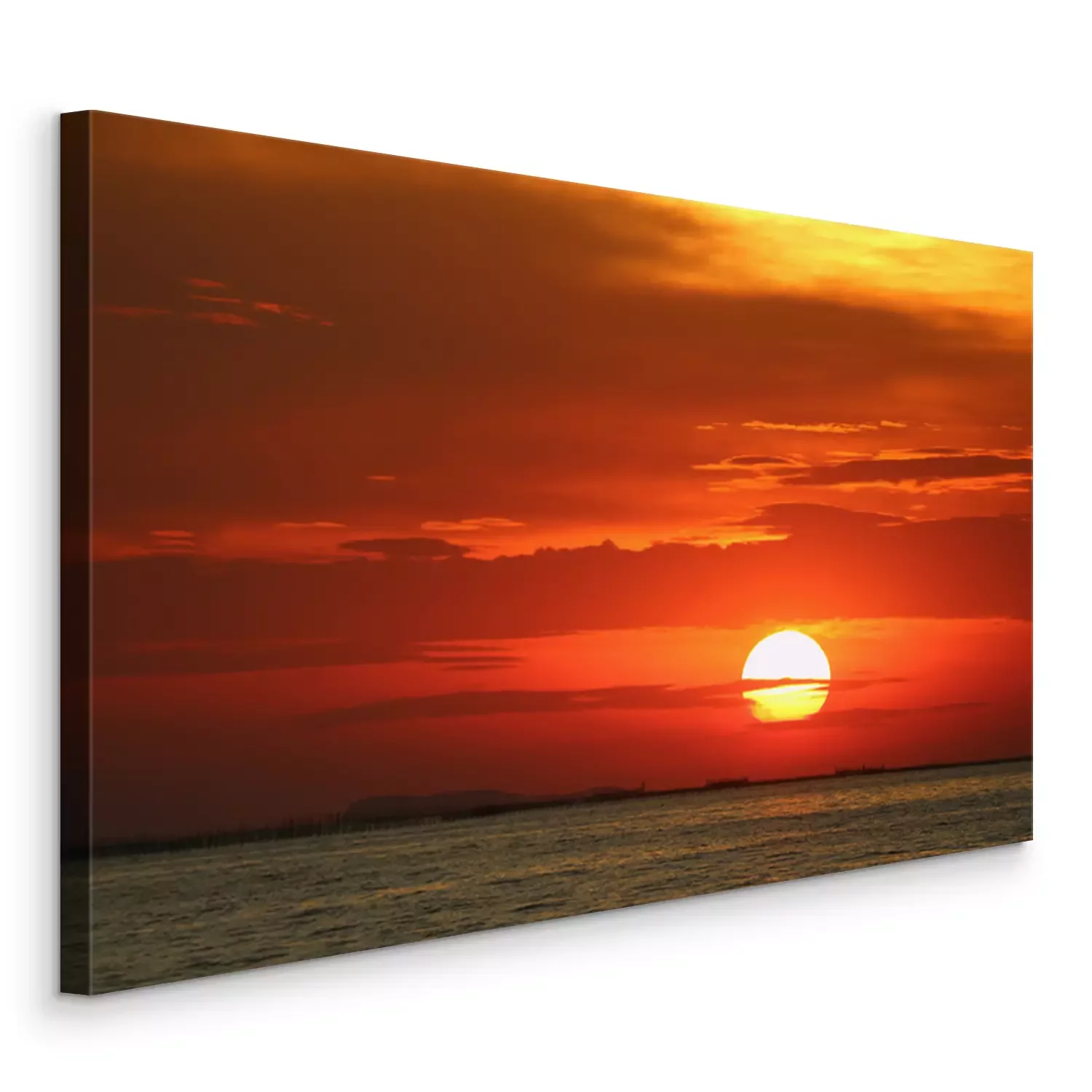Canvas: sunset on red yellow sky back soft evening cloud over horizon sea
