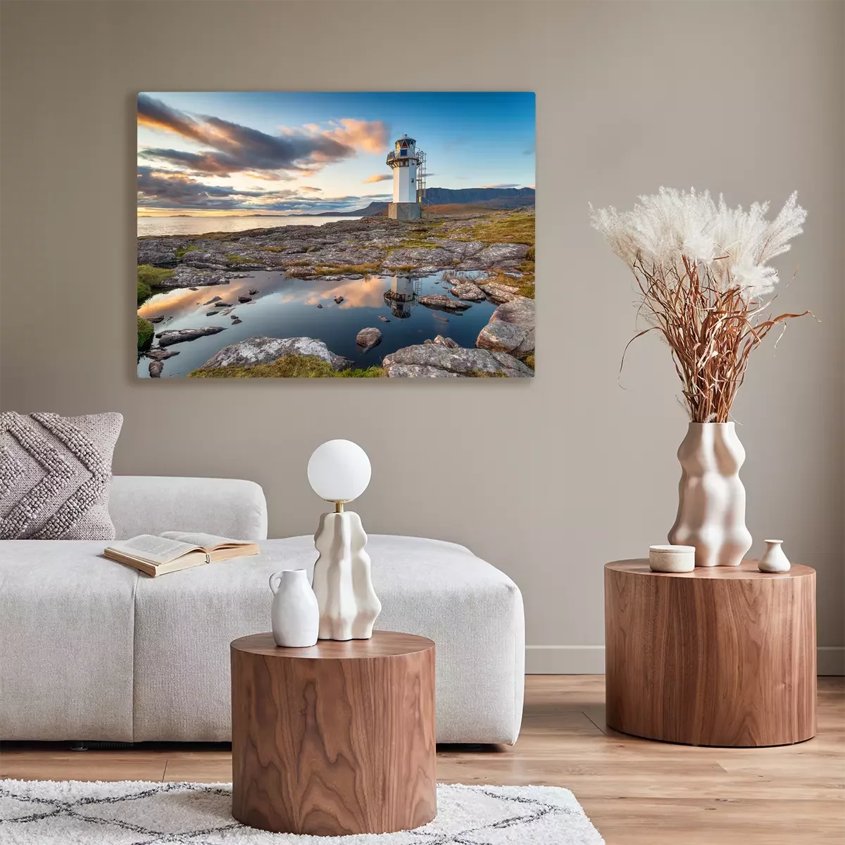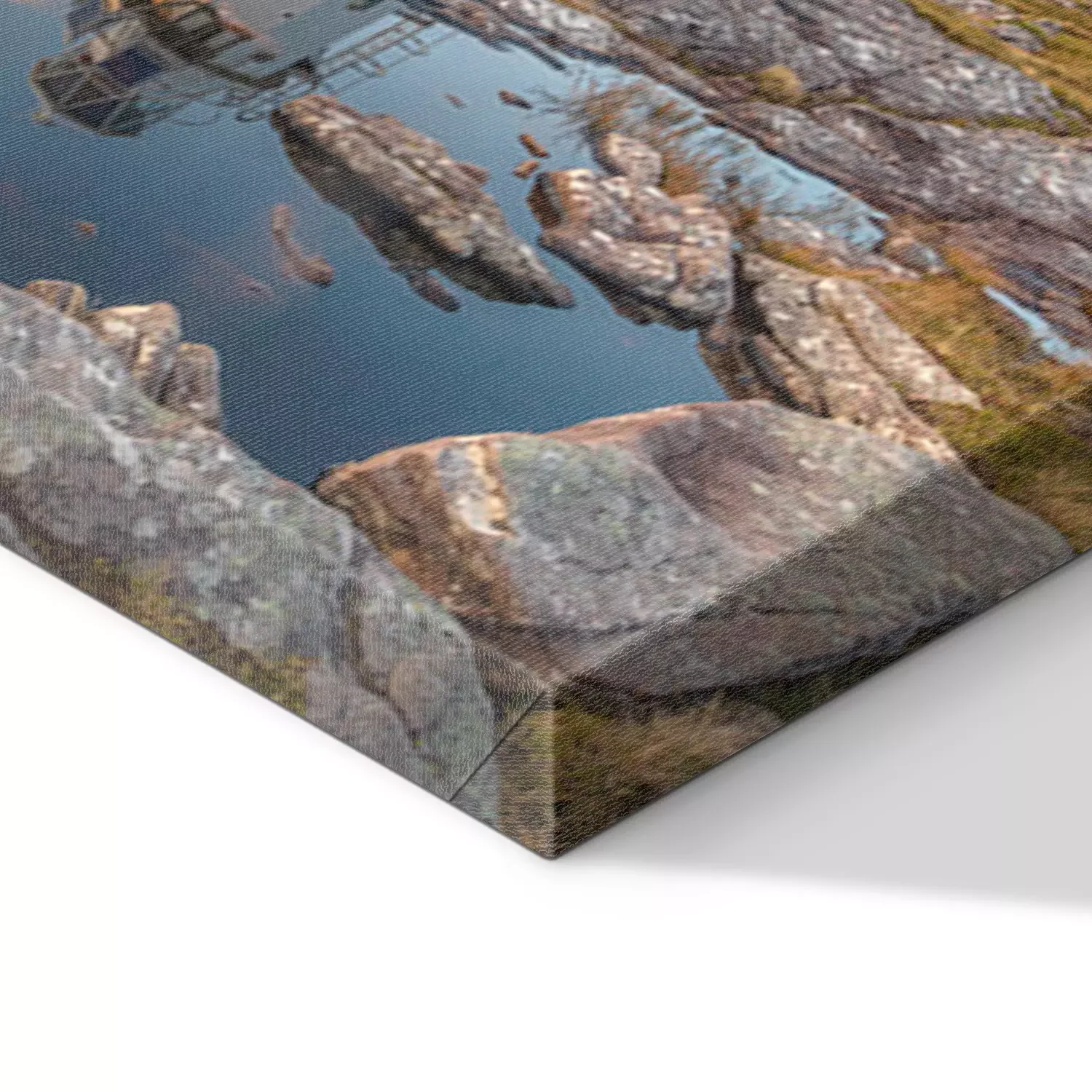 De print wordt aangebracht op hoogwaardig canvas dat op een schildersweefgetouw (spieraam) wordt gespannen. Omdat de print de zijranden bedekt, hoeft het ontwerp niet met een extra kader te worden omlijst. Wij raden ook composities aan die uit meerdere foto's bestaan en zo een coherente compositie vormen.