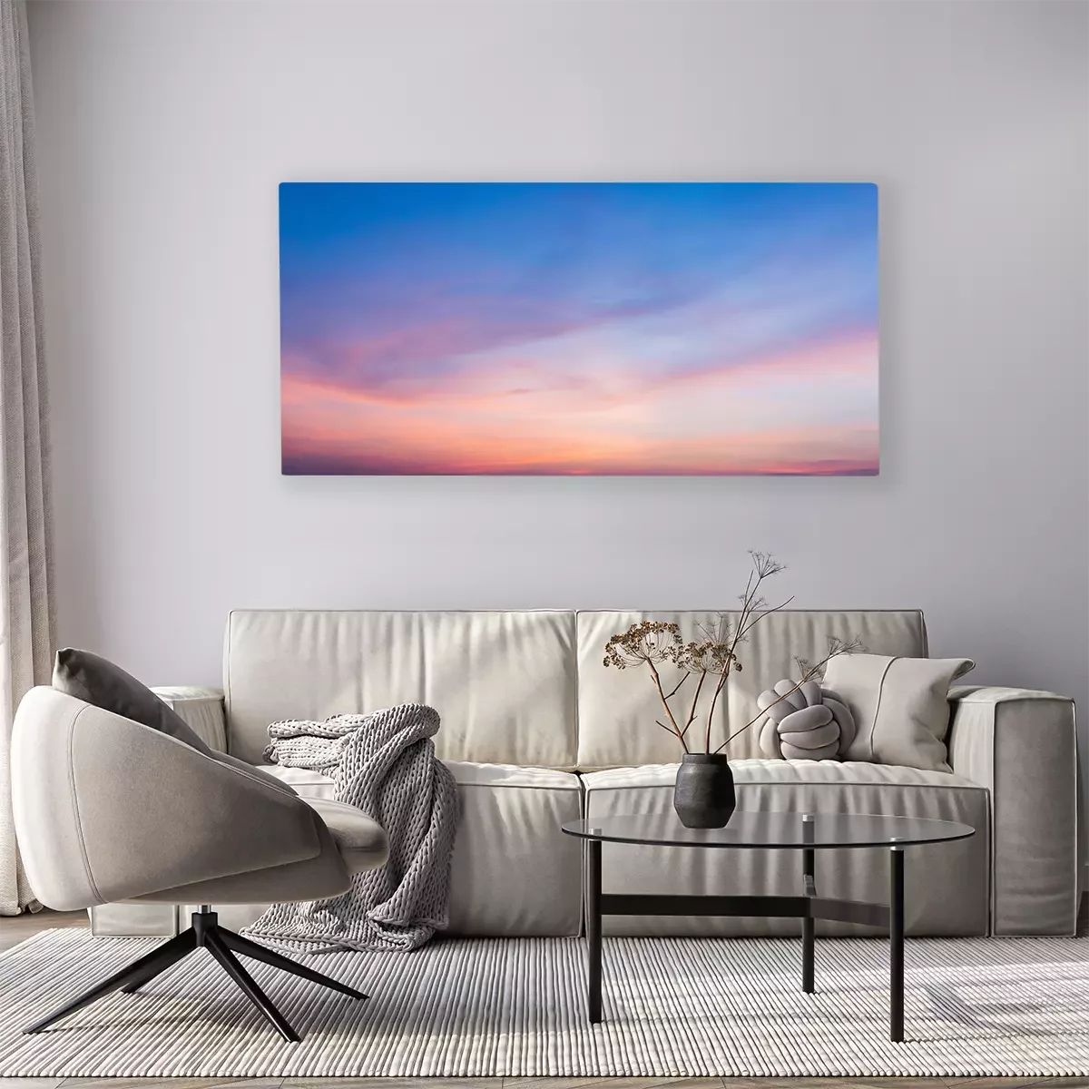 De print wordt aangebracht op hoogwaardig canvas dat op een schildersweefgetouw (spieraam) wordt gespannen. Omdat de print de zijranden bedekt, hoeft het ontwerp niet met een extra kader te worden omlijst. Wij raden ook composities aan die uit meerdere foto's bestaan en zo een coherente compositie vormen.