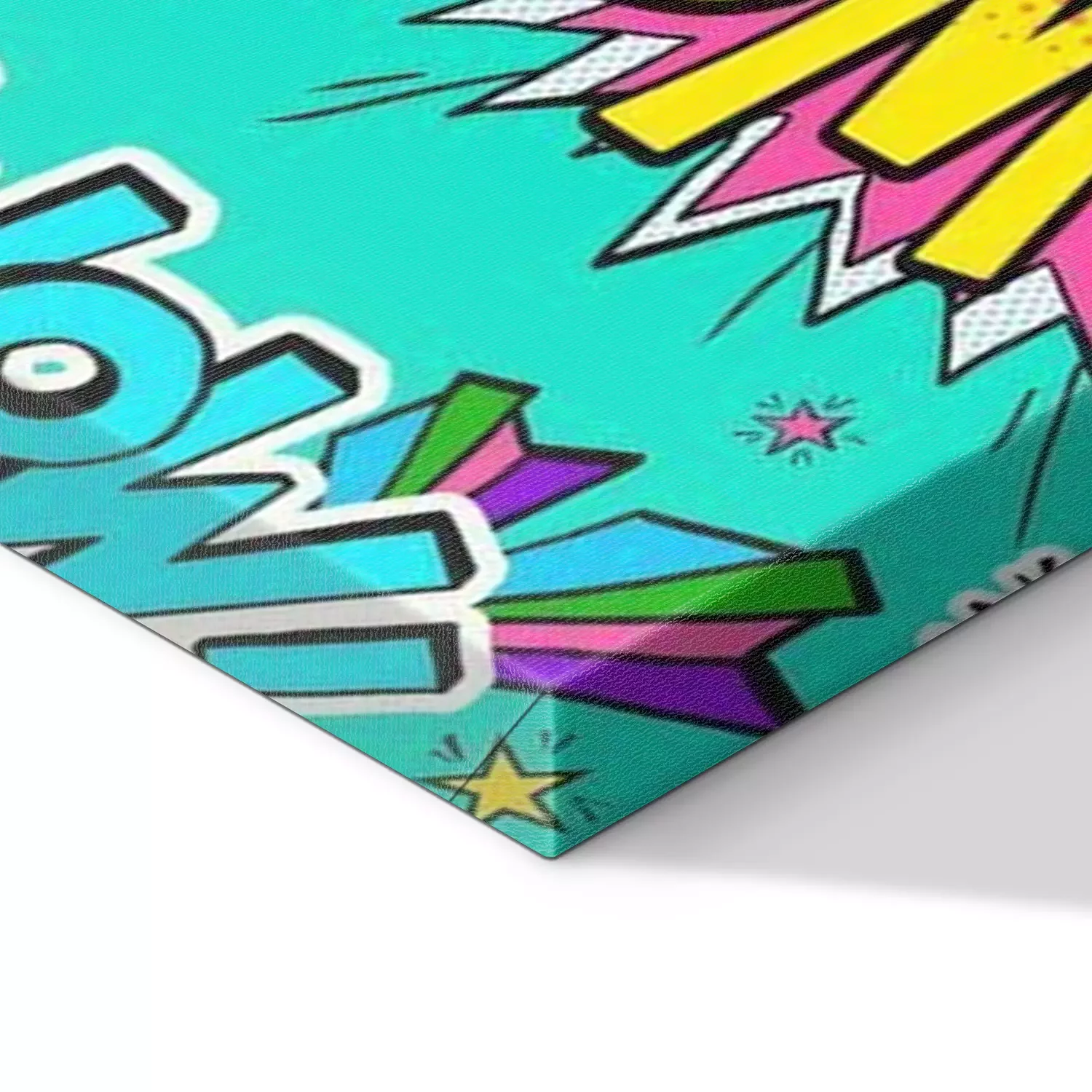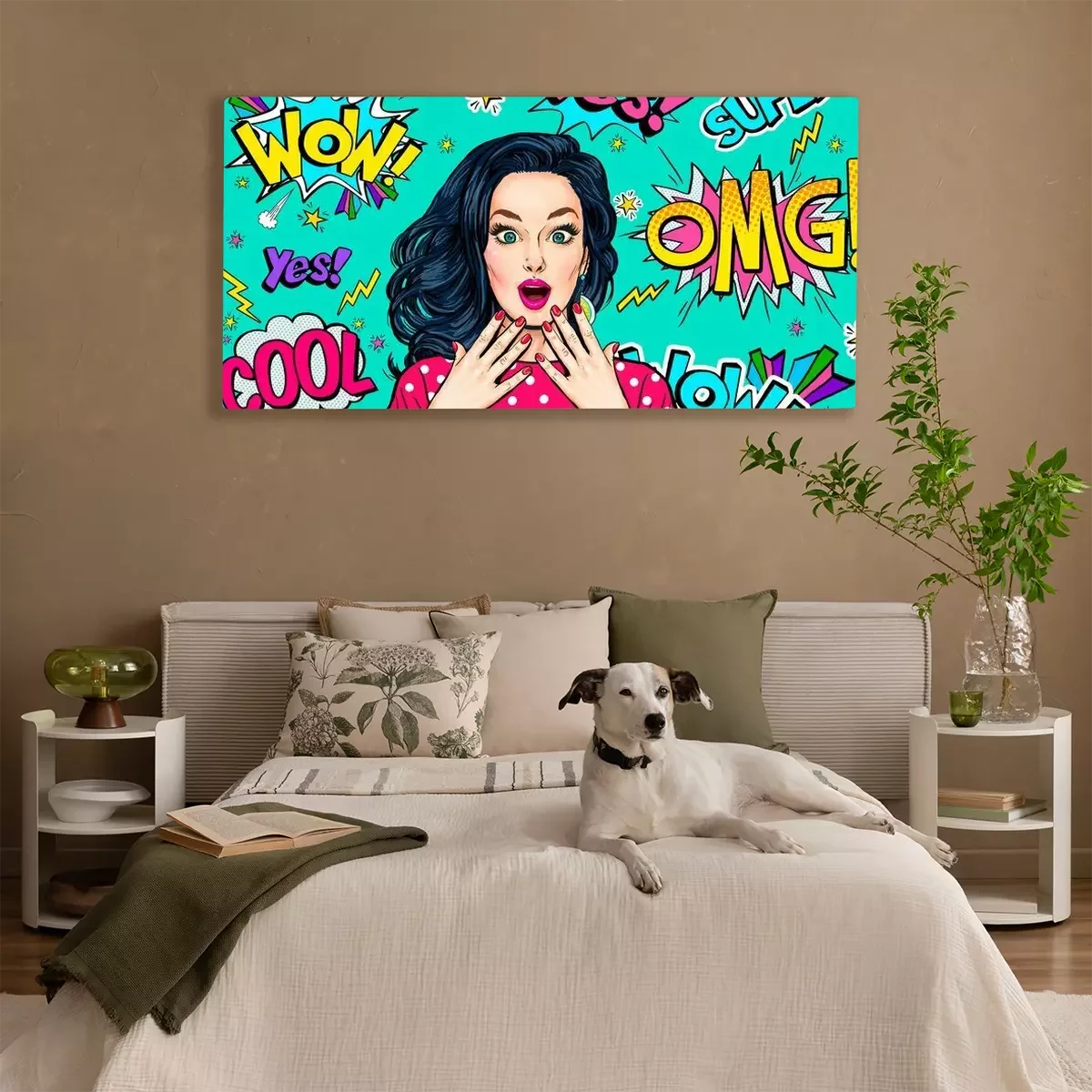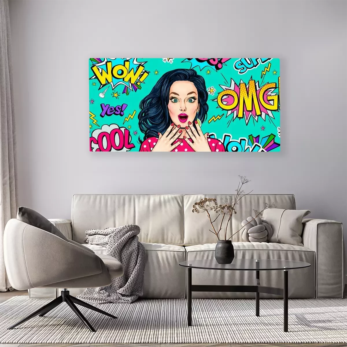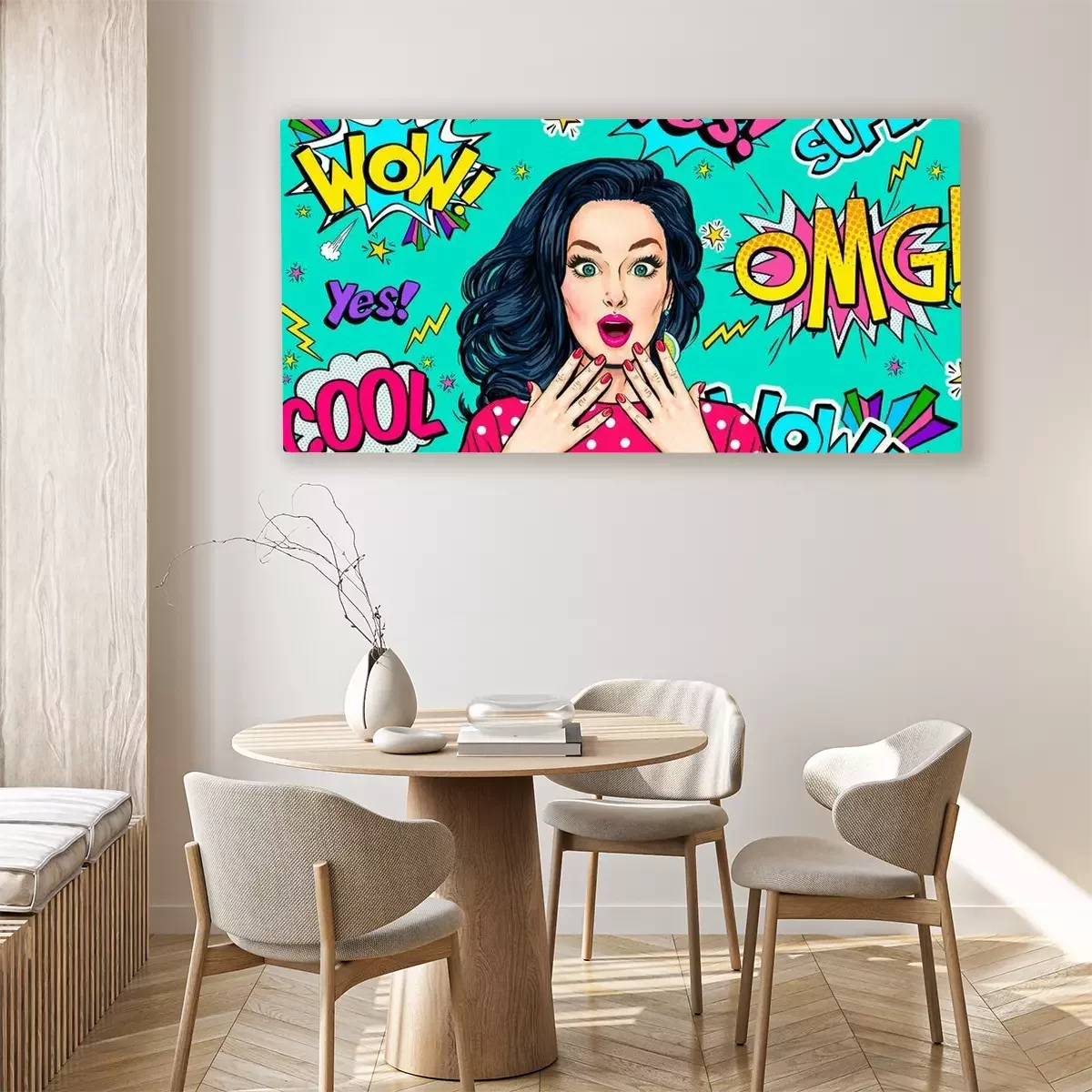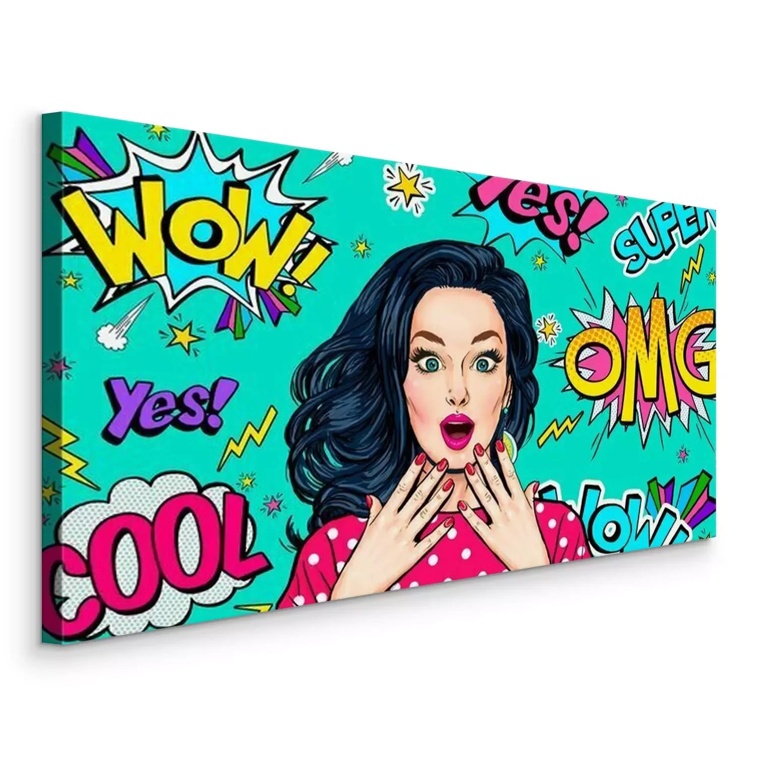 Canvas Surprised  woman on Pop art  background . Advertising poster or party invitation with sexy club girl with open mouth in comic style. Presenting your product. Expressive facial expressions