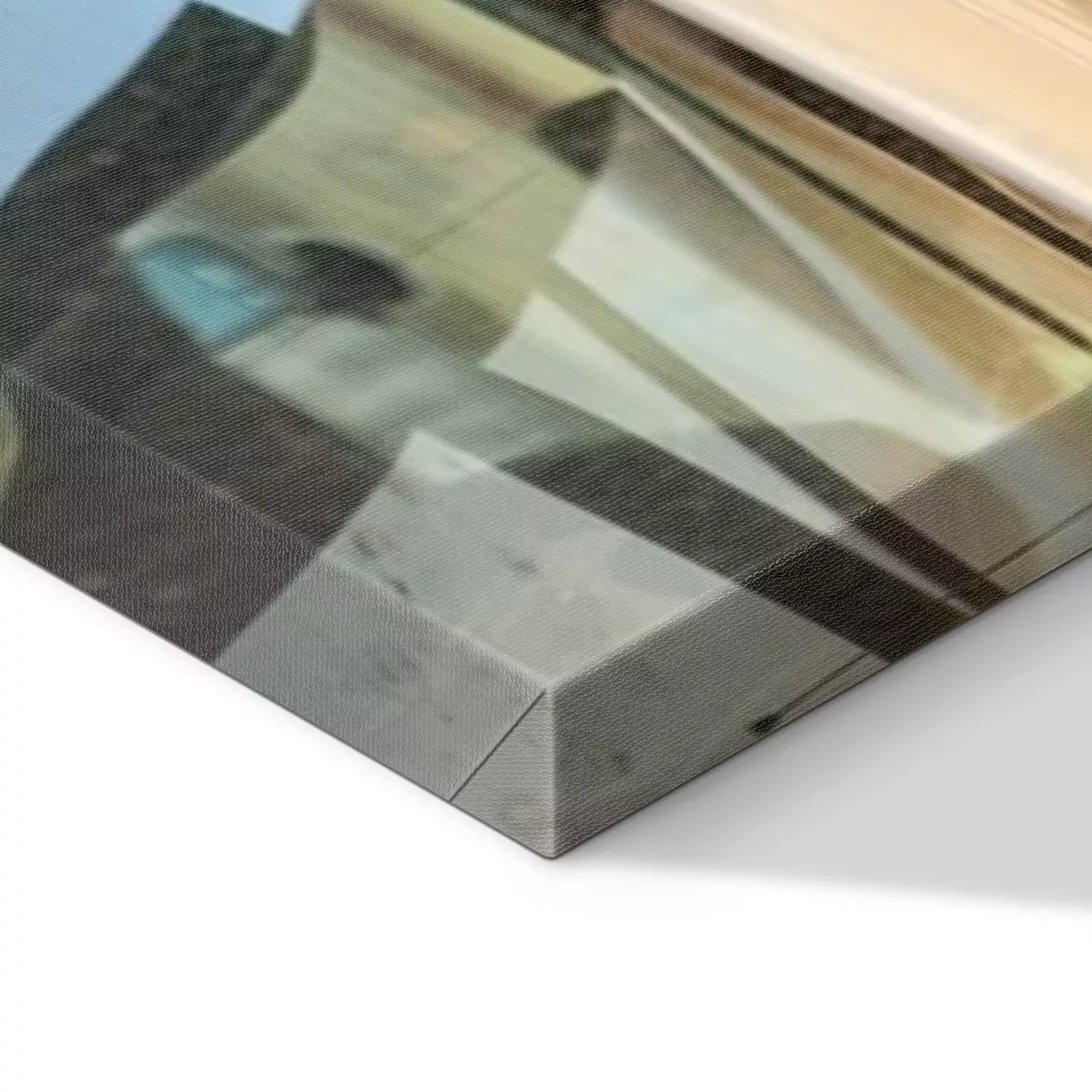 De print wordt aangebracht op hoogwaardig canvas dat op een schildersweefgetouw (spieraam) wordt gespannen. Omdat de print de zijranden bedekt, hoeft het ontwerp niet met een extra kader te worden omlijst. Wij raden ook composities aan die uit meerdere foto's bestaan en zo een coherente compositie vormen.