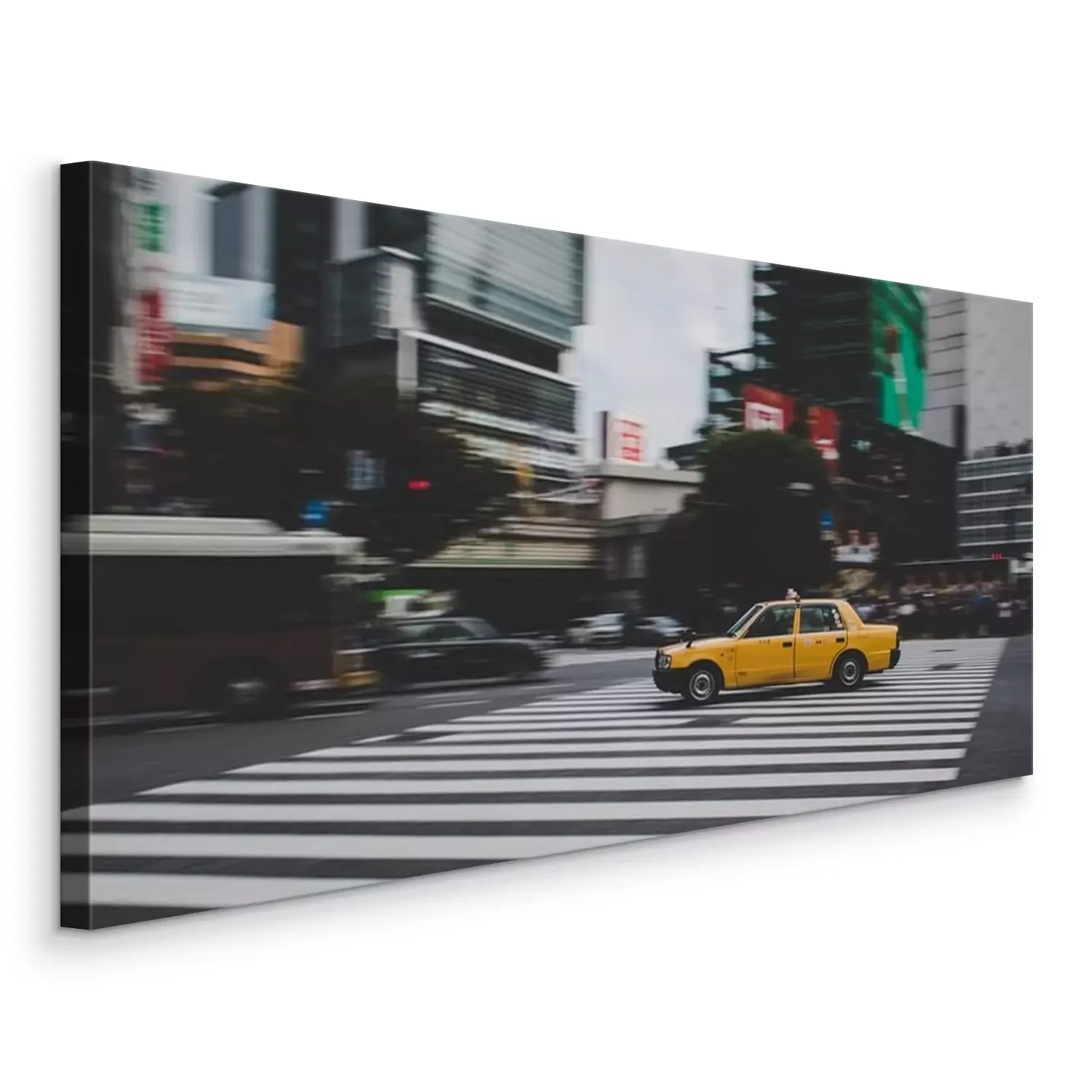 Canvas Taxi speeding across Shibuya crossing in Tokyo Japan
