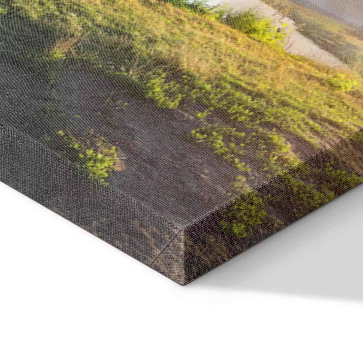 De print wordt aangebracht op hoogwaardig canvas dat op een schildersweefgetouw (spieraam) wordt gespannen. Omdat de print de zijranden bedekt, hoeft het ontwerp niet met een extra kader te worden omlijst. Wij raden ook composities aan die uit meerdere foto's bestaan en zo een coherente compositie vormen.
