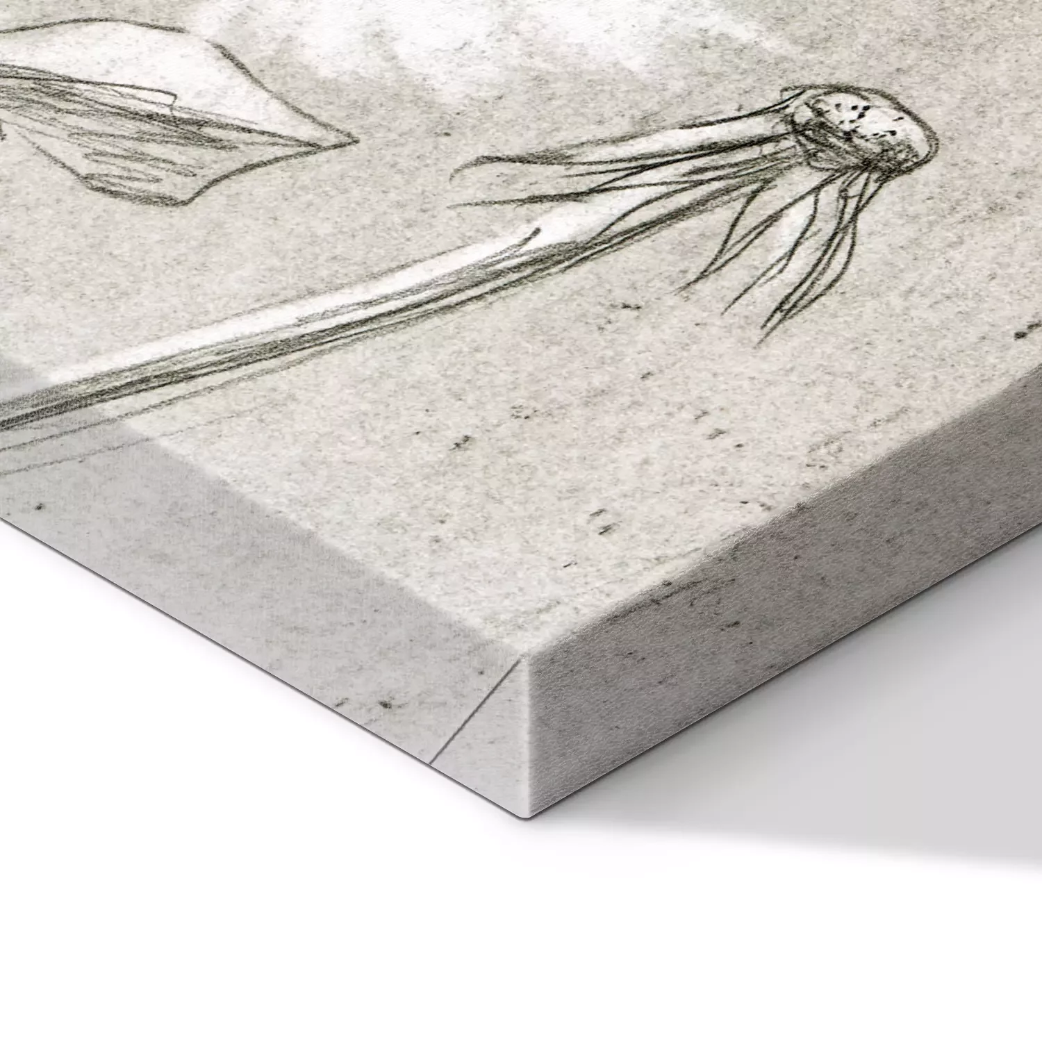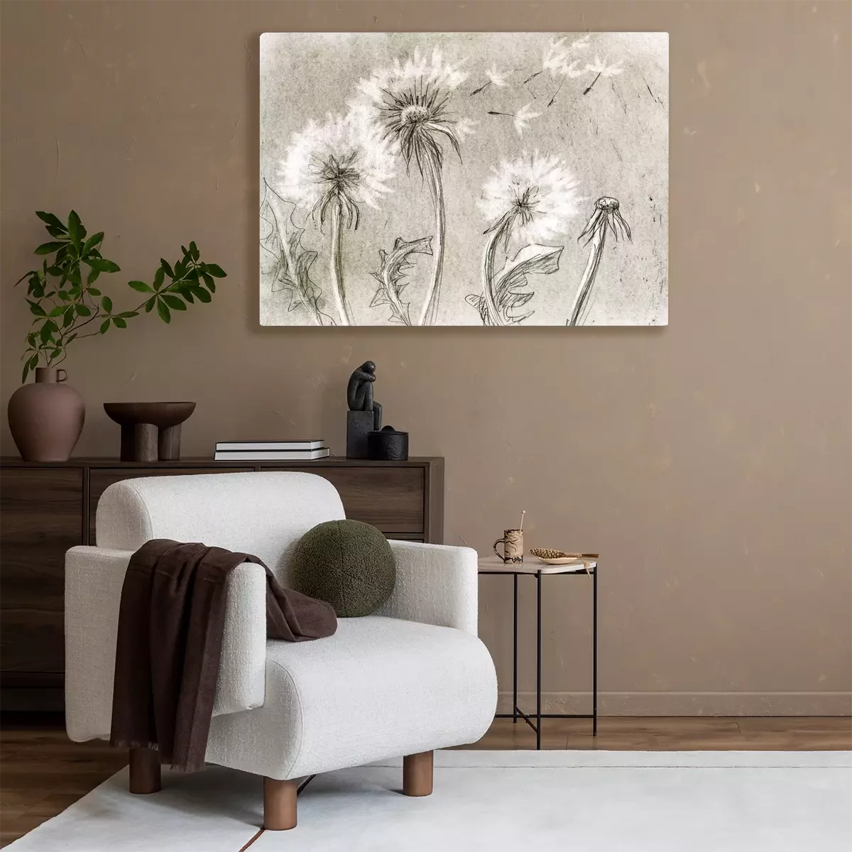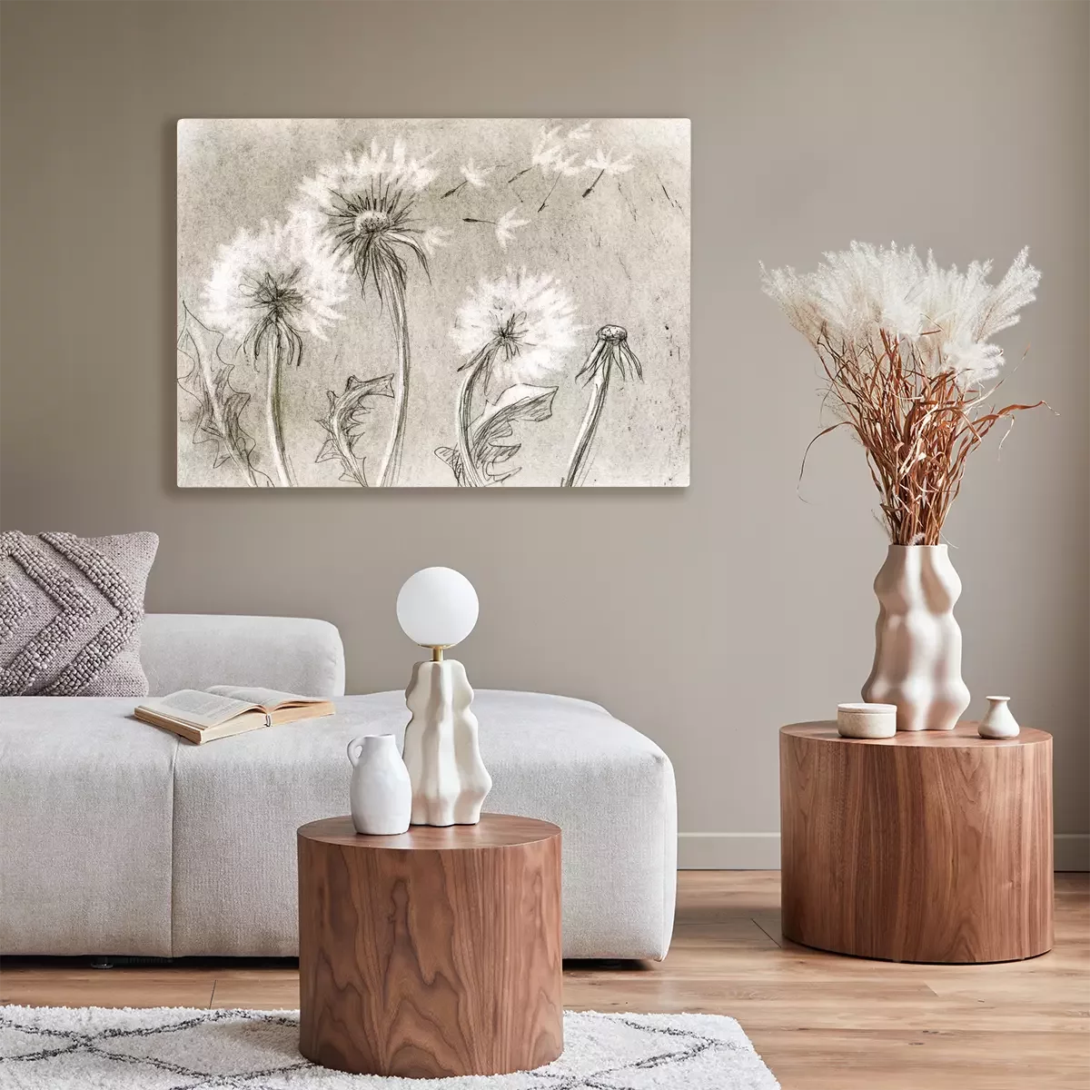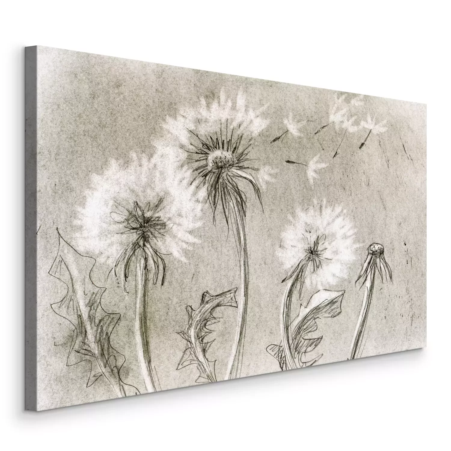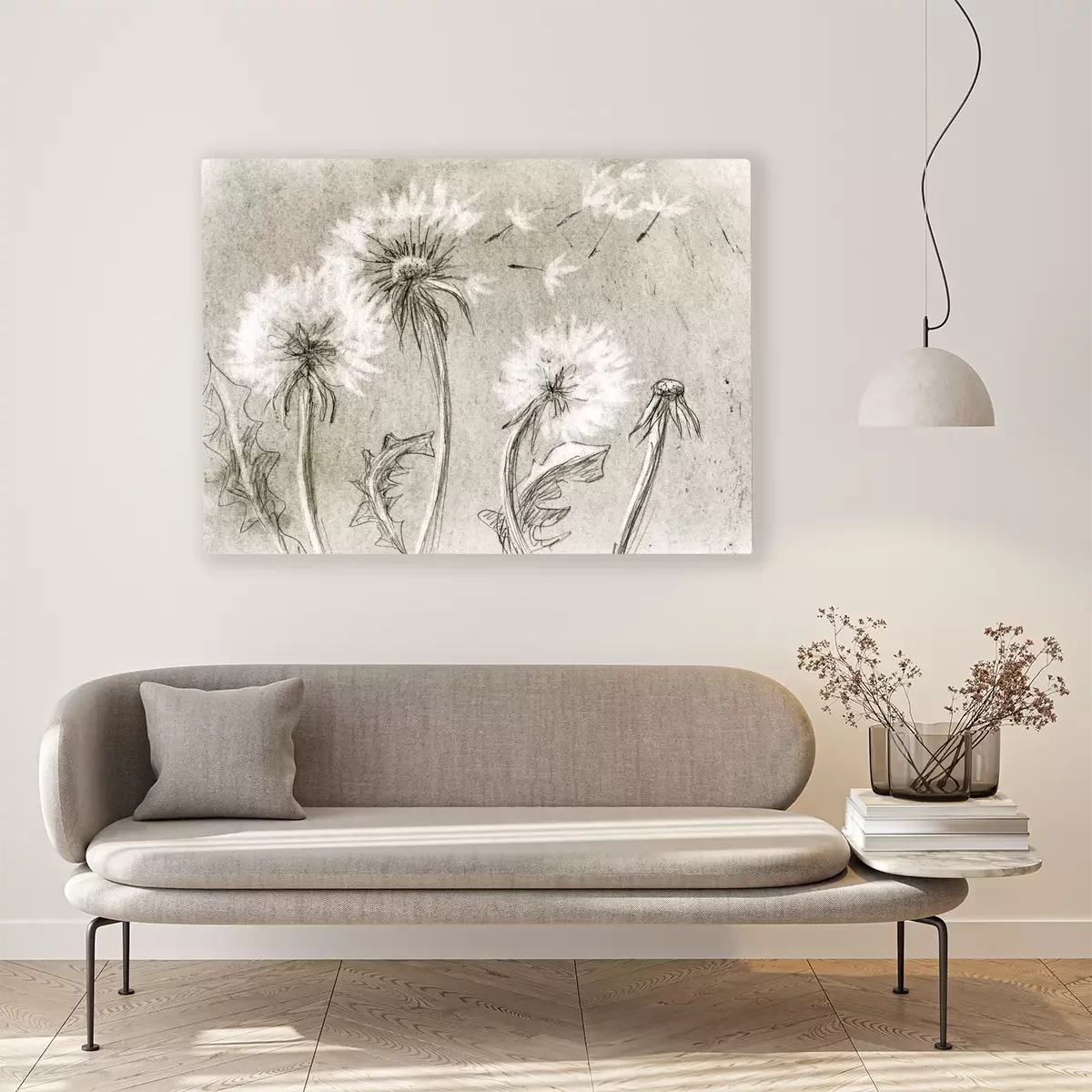 Tekening van paardenbloemen met wegvliegende zaden in grijstinten