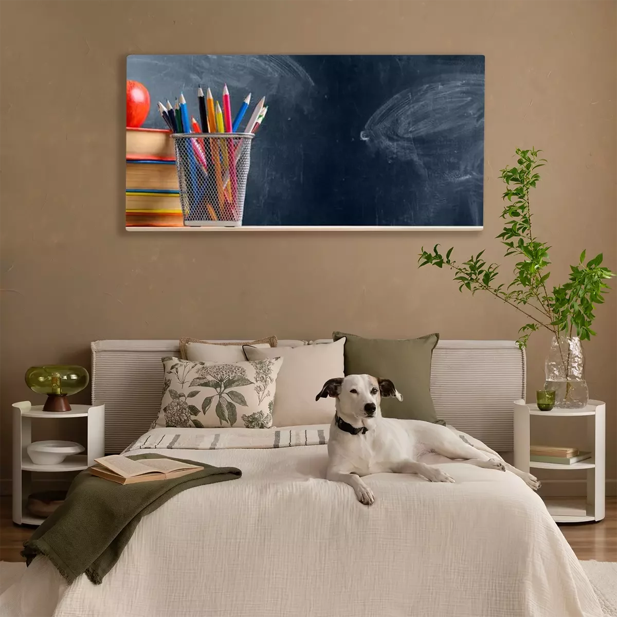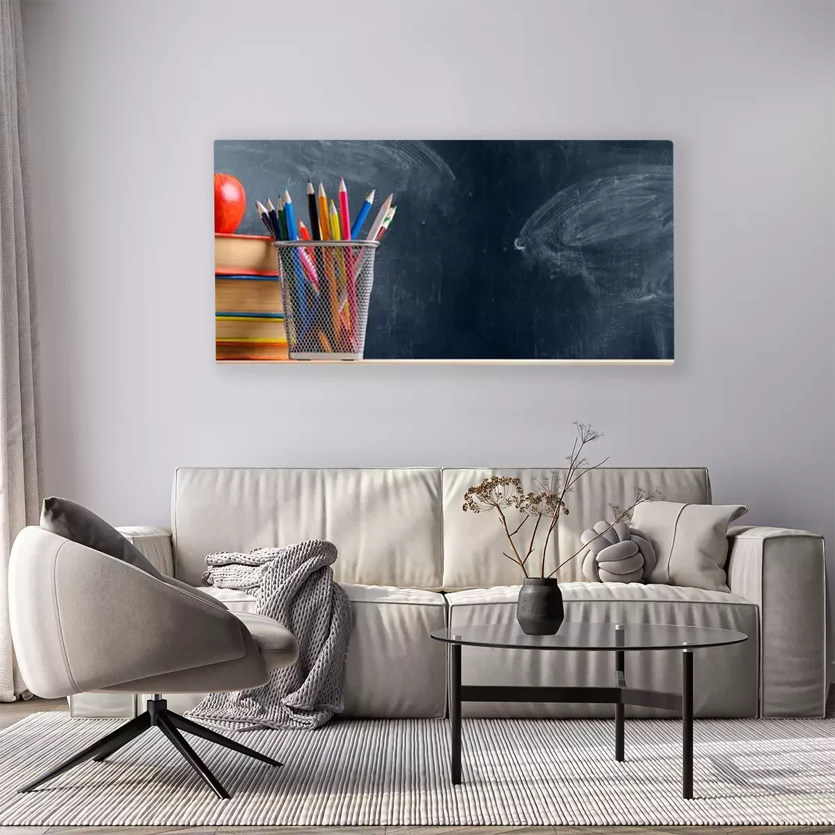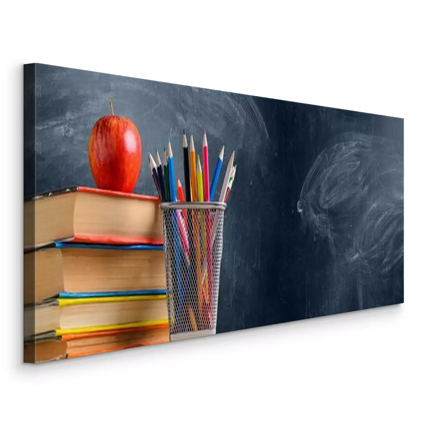 Canvas Terug naar school. Accessoires, boeken en verse appel tegen bord