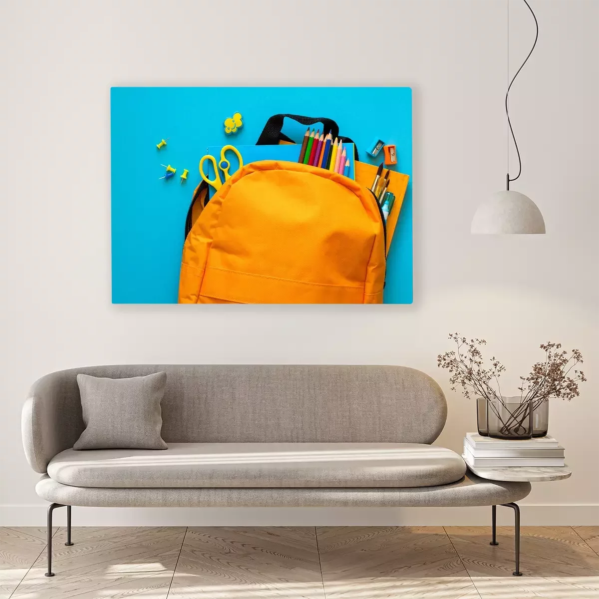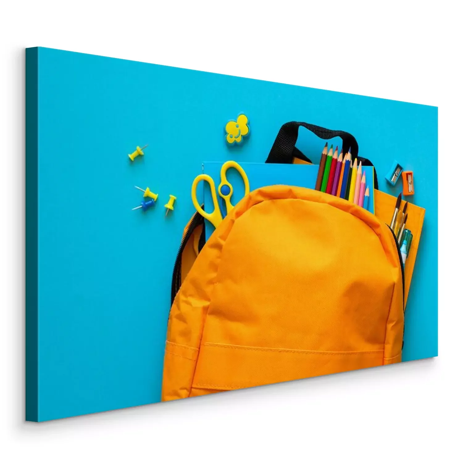 Canvas Terug naar school-concept. Rugzak met schoolbenodigdheden. Bovenaanzicht. Ruimte kopiëren