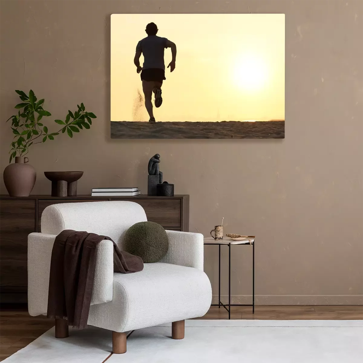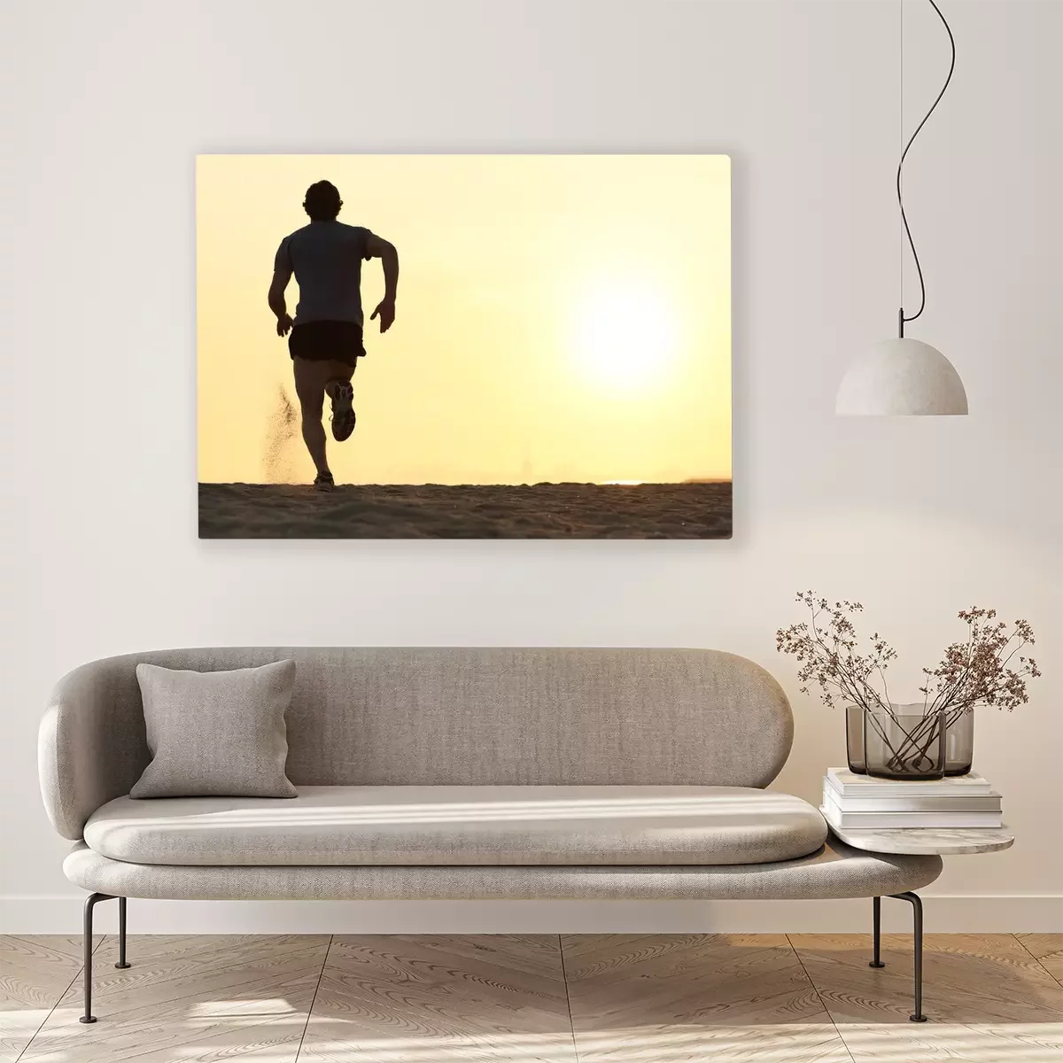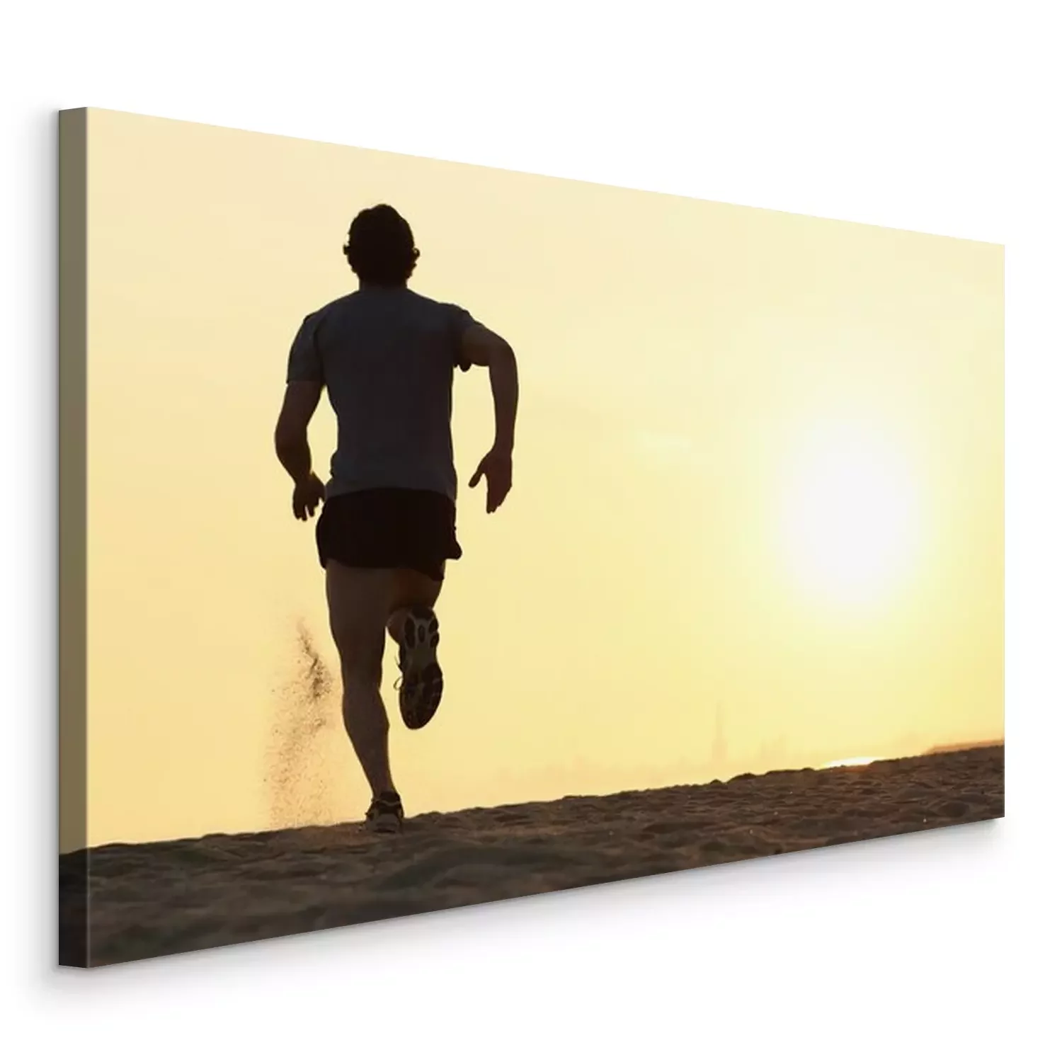 Canvas: Terug oog silhouet van een loper man lopen op het strand